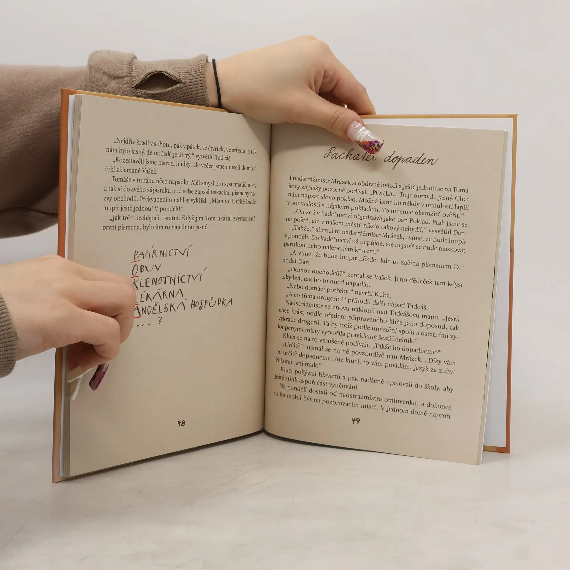 Dlouho se zdálo, že ve městě je klid, ale najednou se tady krade! A nezůstane u jednoho vloupání, k loupeži už došlo v drogerii, v hospůdce, v lékárně, v obuvi, v klenotnictví a nakonec nebylo ušetřeno ani papírnictví. Policie si neví rady, podezřelých je mnoho. Ověřená detektivní parta - Dan, Tadeáš, Kuba, Tom a Vašek - hledají souvislosti případů tam, kde by je nikdo nehledal - v kadeřnictví. Zajímá tě, kdo krade? Předběhnou kluci policii? Čti, přemýšlej, odpovídej na kontrolní otázky a dočkáš se nečekaného rozuzlení. I tentokrát ti v pátrání pomohou vtipné ilustrace Markéty Vydrové.