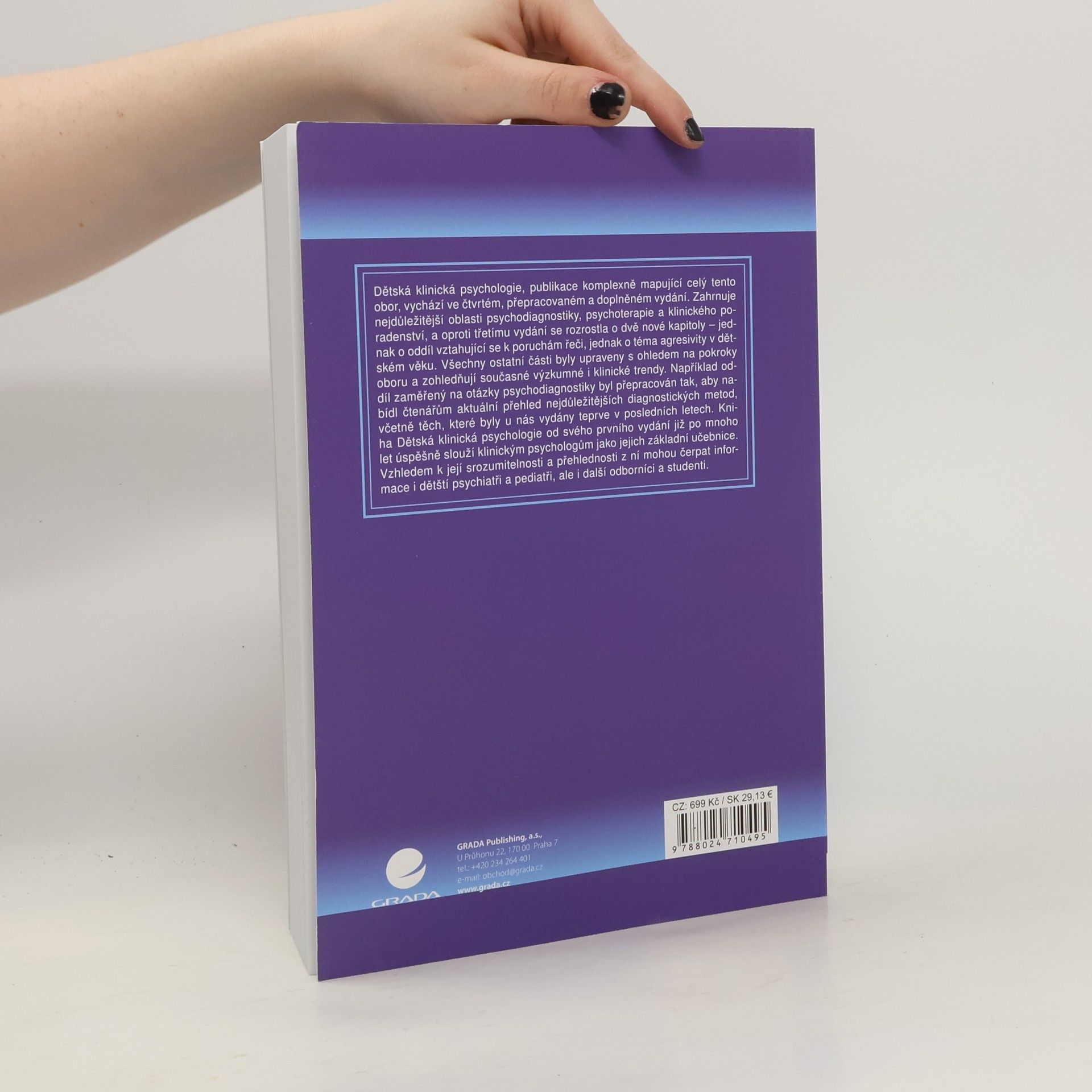 Dětská klinická psychologie, publikace komplexně mapující celý tento obor, vychází ve čtvrtém přepracovaném a doplněném vydání. Zahrnuje nejdůležitější oblasti psychodiagnostiky, psychoterapie a klinického poradenství, a oproti třetímu vydání se rozrostla o dvě nové kapitoly – jednak o oddíl vztahující se k poruchám řeči, jednak o téma agresivity v dětském věku. Všechny ostatní části byly upraveny s ohledem na pokroky oboru a zohledňují současné výzkumné i klinické trendy. Například oddíl zaměřený na otázky psychodiagnostiky byl přepracován tak, aby nabídl čtenářům aktuální přehled nejdůležitějších diagnostických metod, včetně těch, které byly u nás vydány teprve v posledních letech. Kniha Dětská klinická psychologie od svého prvního vydání již celých 14 let úspěšně slouží klinickým psychologům jako jejich základní učebnice. Vzhledem k její srozumitelnosti a přehlednosti z ní mohou čerpat informace i dětští psychiatři a pediatři, ale i další odborníci a studenti.