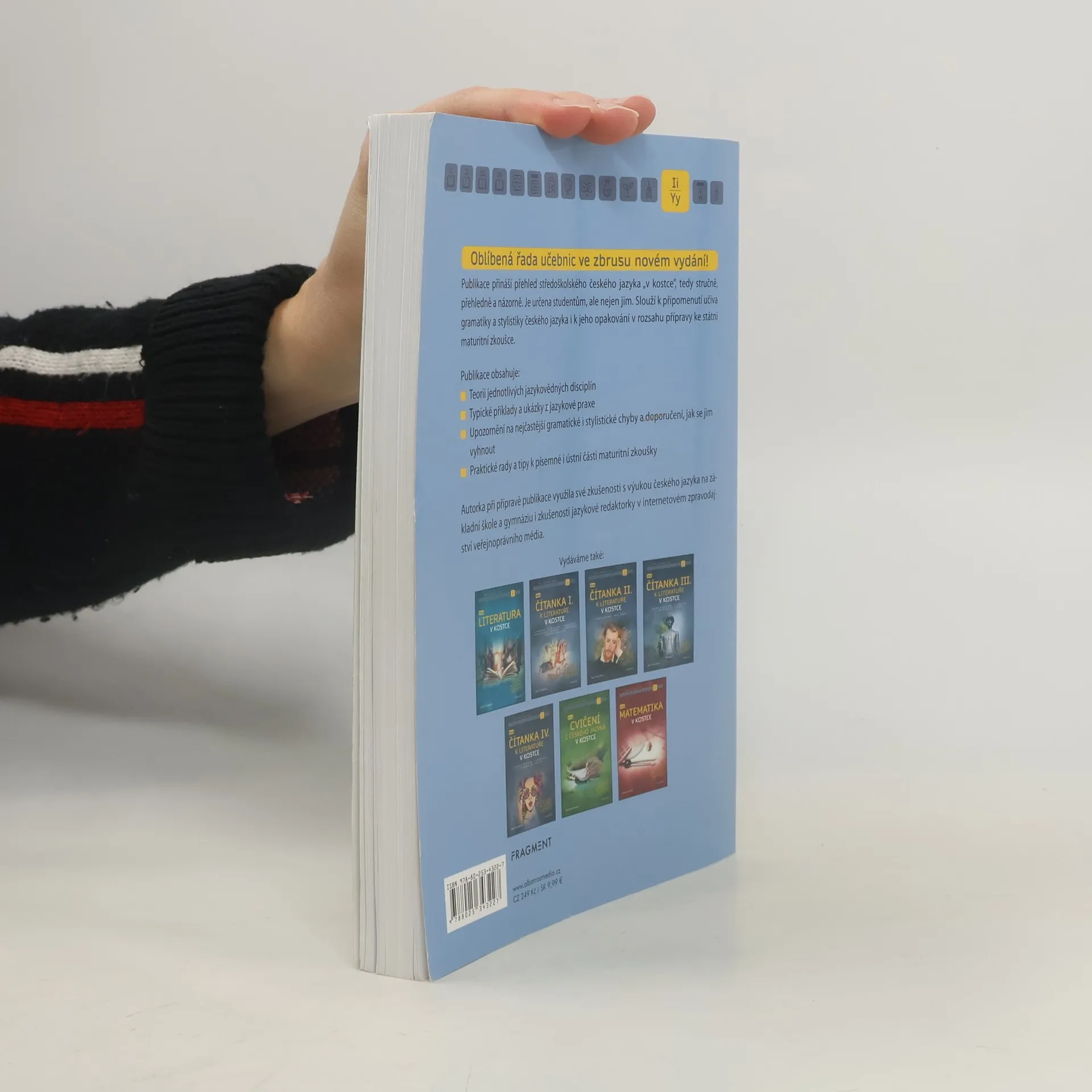 Oblíbená řada učebnic ve zbrusu novém přepracovaném vydání! Publikace přináší přehled středoškolského českého jazyka “v kostce”, tedy stručně, přehledně a názorně. Je určena studentům, ale nejen jim. Slouží k připomenutí učiva gramatiky a stylistiky českého jazyka i k jeho opakování v rozsahu přípravy ke státní maturitní zkoušce. Publikace obsahuje: • Teorii jednotlivých jazykovědných disciplín • Typické příklady a ukázky z jazykové praxe • Upozornění na nejčastější gramatické i stylistické chyby a doporučení, jak se jim vyhnout • Praktické rady a tipy k písemné i ústní části maturitní zkoušky Autorka při přípravě publikace využila své zkušenosti s výukou českého jazyka na základní škole a gymnáziu i zkušenosti jazykové redaktorky v internetovém zpravodajství veřejnoprávního média.