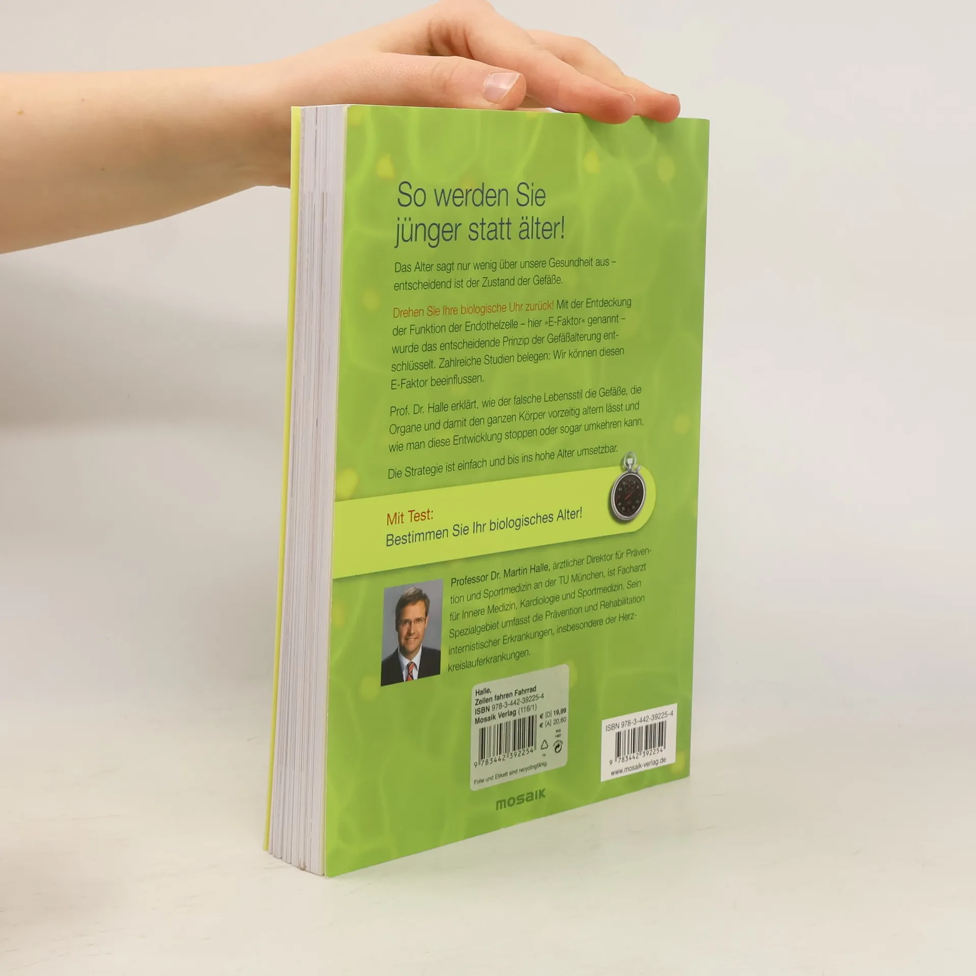 Vom führenden Präventionsmediziner der TU München Sind Sie jünger, als Sie denken? Das Alter spiegelt nur bedingt die körperliche und geistige Fitness wider und sagt schon gar nichts über unsere Gesundheit oder gar Lebenserwartung aus. Schlüsselfaktor für Gesundheit bis ins hohe Alter ist der Zustand unserer Gefäße. Sie sind zentral verantwortlich für gute und schlechte Versorgung, für „junge“ und „alte“ Organe. Prof. Dr. Halle erklärt, wie der Lebensstil die Gefäße und damit den ganzen Körper vorzeitig altern lässt bzw. jung erhält. Er erklärt die Zusammenhänge, gibt konkrete Hinweise für den Alltag und zeigt, wie wir die Zellalterung beeinflussen können. Auch als Taschenbuch unter dem Titel „Jung bleiben mit gesunden Gefäßen“ erhältlich. Ausstattung: 4-farbig, ca. 60 farb. Abbildungen