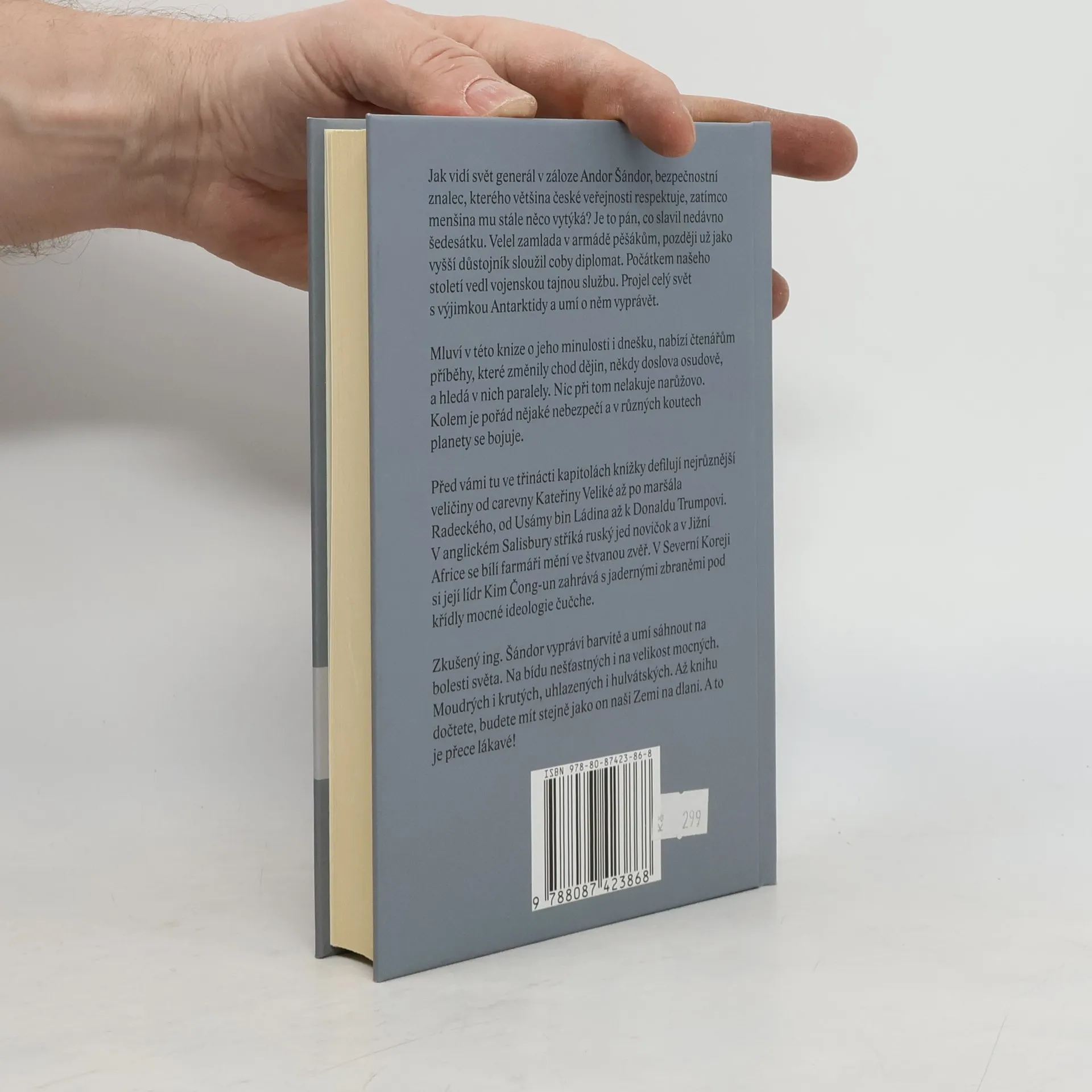 Jak vidí svět generál v záloze Andor Šándor, bezpečnostní znalec, kterého většina české veřejnosti respektuje, zatímco menšina mu stále něco vytýká? Je to pán, co slavil nedávno šedesátku. Velel zamlada v armádě pěšákům, později už jako vyšší důstojník sloužil coby diplomat. Počátkem našeho století vedl vojenskou tajnou službu. Projel celý svět s výjimkou Antarktidy a umí o něm vyprávět. Mluví v této knize o jeho minulosti i dnešku, nabízí čtenářům příběhy, které změnily chod dějin, někdy doslova osudově, a hledá v nich paralely. Nic při tom nelakuje narůžovo. Kolem je pořád nějaké nebezpečí a v různých koutech planety se bojuje. Před vámi tu ve třinácti kapitolách knížky defilují nejrůznější veličiny od carevny Kateřiny Veliké až po maršála Radeckého, od Usámy bin Ládina až k Donaldu Trumpovi. V anglickém Salisbury stříká ruský jed novičok a v Jižní Africe se bílí farmáři mění ve štvanou zvěř. V Severní Koreji si její lídr Kim Čong-un zahrává s jadernými zbraněmi pod křídly mocné ideologie čučche. Zkušený ing. Šándor vypráví barvitě a umí sáhnout na bolesti světa. Na bídu nešťastných i na velikost mocných. Moudrých i krutých, uhlazených i hulvátských. Až knihu dočtete, budete mít stejně jako on naši Zemi na dlani. A to je přece lákavé!