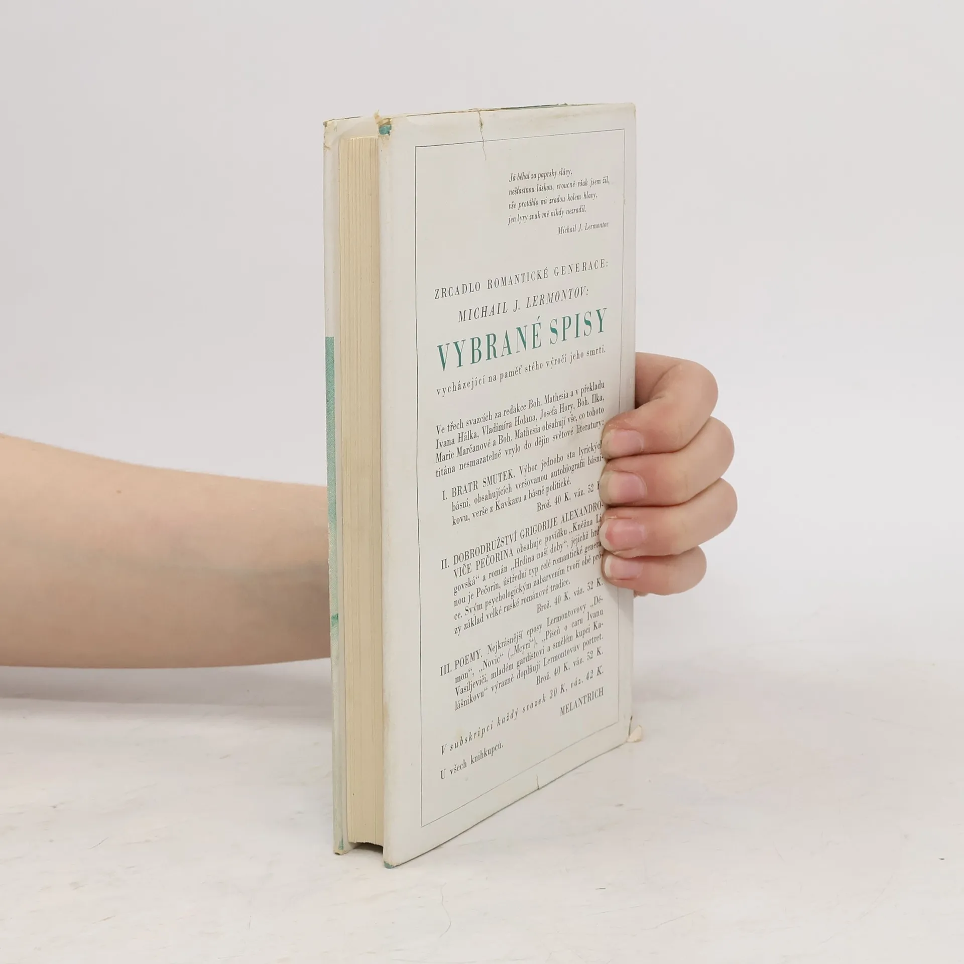 Výbor z básní klasika ruské romatické literatury v překladech Emanuela Frynty a Josefa Hory.Michail Jurjevič Lermontov (1814-1841) byl ruským básníkem, dramatikem, prozaikem a především nespoutaným romantikem tělem i duší. První poémy psal na internátě ve čtrnácti letech a v osmnácti měl na kontě již přes dvě stovky básní a tři dramata. Z univerzity byl ale vyloučen, a tak se dal k husarům. Jeho literárním vzorem byl Puškin, který roku 1837 zemřel na následky zranění utrpěných v souboji. Lermontov mu věnoval báseň Na smrt Puškinovu, jíž si proti sobě popudil samotného cara Mikuláše I., a byl vykázán na Kavkaz. Po návratu pokračoval ve vojenské službě, ovšem nepřestával literárně tvořit. Možná tušil, že nemá příliš času nazbyt. Jako pravý romantický hrdina zemřel mlád, ve věku 26 let. Ironií je, že skonal stejně jako jeho vzor, v souboji.Zanechal po sobě úctyhodné dědictví čítající stovky básní a poém, tři romány a šest dramat. mezi jeho nejznámější díla patří epická poéma Démon, s níž se zařadil mezi velikány romantické tvorby, dále drama Maškaráda a román Hrdina naší doby.