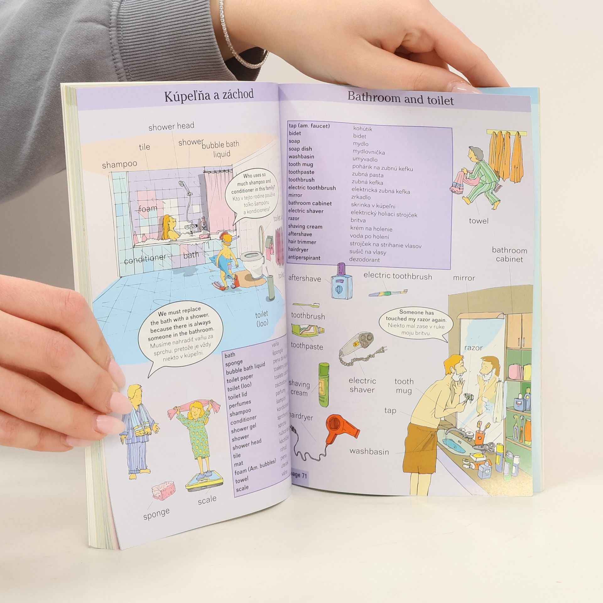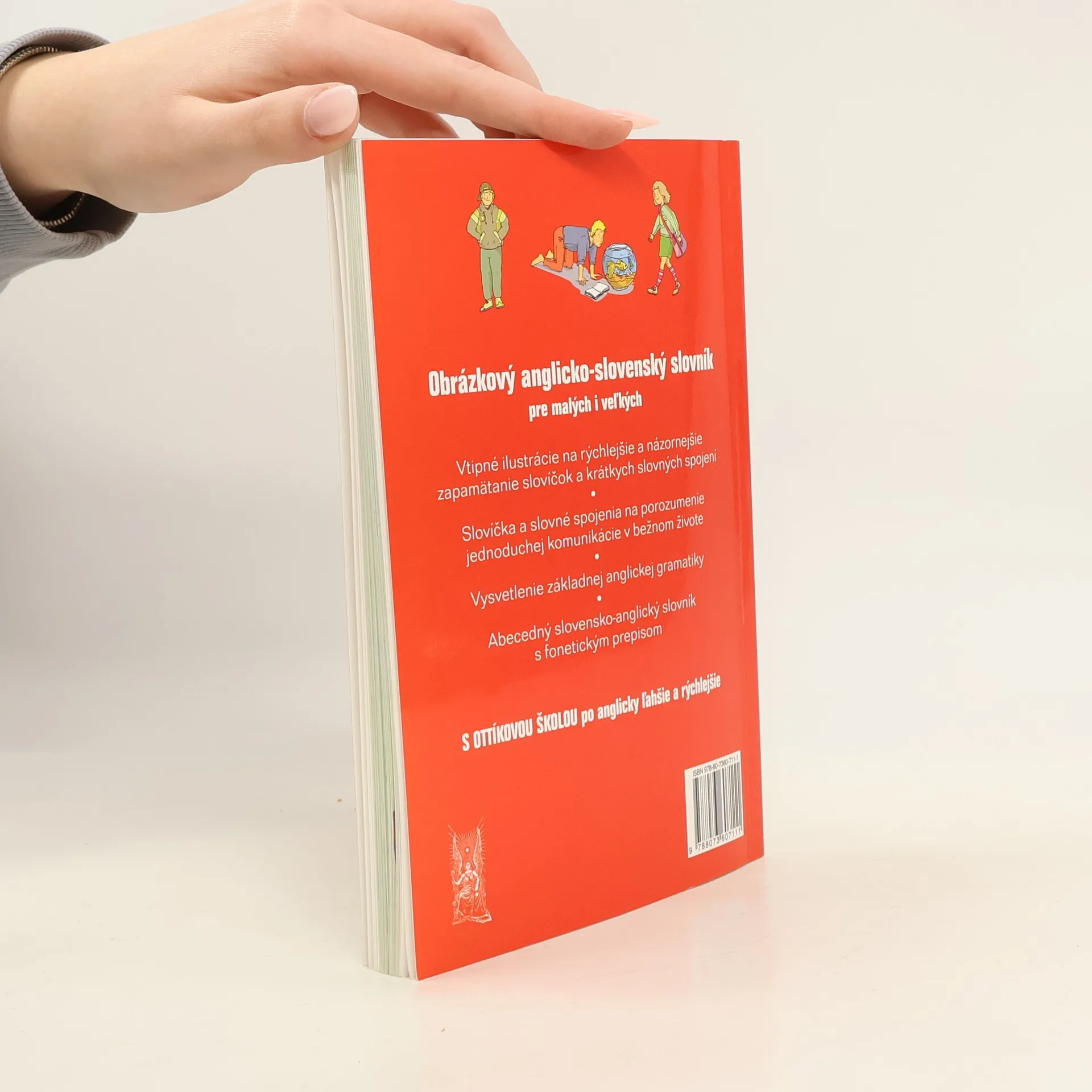 V knihe nájdeme vtipné ilustrácie na rýchlejšie a názornejšie zapamätávanie slovíčok a krátkych slovných spojení na témy: Pozdravy, lúčenie, nadviazanie rozhovoru, Zvuky, ktoré ľudia vydávajú a gestá, Ľudské telo, Vzhľad: stavba tela, Tvár, Účesy, Zdravie a choroba, Povahy: znamenia zverokruhu, Strom života, Rodinné oslavy a národné tradície, Môj deň, Nálady, Jedlá a nápoje, Šaty, Tvar, podoba, Farby, Smer a umiestnenie, Školy, Počítače a internet, Zamestnania, V práci, Zábava a voľný čas, Na dovolenke, na prázdninách, Športy, Rodinný dom, Domáce práce, V kuchyni, Obývačka, Moja izba, Kúpeľňa a záchod, Úprava bytu, Záhrada, Svet zvierat, Trhovisko: ovocie, zelenina, Obchod-supermarket, Banka a pošta, Reštaurácia, Na ulici, Auto, Na stanici, Na letisku, Krajina, Počasie, ročné obdobia, podnebie, História: budovy, Politika, Hudba, hudobné nástroje, Vesmír, Život-od narodenia po smrť, Vysnívané miesto.
