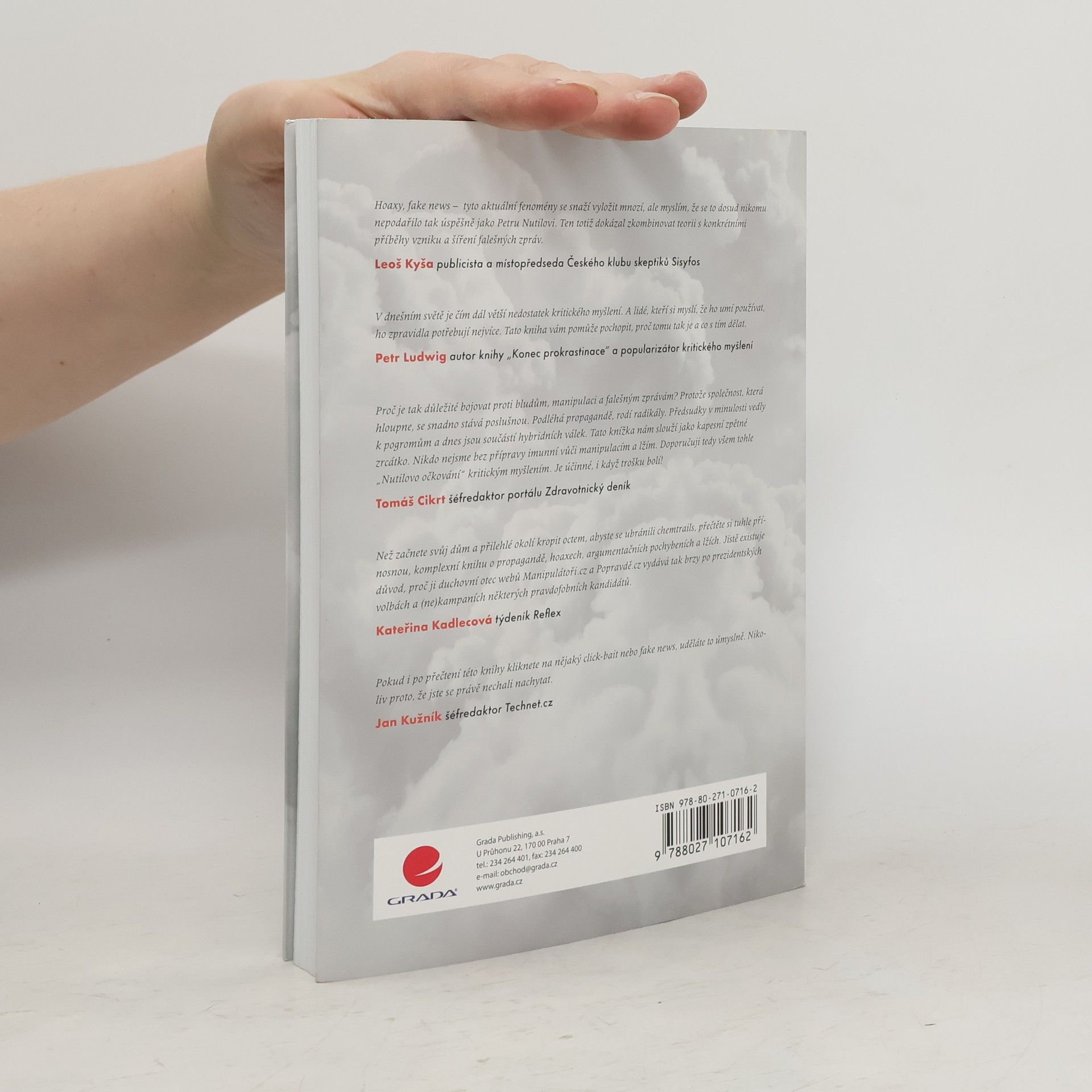 - Jak jsme manipulováni a nevíme o tom? - Co jsou to hoaxy? - Ukazují média svět takový, jaký skutečně je? - Proč nám politici lžou? - Co je to mediální gramotnost? - Proč je potřeba kritické myšlení? - A jak si s námi zahrává mozek? To jsou jen některé z aktuálních otázek, na které najdete odpovědi v této knize. Jejím autorem je spoluzakladatel webu manipulatori.cz, který se snaží podporovat nezávislé a kritické myšlení a odkrývat mediální lži. V první části knihy odhalíte zákonitosti našeho chování a rozhodování. Zjistíte, proč naše přání tak často formují budoucnost, pochopíte, jak nás ovlivňuje naše vlastní iracionalita, proč podléháme skupinové hlouposti a jak snadno se dopouštíme myšlenkových chyb. Druhá část knihy se věnuje žhavé současnosti. Zaměřuje se na běžně užívané argumentační fauly a na odhalení manipulativních a propagandistických postupů v politice i médiích. Poznáte zákulisí mediálního průmyslu a výroby zpráv i techniky, jak námi média mohou manipulovat. A v neposlední řadě porozumíte tomu, jak odhalovat falešné zprávy, poznat pravdu od lži a nepodlehnout konspiračnímu myšlení.