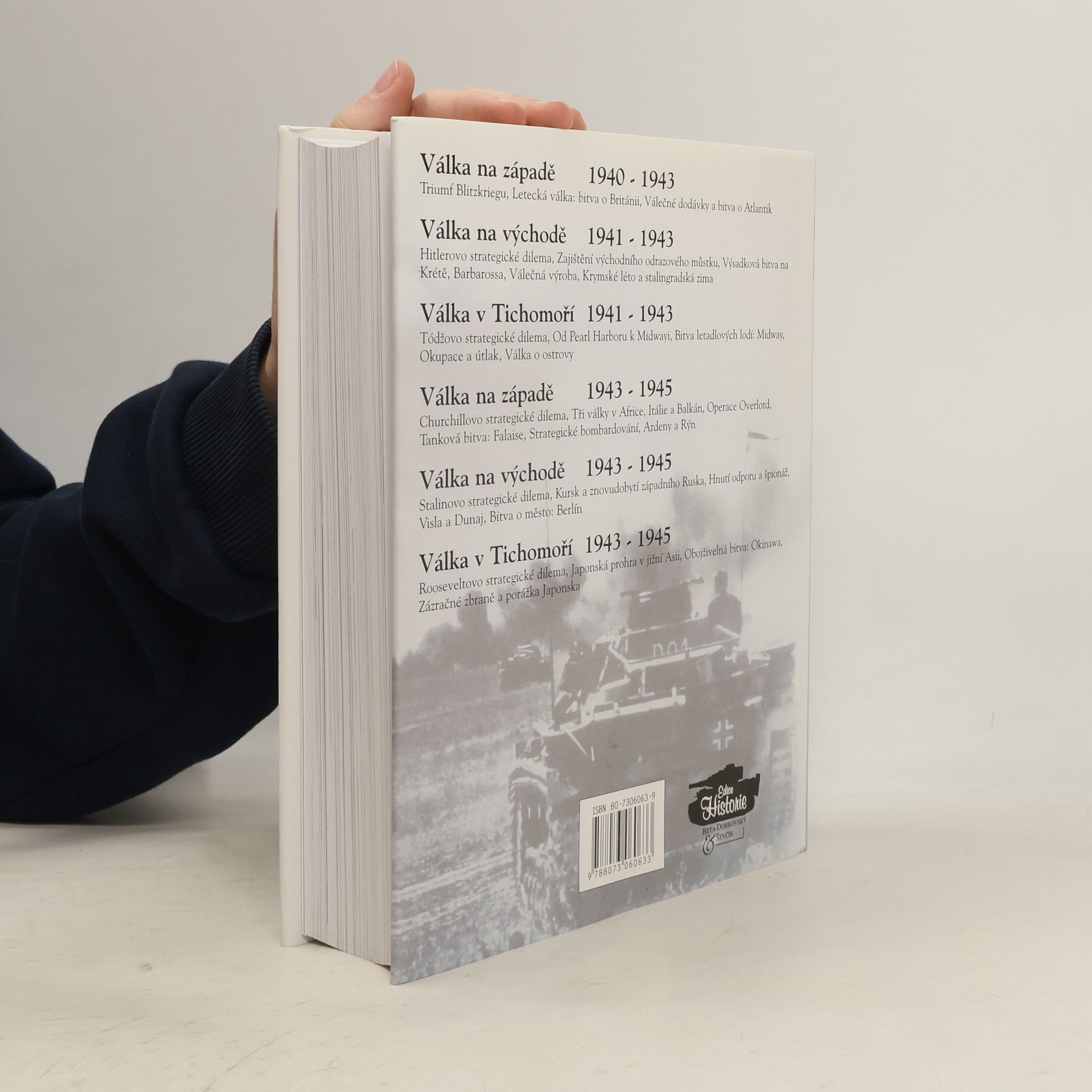 Kniha britského vojenského historika o dosud největším konfliktu v dějinách lidstva. Autor se rozohdl rozdělit příběh na čtyři části - popisnou a strategickou anylýzu, bitevní výjev a "téma dané válka" - ty pak využít v rámci všech šesti hlavních oddílů knihy. To jsou Válka na západě 1940-1943, Válka na východě 1941-1943, Válka v Tichomoří 1941-1943, Válka na západě 1943-1945, Válka na východě 1943-1945, Válka v Tichomoří 1943-1945. Úvod každého oddílů je věnován strategické analýze zaměřené na osobnost, která v příslušném období hrála největší roli. Postupně se zde tedy jedná o Hitlerovi, generálu Tódžovi, Churchillovi, Stalinovi a Roosveltovi. Oddíl dále obsahuje, kromě nezbytného popisu událostí, jak příslušné "téma války", tak odpovídající bitevní výjev. Každý z bitevních výjevů byl zvolen tak, aby ilustroval povahu specifické formy válečnictví, charakteristické pro ten určitý konflikt. Najdeme zde popis leteckých bojů, výsadkářského válečnictví, námořních bitev, tankových bitev, pouličních bojů či obojživelných válečných operací. V "tématech válka" získáme informace o válečné výrobě a zásobování, o životě v týlu, o okupaci a represáliích, o hnutí odporu, o špionáži či o tajných zbraních.