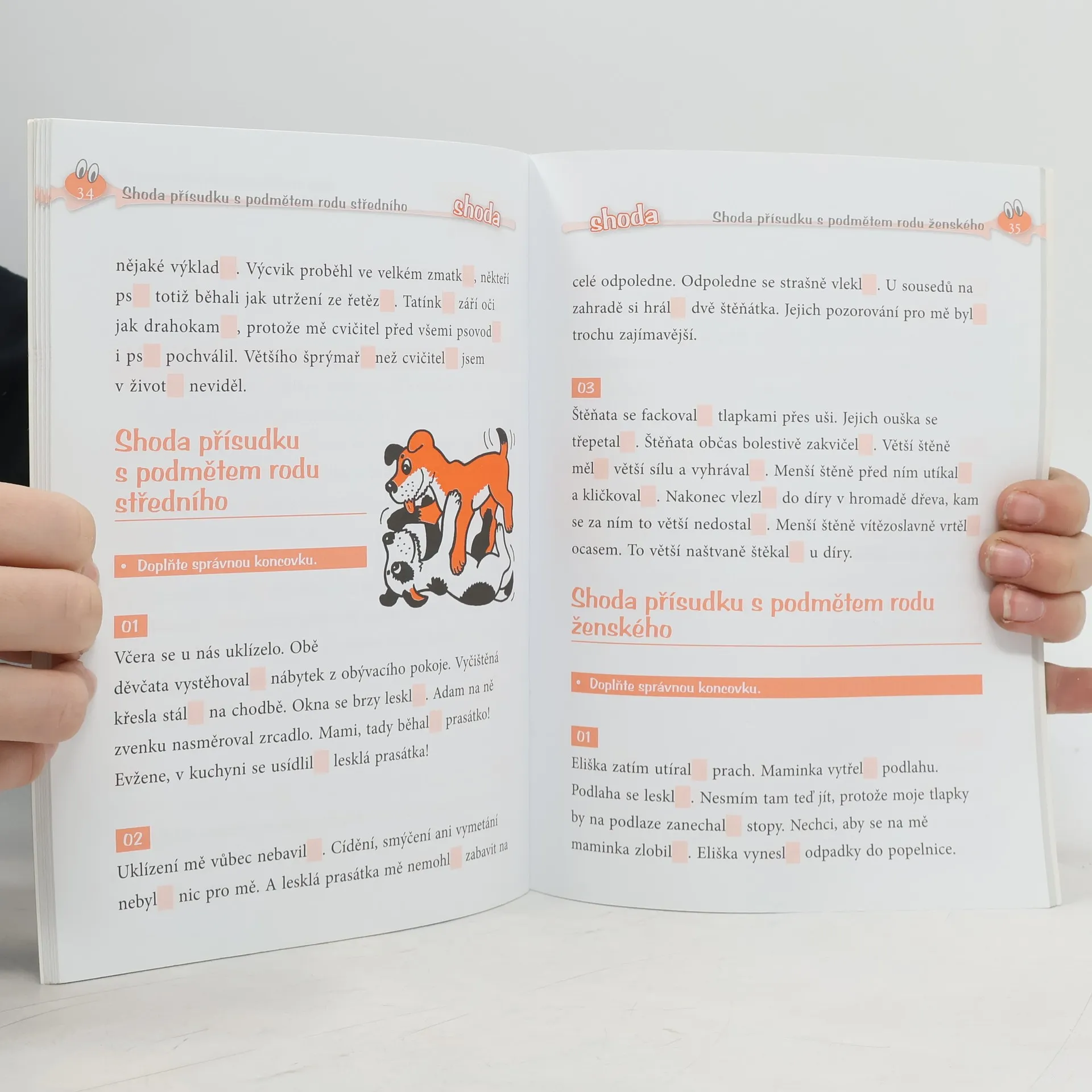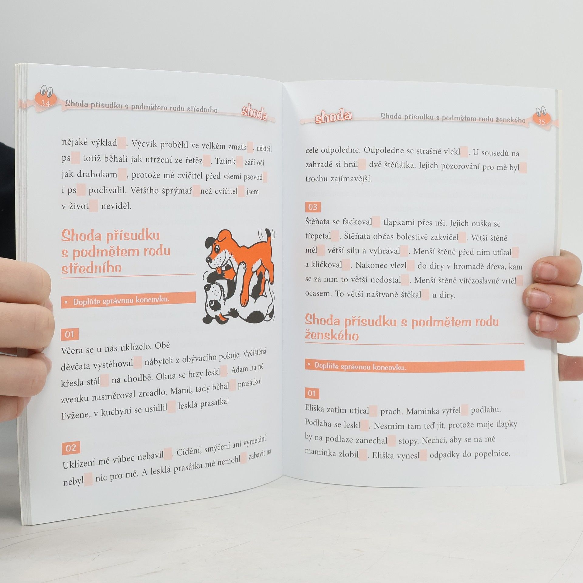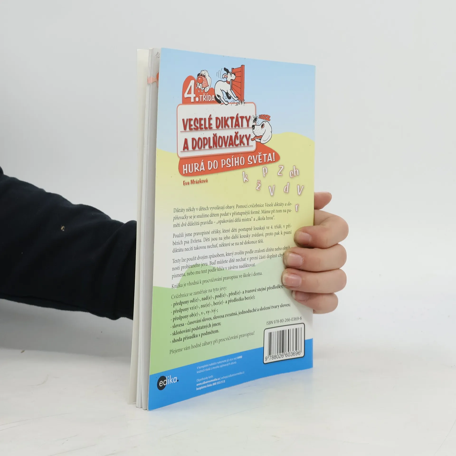Diktáty nemusí být vždy nuda! Diktáty někdy v dětech vyvolávají obavy. Pomocí cvičebnice Veselé diktáty a doplňovačky se je snažíme dětem podat v přístupnější formě. Máme při tom na paměti dvě důležitá pravidla – „opakování dělá mistra“ a „škola hrou“. Použili jsme pravopisné oříšky, které děti postupně louskají ve 4. třídě, v příbězích psa Evžena. Děti jsou na jeho další kousky zvědavé, proto pak k psaní diktátu necítí takovou nechuť, některé se na ně dokonce těší. Texty lze použít dvojím způsobem, který zvolíte podle zralosti dítěte nebo obtížnosti probíraného jevu. Buď můžete dítě nechat v první části doplnit chybějící písmena, nebo mu text podle klíče v závěru nadiktovat. Knížka je vhodná k procvičování pravopisu ve škole i doma. Cvičebnice se zaměřuje na tyto jevy: - předpony od(e)-, nad(e)-, pod(e)-, před(e)- a tvarově stejné předložky; - předpony vz(e)-, roz(e)-, bez(e)- a předložka bez(e); - předpony ob(e)-, v-, vy-/vý-; - slovesa – časování sloves, slovesa zvratná, jednoduché a složené tvary sloves; - skloňování podstatných jmen; - shoda přísudku s podmětem. Přejeme vám hodně zábavy při procvičování pravopisu!