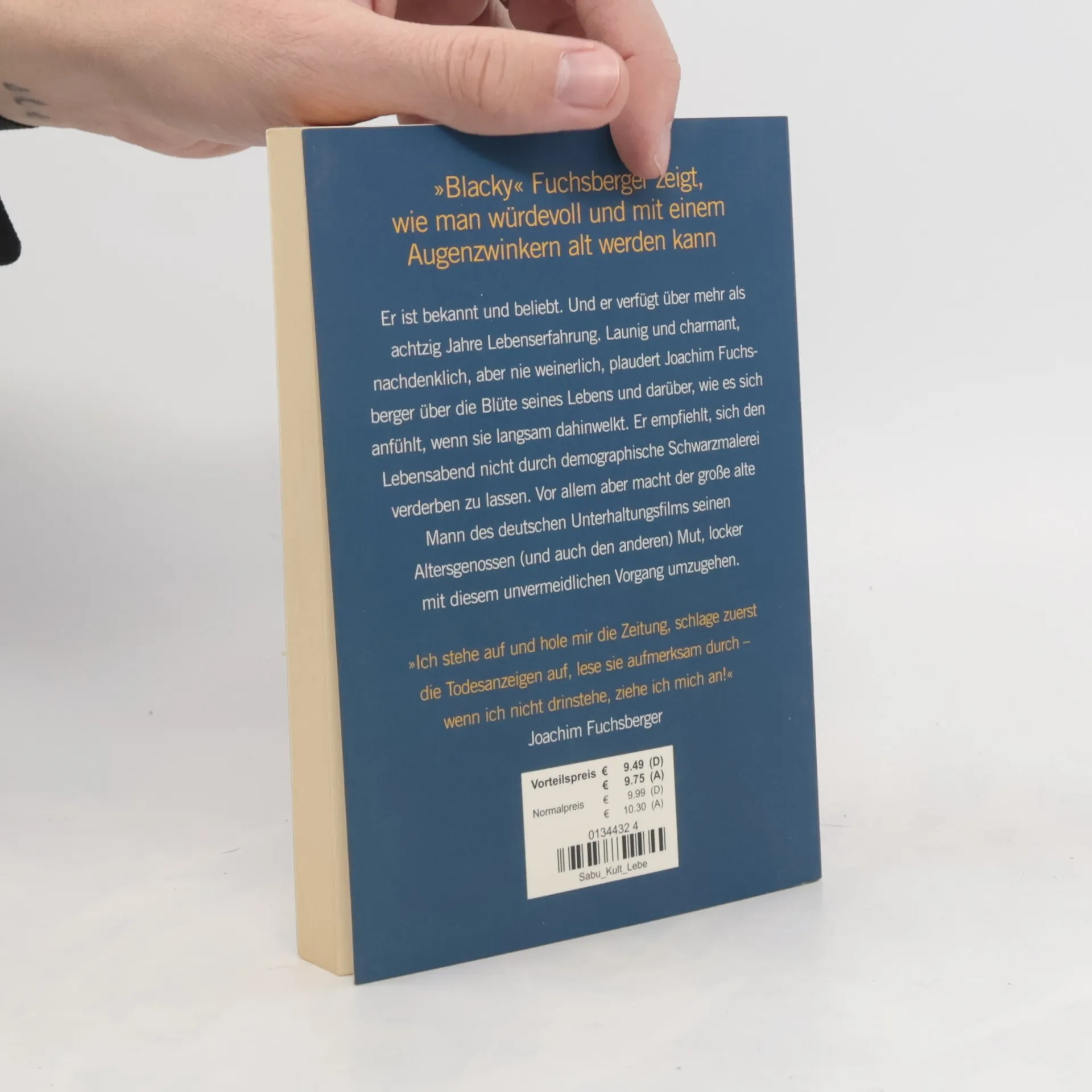 Wie man in Würde und mit einem Augenzwinkern alt werden kann - Nachdenken über das Alter – authentisch und unterhaltsam- Ein lesenwertes, heiter-ironisches Buch von einem Sympathieträger erster GüteEr ist alt. Er ist bekannt und beliebt. Jetzt macht der Schauspieler Joachim Fuchsberger seinen Altersgenossen und allen Jüngeren, die ja auch irgendwann mal alt werden, Mut, locker mit diesem unvermeidlichen Vorgang im Leben umzugehen: »Ich denke, es ist Zeit, dass sich die Alten die faltige Haut nicht länger über die Ohren ziehen lassen. Hören wir auf, im stillen Kämmerlein und vor der Glotze auf die Schwätzer aus den Amtsstuben zu hören, lassen wir uns keine Angst mehr einjagen von den Neunmalklugen, wo immer sie sitzen.«Launig und charmant, nachdenklich, aber nie weinerlich, plaudert der große alte Mann des deutschen Unterhaltungsfilms über die Blüte seines Lebens und darüber, wie es sich anfühlt, wenn sie langsam dahinwelkt. Fuchsberger nimmt kein Blatt vor den Mund und empfiehlt, sich den Lebensabend nicht durch demographische Schwarzmalerei verderben zu lassen.