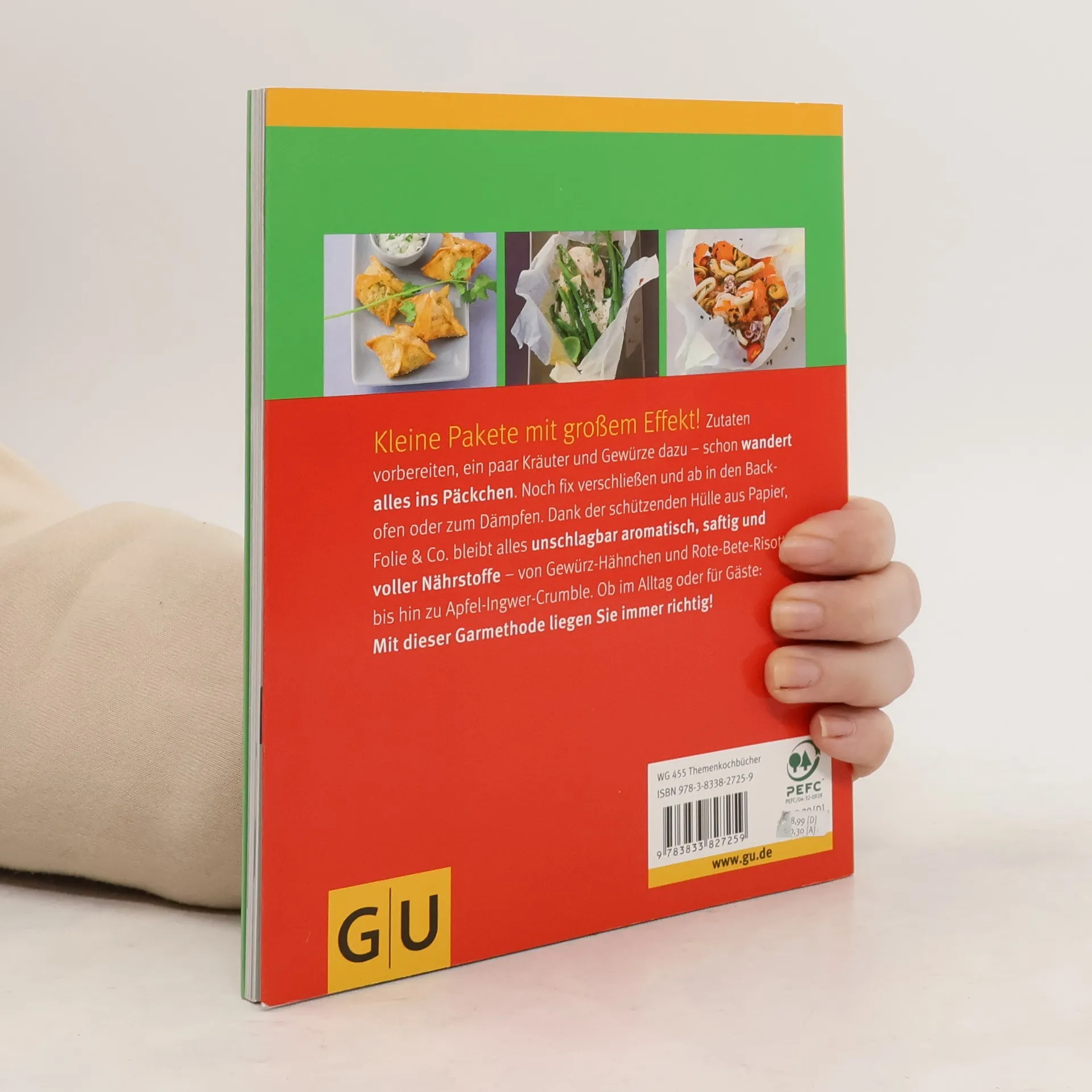 Ob im Alltag oder zu besonderen Anlässen, das Garen im Päckchen bereichert jeden kulinarischen Anlass. Eine schützende Hülle aus Papier, Folie, Bananenblatt, Bratschlauch, Meersalz oder Teig versiegelt die Zutaten. So können Fleisch, Fisch, Gemüse und Co. ihr volles Geschmackspotential entfalten und kommen dabei nahezu ohne Zugabe von Fett aus. Diese schonende Garmethode garantiert saftig zarte und vor allem wunderbar aromatische Ergebnisse. Damit sorgen die rund 50 kleinen raffinierten Aromapakete für Überraschung am Esstisch. Ob fruchtige Mozzarella-Säckchen, Minz-Doraden im Salzmantel, Gewürz-Hähnchen, Rote-Bete-Risotto oder Apfel-Ingwer-Crumble - der Päckchenvielfalt sind keine Grenzen gesetzt. Die richtige Falttechnik ist schnell gelernt und so lassen sich alle Gericht ganz einfach und entspannt vorbereiten. Bunte Päckchenmenüs und charmante Dekoideen begeistern auch Gäste.