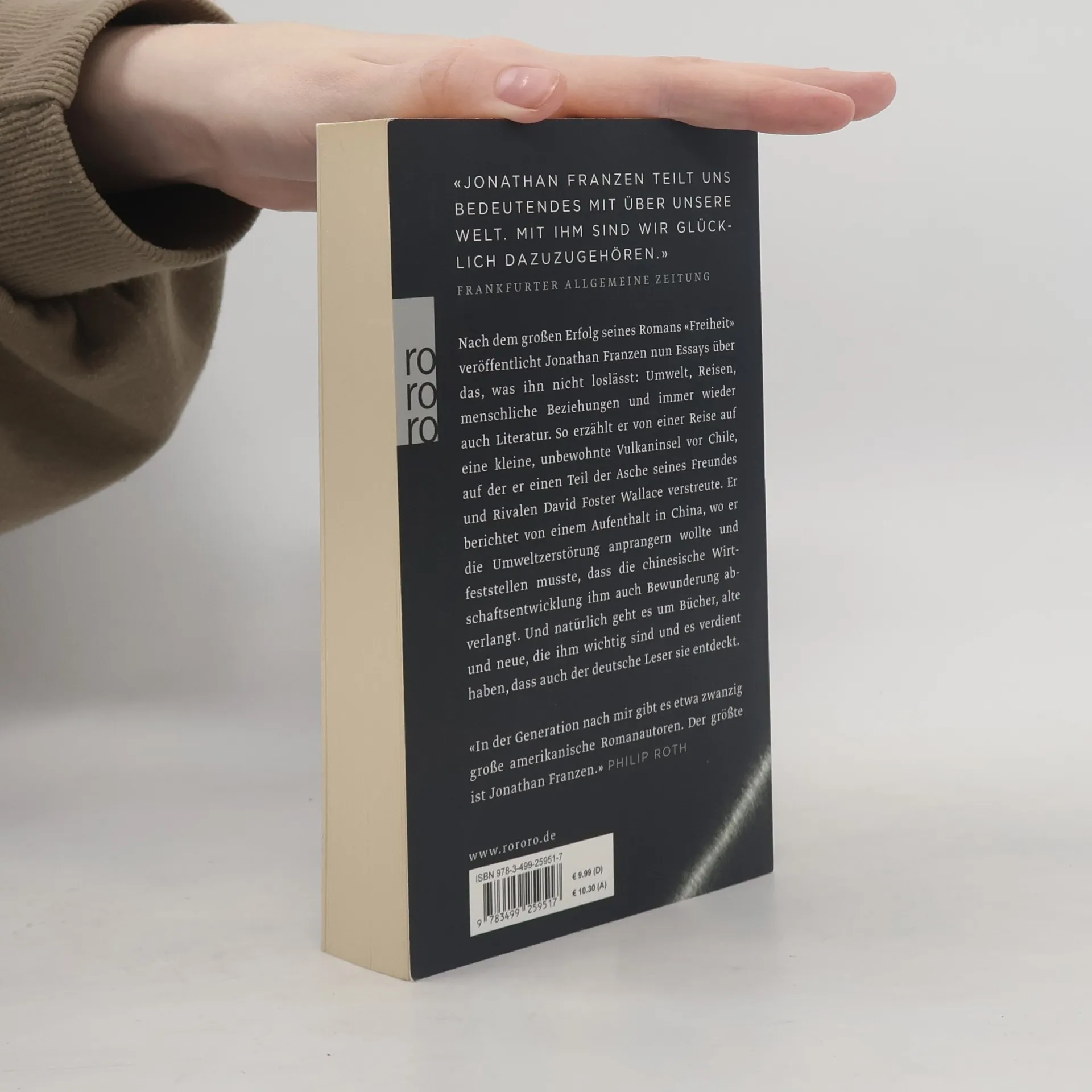 Nach dem großen Erfolg seines Romans «Freiheit» veröffentlicht Jonathan Franzen nun Essays über das, was ihn nicht loslässt: Umwelt, Reisen, menschliche Beziehungen und immer wieder auch Literatur. So erzählt er von einer Reise auf eine kleine, unbewohnte Vulkaninsel vor Chile, auf der er einen Teil der Asche seines Freundes und Rivalen David Foster Wallace verstreute. Er berichtet von einem Aufenthalt in China, wo er die Umweltzerstörung anprangern wollte und feststellen musste, dass die chinesische Wirtschaftsentwicklung ihm auch Bewunderung abverlangt. Und natürlich geht es um Bücher, alte und neue, die ihm wichtig sind und es verdient haben, dass auch der deutsche Leser sie entdeckt.