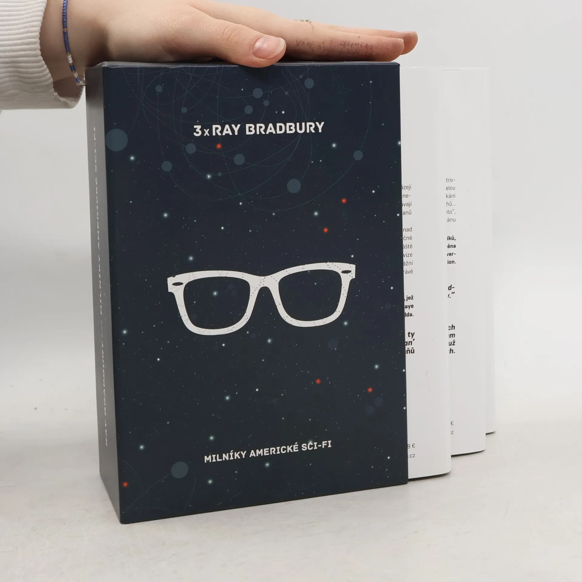 Marťanská kronika, román o osidlování Marsu, které ale zdaleka neprobíhá tak, jak by si lidstvo přálo. Ilustrovaný muž, povídková sbírka s osmnácti příběhy, jež na sobě nosí záhadný potetovaný člověk. 451 stupňů Fahrenheita, román o hasičích, jejichž úkolem není hasit, ale naopak pálit. Tři mistrná díla science fiction z pera legendy tohoto žánru Raye Bradburyho, která nyní představujeme v jednom knižním boxu.