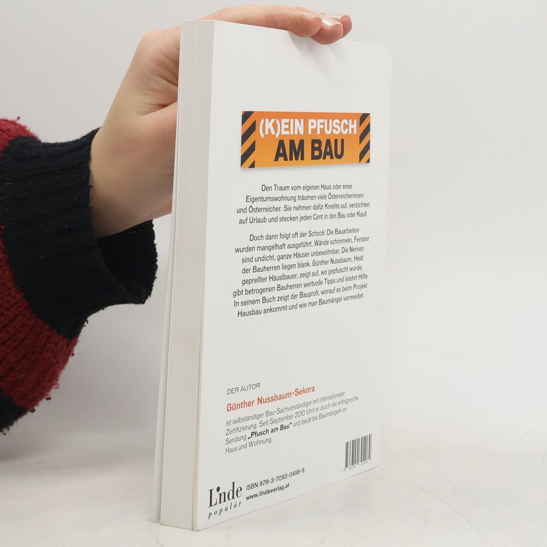 Schluss mit Pleiten, Pech und Pannen Den Traum vom eigenen Haus oder einer Eigentumswohnung träumen viele Österreicherinnen und Österreicher. Sie nehmen dafür Kredite auf, verzichten auf Urlaub und stecken jeden Cent in den Bau oder Kauf. Doch dann folgt oft der Schock: Die Bauarbeiten wurden mangelhaft ausgeführt, Wände schimmeln, Fenster sind undicht, ganze Häuser unbewohnbar. Die Nerven der Bauherren liegen blank. Günther Nussbaum, Held geprellter Häuslbauer, zeigt auf, wo gepfuscht wurde, gibt betrogenen Bauherren wertvolle Tipps und leistet Hilfe. In seinem Buch zeigt der Bauprofi, worauf es beim Projekt Hausbau ankommt und wie man Baumängel vermeidet. Interview mit Autor Günther Nussbaum-Sekora: