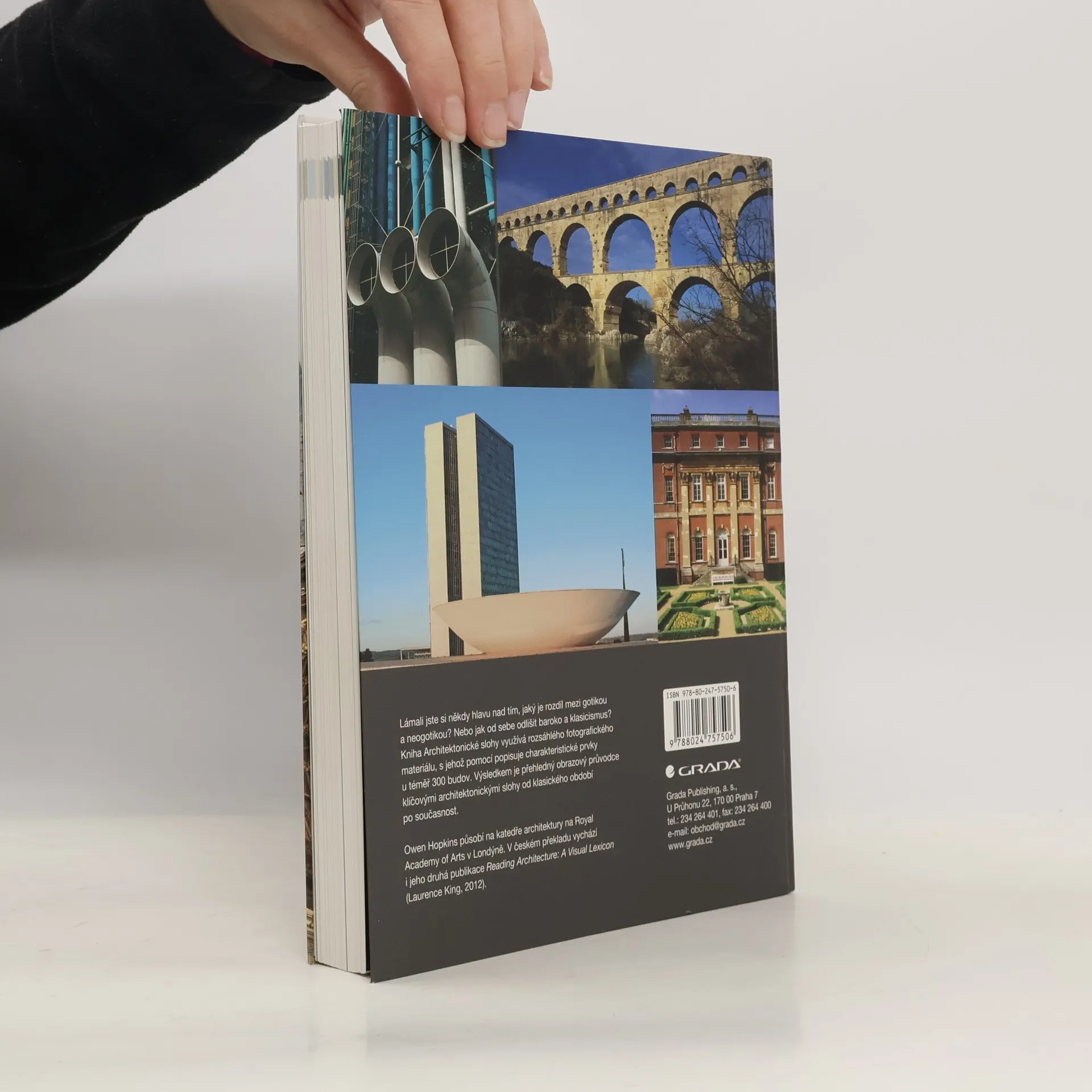 Lámali jste si někdy hlavu nad tím, jaký je rozdíl mezi gotikou a neogotikou? Nebo jak od sebe odlišit baroko a klasicismus? Kniha Architektonické slohy využívá rozsáhlého fotogra?ckého materiálu, s jehož pomocí popisuje charakteristické prvky u téměř 300 budov. Výsledkem je přehledný obrazový průvodce klíčovými slohy západní architektury od klasického období po současnost. Owen Hopkins působí na katedře architektury na Royal Academy of Arts v Londýně. V českém překladu vyjde také jeho druhá publikace Reading Architecture: A Visual Lexicon (Laurence King, 2012).