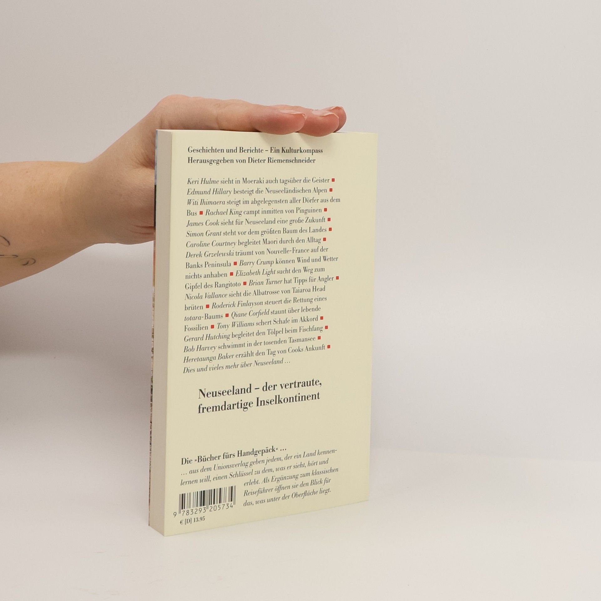 Keri Hulme sieht in Moeraki auch tagsüber die Geister Edmund Hillary besteigt die Neuseeländischen Alpen Witi Ihimaera steigt im abgelegensten aller Dörfer aus dem Bus Rachael King campt inmitten von Pinguinen James Cook sieht für Neuseeland eine große Zukunft Simon Grant steht vor dem größten Baum des Landes Caroline Courtney begleitet Maori durch den Alltag Derek Grzelewski träumt von Nouvelle-France auf der Banks Peninsula Barry Crump können Wind und Wetter nichts anhaben Elizabeth Light sucht den Weg zum Gipfel des Rangitoto Brian Turner hat Tipps für Angler Nicola Vallance sieht die Albatrosse von Taiaroa Head brüten Roderick Finlayson steuert die Rettung eines totara- Baums Qiane Corfield staunt über lebende Fossilien Tony Williams schert Schafe im Akkord Gerard Hutching begleitet den Tölpel beim Fischfang Bob Harvey schwimmt in der tosenden Tasmansee Heretaunga Baker erzählt den Tag von Cooks Ankunft Dies und vieles mehr über Neuseeland …