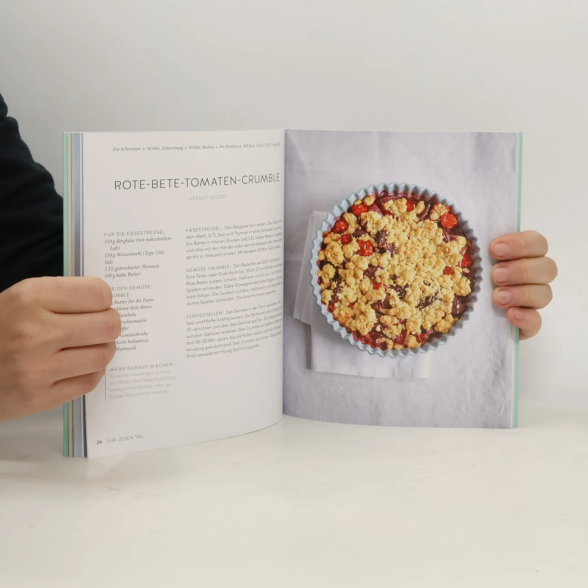 Dieses Buch eignet sich für alle, die einen einfachen Einstieg in die vegetarische Küche suchen oder gelegentlich fleischlos kochen möchten. Es bietet zahlreiche Rezeptideen für jede Gelegenheit, vom kleinen Snack bis zum vollwertigen Hauptgericht, um auch Gäste ohne Fleisch zu verwöhnen. Einsteiger finden nützliche Tipps zum vegetarischen Kochen, schnellem Gemüseschnippeln und schmackhaften Fleischalternativen. Immer mehr Menschen legen Wert auf eine bewusste und gesunde Ernährung, wobei die vegetarische Küche besonders beliebt ist. Die große Auswahl an interessanten Rezepten spricht sowohl Anfänger als auch erfahrene Hobbyköche an, die Neues ausprobieren möchten. Das Buch bietet saisonale Rezeptideen und kreative vegetarische Küche für jeden Tag. In drei Kapiteln finden Sie Rezepte für schnelle Kleinigkeiten wie Blumenkohlsalat oder wärmende Minestrone, sowie Gerichte für die Mittagspause wie Caprese-Sandwich oder bunten Mexiko-Salat im Glas. Am Wochenende können Sie ausgefallenere Gerichte wie selbstgemachte Gnocchi mit Kürbis und Fetabröseln zubereiten. Zudem gibt es wertvolle Tipps zu Küchenhelfern und eine Übersicht über Lebensmittel, die Fleisch ersetzen können. Praktische Ausklappseiten zeigen wichtige Handgriffe zur Lagerung und Verarbeitung von Gemüse.