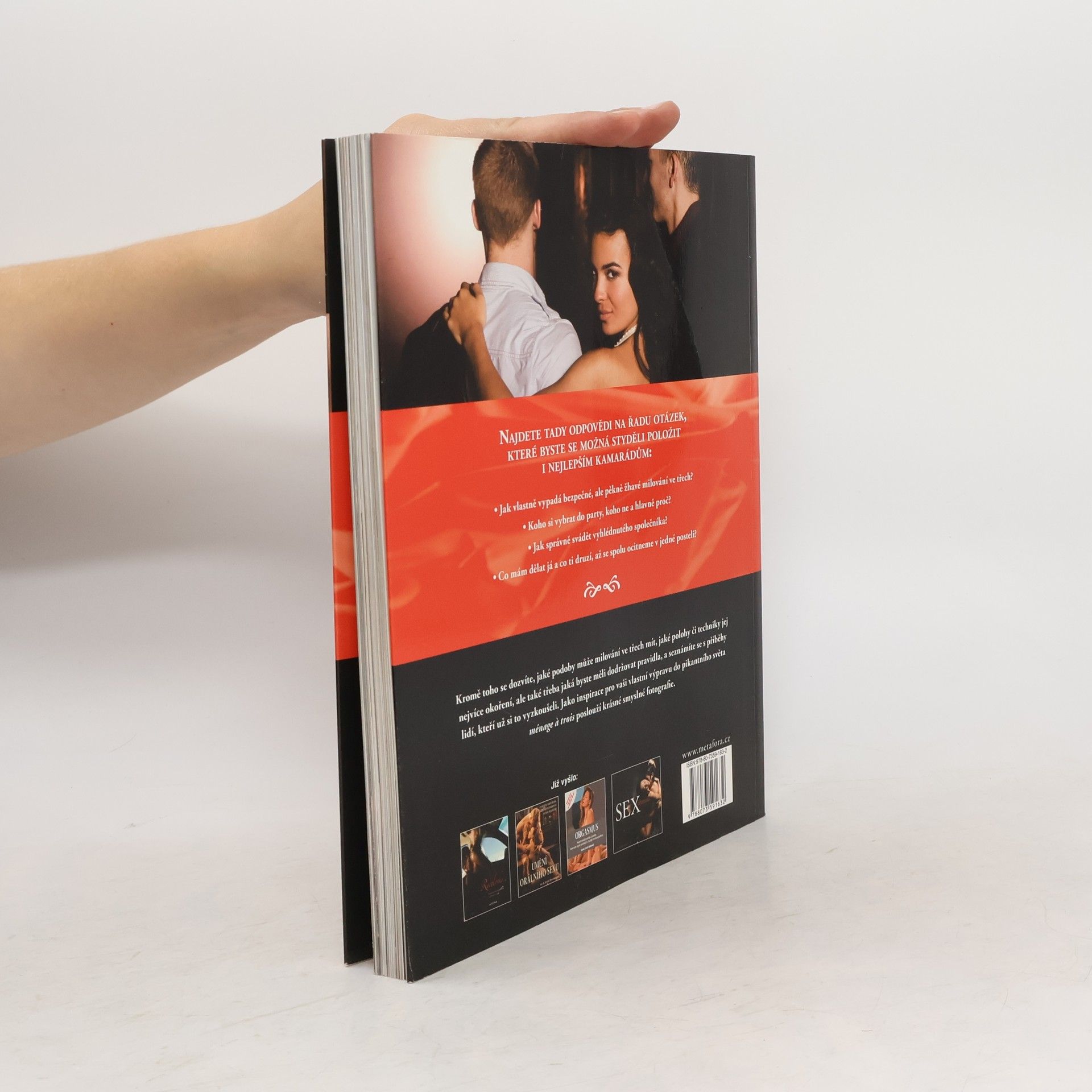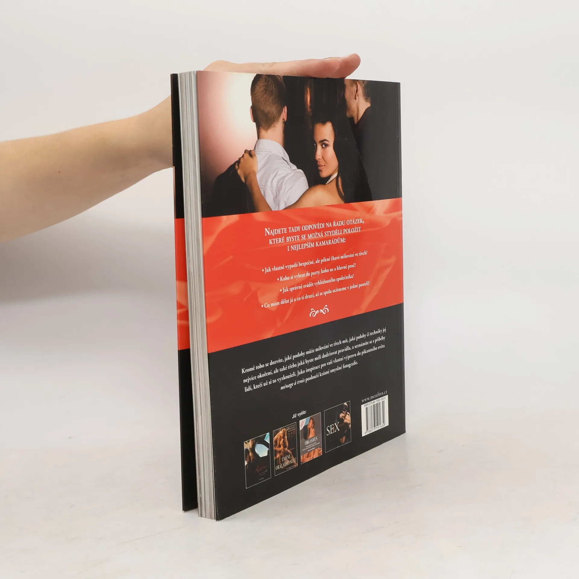 Hrátky pro zvídavé a hodně odvážné… Přiznejte se, už vás někdy napadlo, že by nebylo špatné vyzkoušet si sex ve třech? Potíž je ale v tom, že i kdyby šlo o vaši nejoblíbenější fantazii, nemáte zdání, jak na to. Začněte tedy tím, že si otevřete tuhle knížku. Krok za krokem provede nevšedním, vzrušujícím dobrodružstvím. Najdete v ní příběhy těch, co už si to vyzkoušeli, i odpovědi na řadu otázek, které byste se možná styděli položit i nejlepším kamarádům: Jak vlastně vypadá bezpečné, ale pěkně žhavé milování ve třech? Koho si vybrat do party, koho ne a hlavně proč? Co mám dělat já a co ti druzí, až se spolu ocitneme v jedné posteli? Jako inspirace pro vaši vlastní výpravu do pikantního světa ménage a trois poslouží krásné smyslné fotografie.