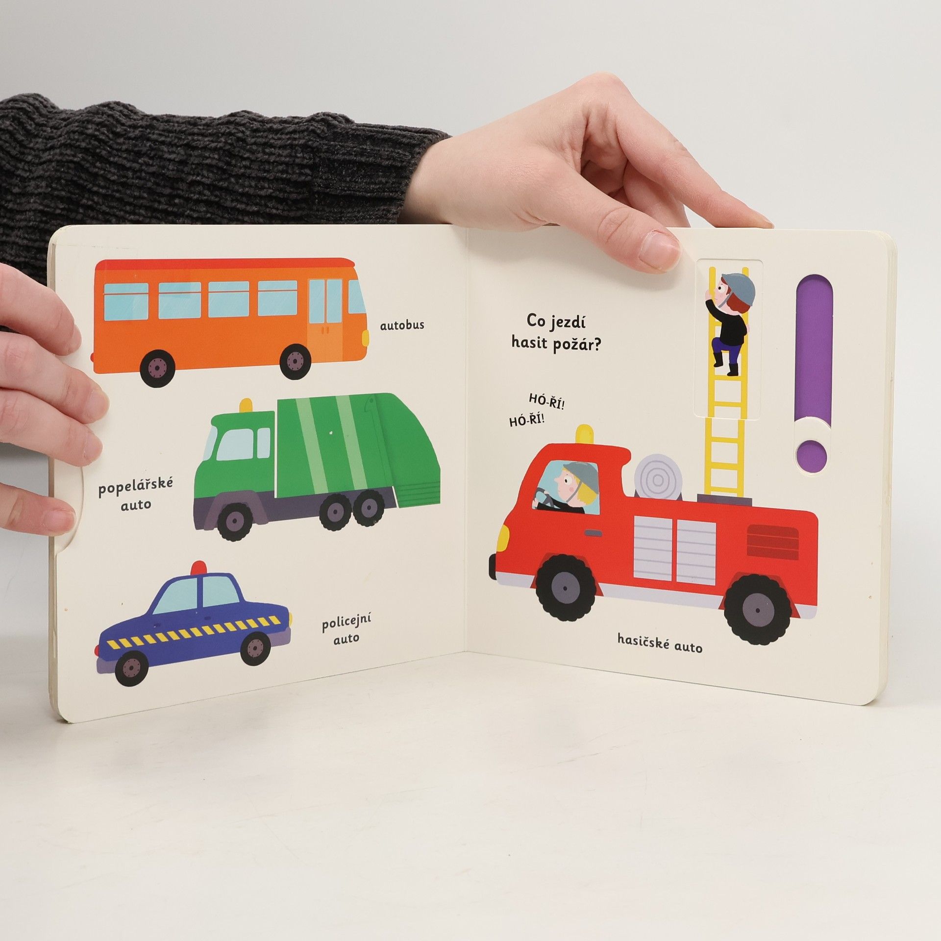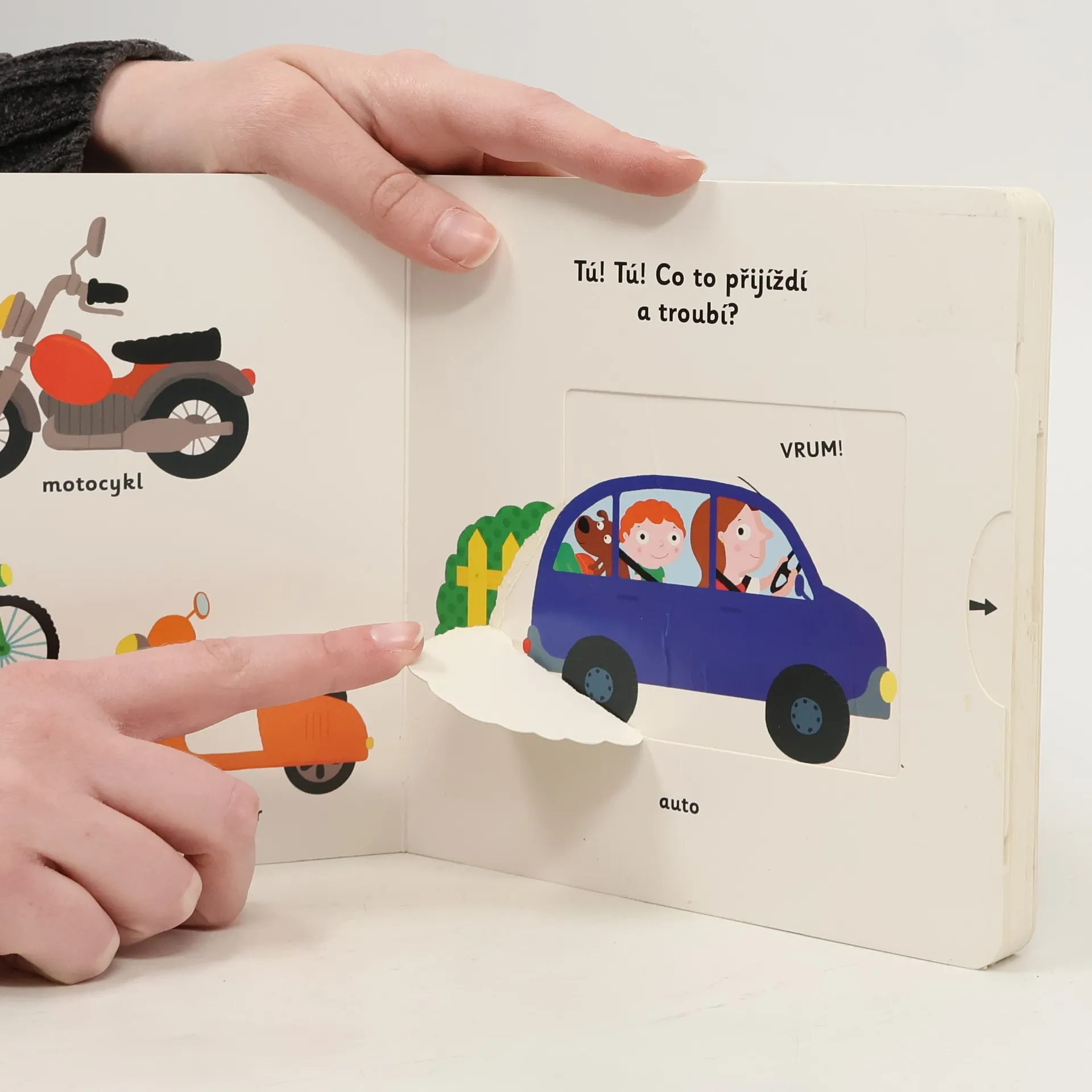 Objevovat svět vozidel a dopravních prostředků s tímto leporelem je tak zábavné! Tú, tú, copak to přijíždí a troubí? Co jezdí hasit požáry? Jaký stroj přenáší na staveništi těžké náklady? Co létá pomocí vrtule? Stačí jen vložit prstík do správného otvoru a lehce vysunout, zatáhnout nebo otočit ve směru šipky a hned bude váš malý objevitel znát odpovědi. Leporelo je určeno pro nejmenší děti od jednoho roku a má pevné stránky s posuvnými a otočnými prvky, a tak si naši nejmenší mohou při prohlížení a rozeznávání různých druhů vozidel a dopravních prostředků procvičit i jemnou motoriku.