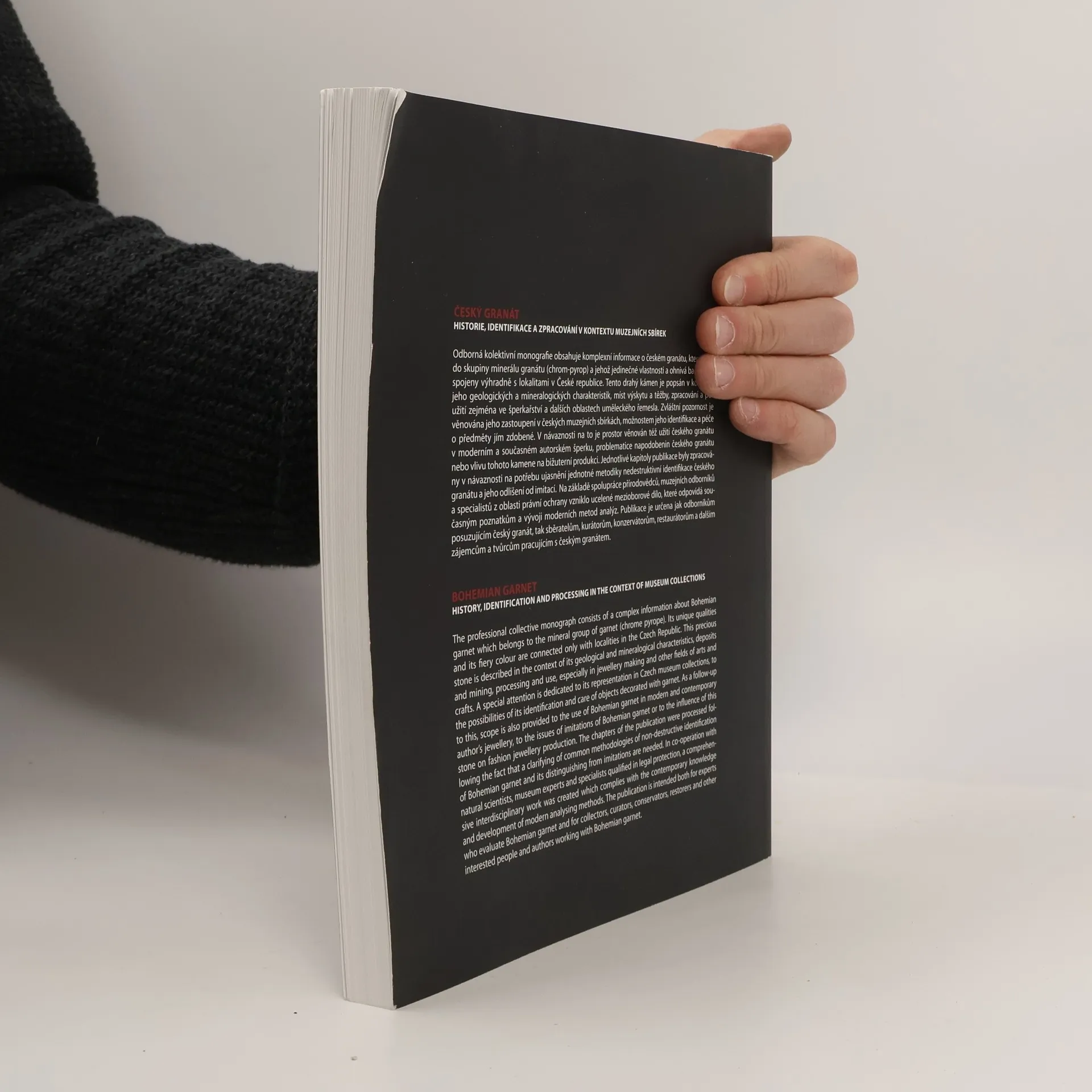 Odborná kolektivní monografie obsahuje komplexní informace o českém granátu, který patří do skupiny minerálu granátu (chrom-pyrop) a jehož jedinečné vlastnosti a ohnivá barva jsou spojeny výhradně s lokalitami v České republice. Tento drahý kámen je popsán v kontextu jeho geologických a mineralogických charakteristik, míst výskytu a těžby, zpracování a použití zejména ve šperkařství a dalších oblastech uměleckého řemesla. Zvláštní pozornost je věnována jeho zastoupení v českých muzejních sbírkách, možnostem jeho identifikace a péče o předměty jím zdobené. V návaznosti na to je prostor věnován též užití českého granátu v moderním a současném autorském šperku, problematice napodobenin českého granátu nebo vlivu tohoto kamene na bižuterní produkci. Jednotlivé kapitoly publikace byly zpracovány v návaznosti na potřebu ujasnění jednotné metodiky nedestruktivní identifikace českého granátu a jeho odlišení od imitací. Na základě spolupráce přírodovědců, muzejních odborníků a specialistů z oblasti právní ochrany vzniklo ucelené mezioborové dílo, které odpovídá současným poznatkům a vývoji moderních metod analýz. Publikace je určena jak odborníkům posuzujícím český granát, tak sběratelům, kurátorům, konzervátorům, restaurátorům a dalším zájemcům a tvůrcům pracujícím s českým granátem.