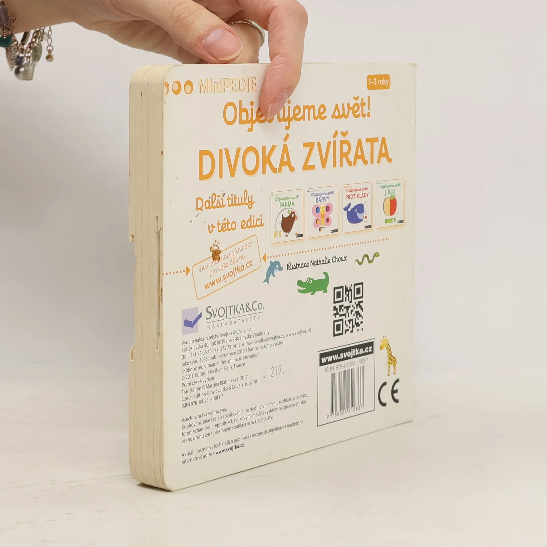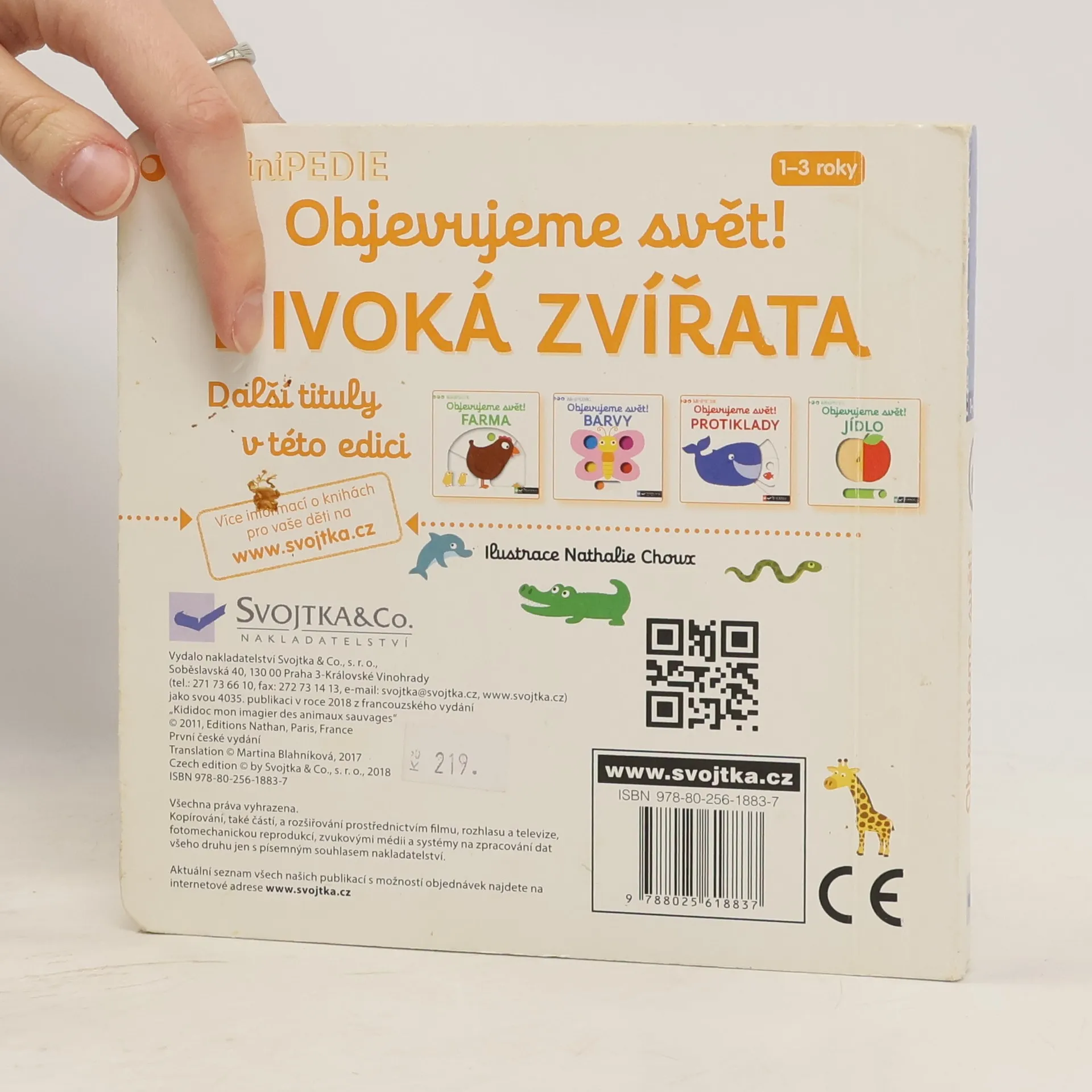 Zhoupni se s opičkou na větvi; pomoz medvědovi dostat med od divokých včel; seznam se s africkými zvířaty v džungli nebo si prohlédni podmořský svět. Lev, tygr, krokodýl, velryba, chobotníce a mnozí další už se těší, až si s nimi budeš hrát! Stačí jen vložit prstík do správného otvoru a lehce vysunout, zatáhnout nebo otočit ve směru šipky a váš malý objevitel ihned rozpohybuje toto interaktivní poznávací leporelo. Leporelo je určeno pro nejmenší děti od jednoho roku a má pevné stránky s posuvnými a otočnými prvky, a tak si naši nejmenší mohou při prohlížení a rozeznávání zvířátek z divočiny procvičit i jemnou motoriku. Knížka s prvky Montessori.