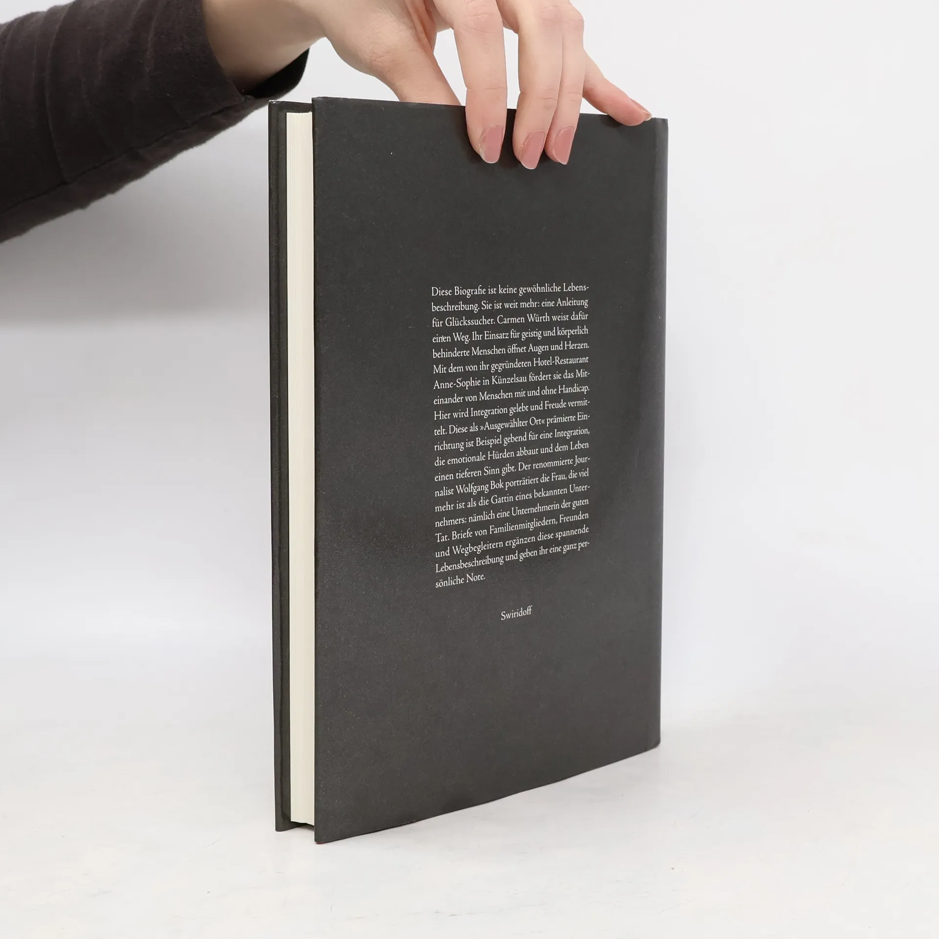 Diese Biografie ist keine gewöhnliche Lebensbeschreibung. Sie ist weit mehr: eine Anleitung für Glückssucher. Carmen Würth weist dafür einen Weg. Ihr Einsatz für geistig und körperlich behinderte Menschen öffnet Augen und Herzen. Mit dem von ihr gegründeten Hotel-Restaurant Anne-Sophie in Künzelsau fördert sie das Miteinander von Menschen mit und ohne Handicap. Hier wird Integration gelebt und Freude vermittelt. Diese als „ausgewählter Ort“ prämierte Einrichtung ist Beispiel gebend für eine Integration, die emotionale Hürden abbaut und dem Leben einen tieferen Sinn gibt. Der renommierte Journalist Wolfgang Bok porträtiert die Frau, die viel mehr ist als die Gattin eines bekannten Unternehmers: nämlich eine Unternehmerin der guten Tat. Briefe von Familienmitgliedern, Freunden und Wegbegleitern ergänzen diese spannende Lebensbeschreibung und geben ihr eine ganz persönliche Note.