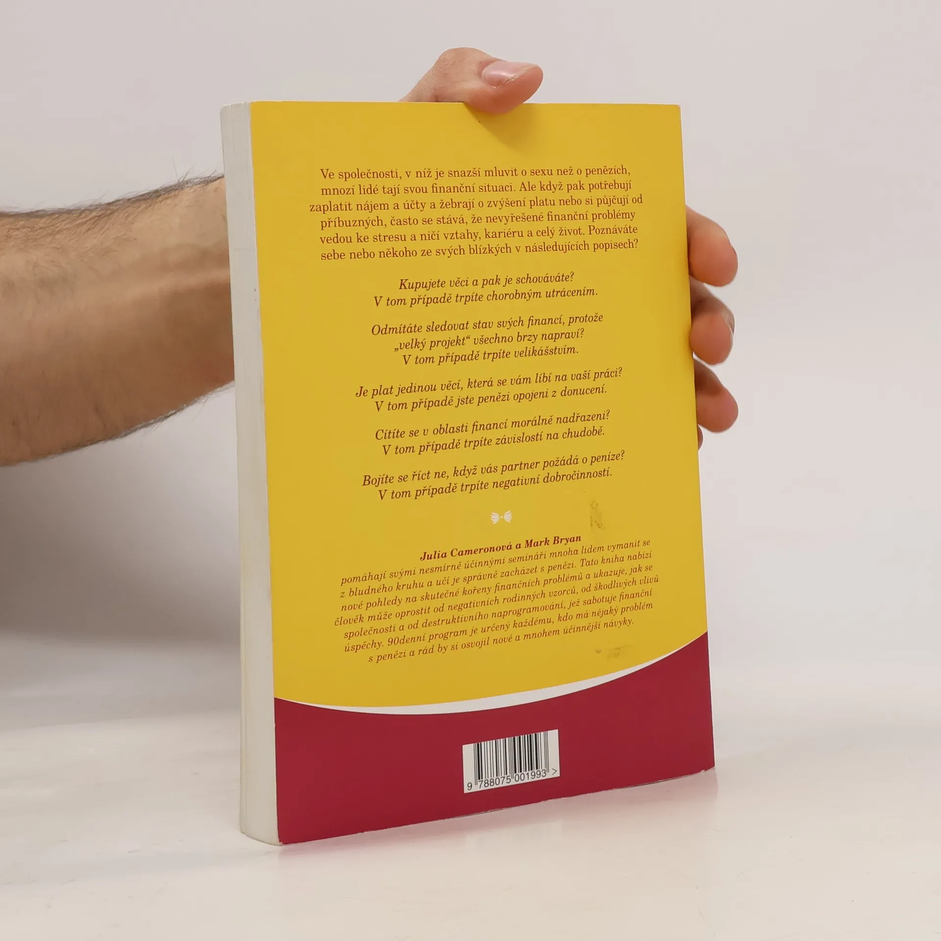 Ve společnosti, v níž je snazší mluvit o sexu než o penězích, mnozí lidé tají svou finanční situaci. Ale když pak potřebují zaplatit nájem a účty a žebrají o zvýšení platu nebo si půjčují od příbuzných, často se stává, že nevyřešené finanční problémy vedou ke stresu a ničí vztahy, kariéru a celý život. Poznáváte sebe nebo někoho ze svých blízkých v následujících popisech? Kupujete věci a pak je schováváte? V tom případě trpíte chorobným utrácením. Odmítáte sledovat stav svých financí, protože „velký projekt“ všechno brzy napraví? V tom případě trpíte velikášstvím. Je plat jedinou věcí, která se vám líbí na vaší práci? V tom případě jste penězi opojeni z donucení. Cítíte se v oblasti financí morálně nadřazeni? V tom případě trpíte závislostí na chudobě. Bojíte se říct ne, když vás partner požádá o peníze? V tom případě trpíte negativní dobročinností. Autoři pomáhají svými nesmírně účinnými semináři mnoha lidem vymanit se z bludného kruhu a učí je správně zacházet s penězi. Tato kniha nabízí nové pohledy na skutečné kořeny finančních problémů a ukazuje, jak se člověk může oprostit od negativních rodinných vzorců, od škodlivých vlivů společnosti a od destruktivního naprogramování, jež sabotuje finanční úspěchy. 90denní program je určený každému, kdo má nějaký problém s penězi a rád by si osvojil nové a mnohem účinnější návyky.
