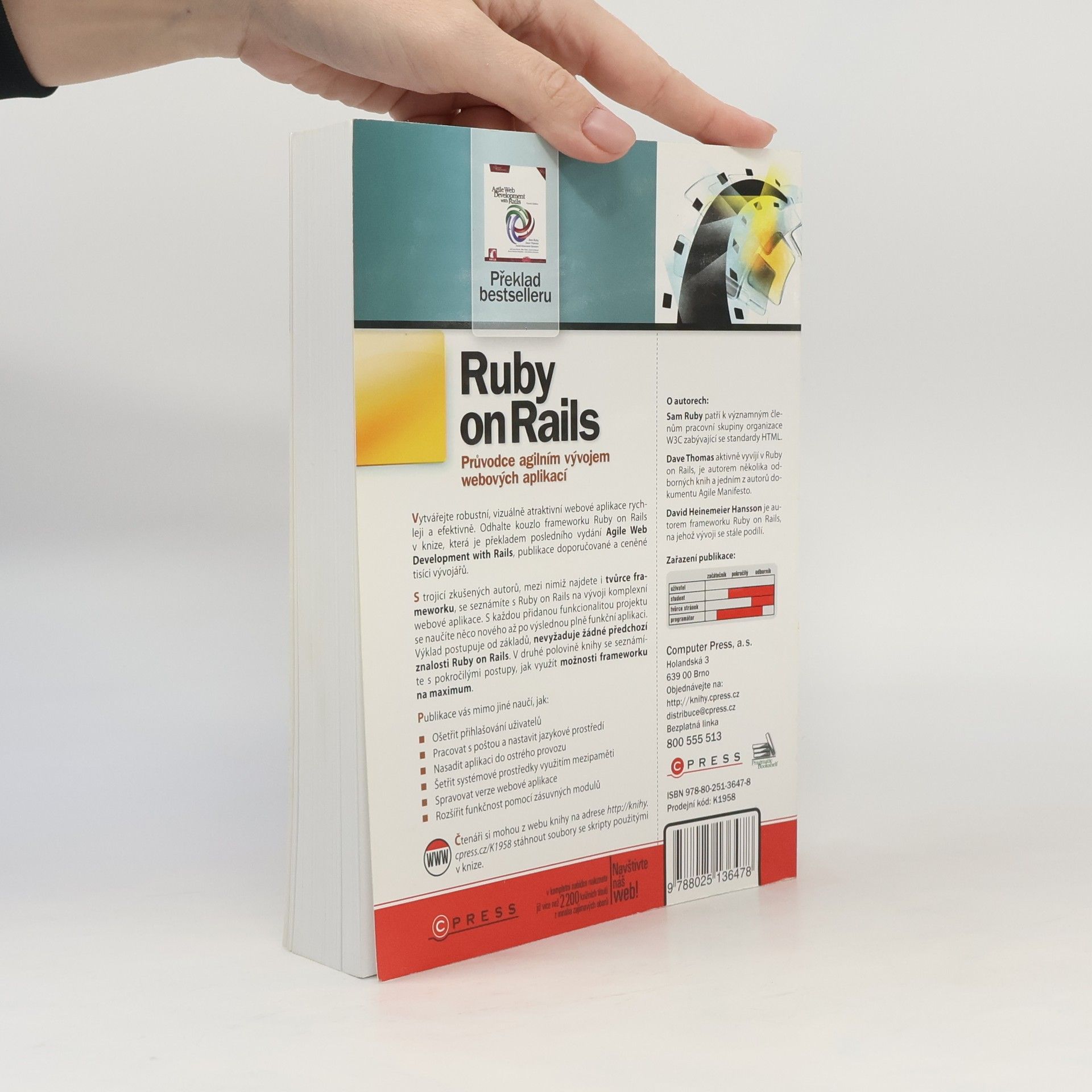 Vytvářejte robustní, vizuálně atraktivní webové aplikace rychleji a efektivně. Odhalte kouzlo frameworku Ruby on Rails v knize, která je překladem posledního vydání Agile Web Development with Rails, publikací doporučovanou a ceněnou tisíci vývojářů. S trojicí zkušených autorů, mezi nimiž najdeme i tvůrce frameworku, se seznámíte s Ruby on Rails na vývoji komplexní webové aplikace. S každou přidanou funkcionalitou projektu se naučíte něco nového až po výslednou plně funkční aplikaci. Výklad postupuje od základů, nevyžaduje žádné předchozí znalosti s Ruby on Rails. V druhé polovině knihy se seznámíte s pokročilými postupy, jak využít možnosti frameworku na maximum.