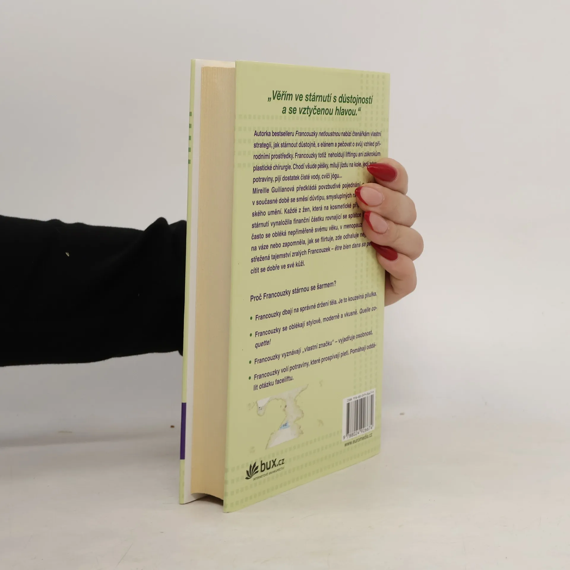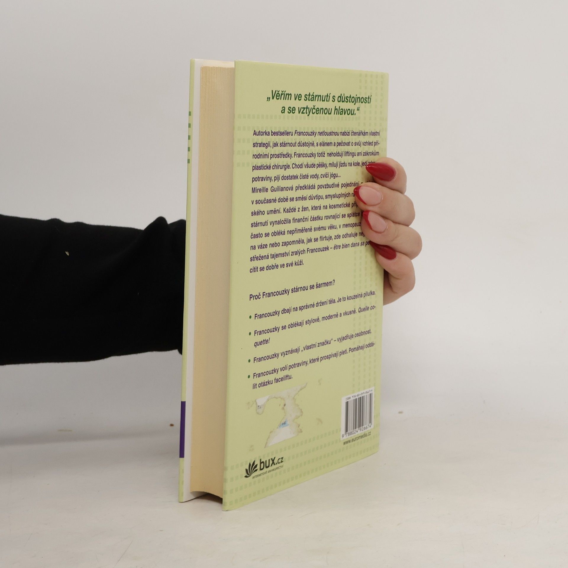 Tajemství, jak neztratit šarm. Autorka patří mezi ty Francouzky, které jsou údajně nejšťastnější ve zralém věku. Už nemusí hledat práci, nedychtí po kariéře, mají stálé přátele, zavedenou domácnost a umí přijímat libůstky i omezení. Dozvíte se tajemství péče o vzhled, jaké sportovní aktivity jsou nejvhodnější, jaký význam má spánek a snídaně pro zralé ženy. Autorka poodhalí vlastní formuli, která zlepší váš život, vzhled a zdraví, bude vám přinášet spokojenost a pomůže vám cítit se dobře ve své kůži v každém věku.