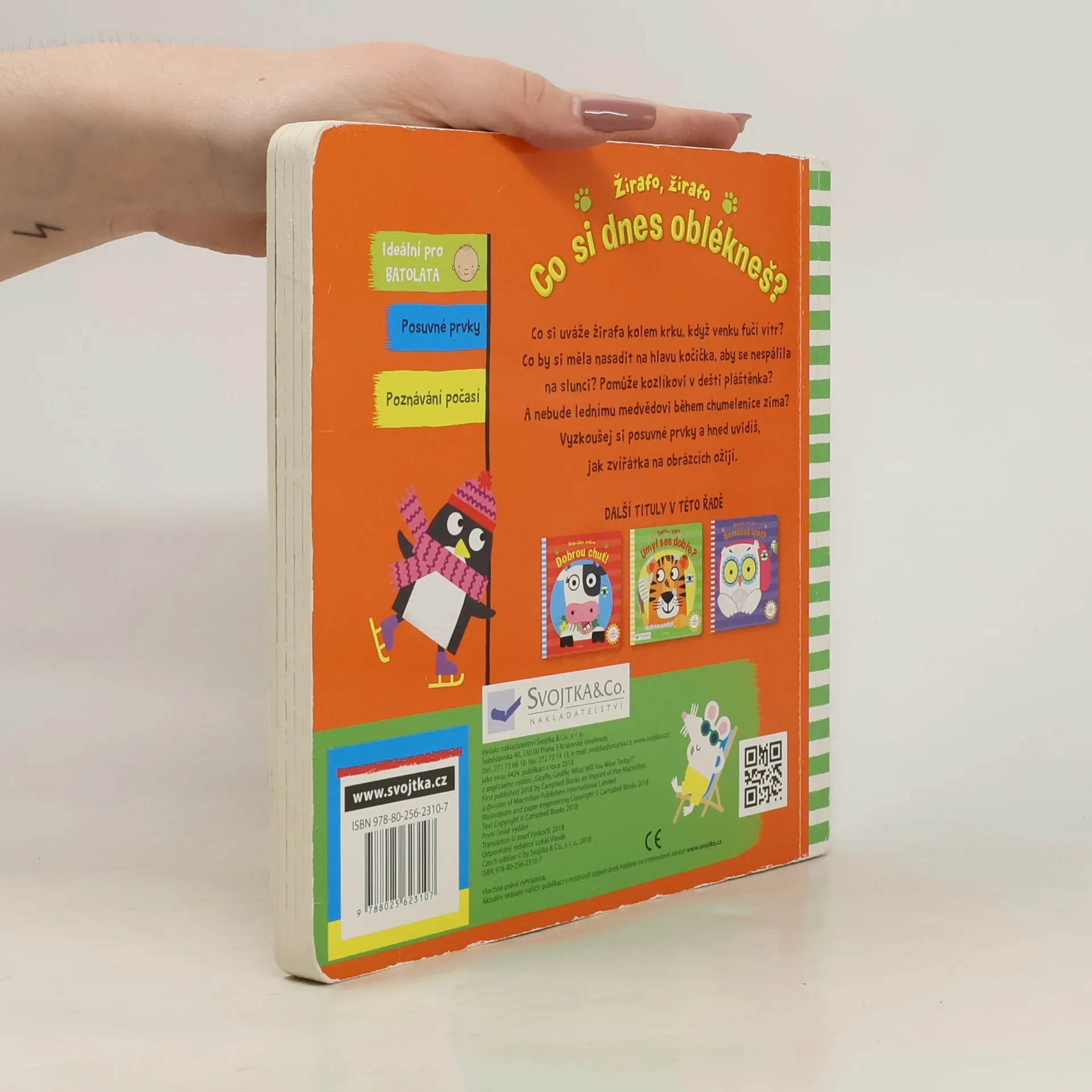 Jak se zvířátka oblečou, když fouká vítr, prší, svítí slunce nebo sněží? Ideální první čtení pro batolata, obsahuje posuvné prvky a hravé veršíky. Co si uváže žirafa kolem krku, když venku fučí vítr? Co by si měla nasadit na hlavu kočička, aby se nespálila na slunci? Pomůže kozlíkovi v dešti pláštěnka? A nebude lednímu medvědovi během chumelenice zima? Vyzkoušej si posuvné prvky a hned uvidíš, jak zvířátka na obrázcích ožijí. Zábavné první čtení – ideální pro batolata, obsahuje posuvné prvky, spoustu vtipných zvířat a hravých veršů. Tato knížka je skvělá na první chvíle společného čtení a smíchu nad veselými pohyblivými obrázky plnými legrace. Navíc nenásilnou formou učí děti o střídání čtyř ročních období, změnách počasí a správném oblékání.