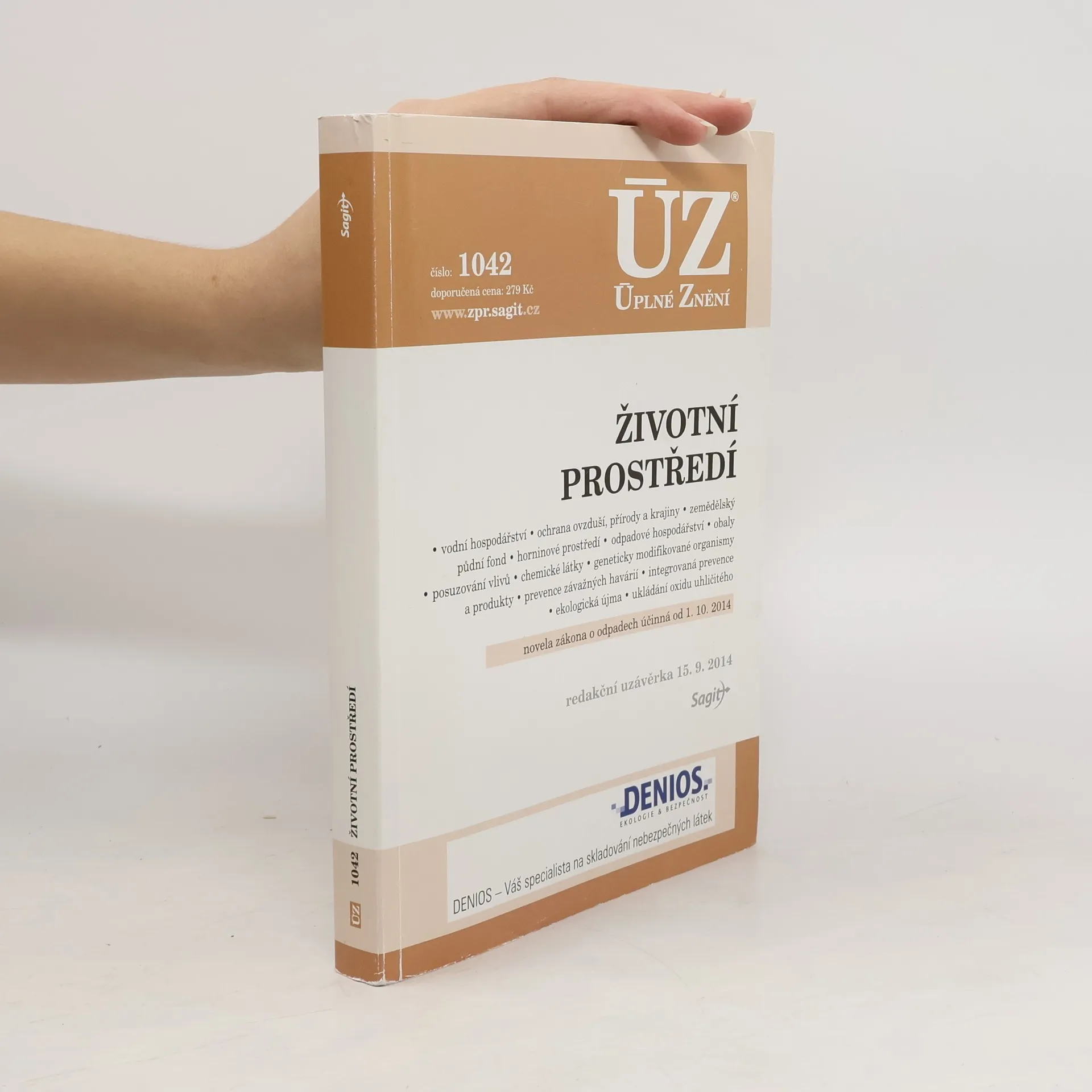 Úplné znění předpisů Publikace obsahuje aktuální znění 28 zákonů, které jsou rozděleny do 14 kapitol: vodní hospodářství, ochrana ovzduší, přírody a krajiny, ochrana zemědělského půdního fondu a horninového prostředí, odpadové hospodářství a obaly, posuzování vlivů na životní prostředí, nakládání s chemickými látkami a s geneticky modifikovanými organismy a produkty, prevence závažných havárií, integrovaná prevence znečišťování, ukládání oxidu uhličitého. Většina předpisů byla od minulého vydání dotčena řadou změn, které jsou v textech zvýrazněny tučně, největší změny nastaly v zákoně o odpadech. Podle stavu k 15. 9. 2014.