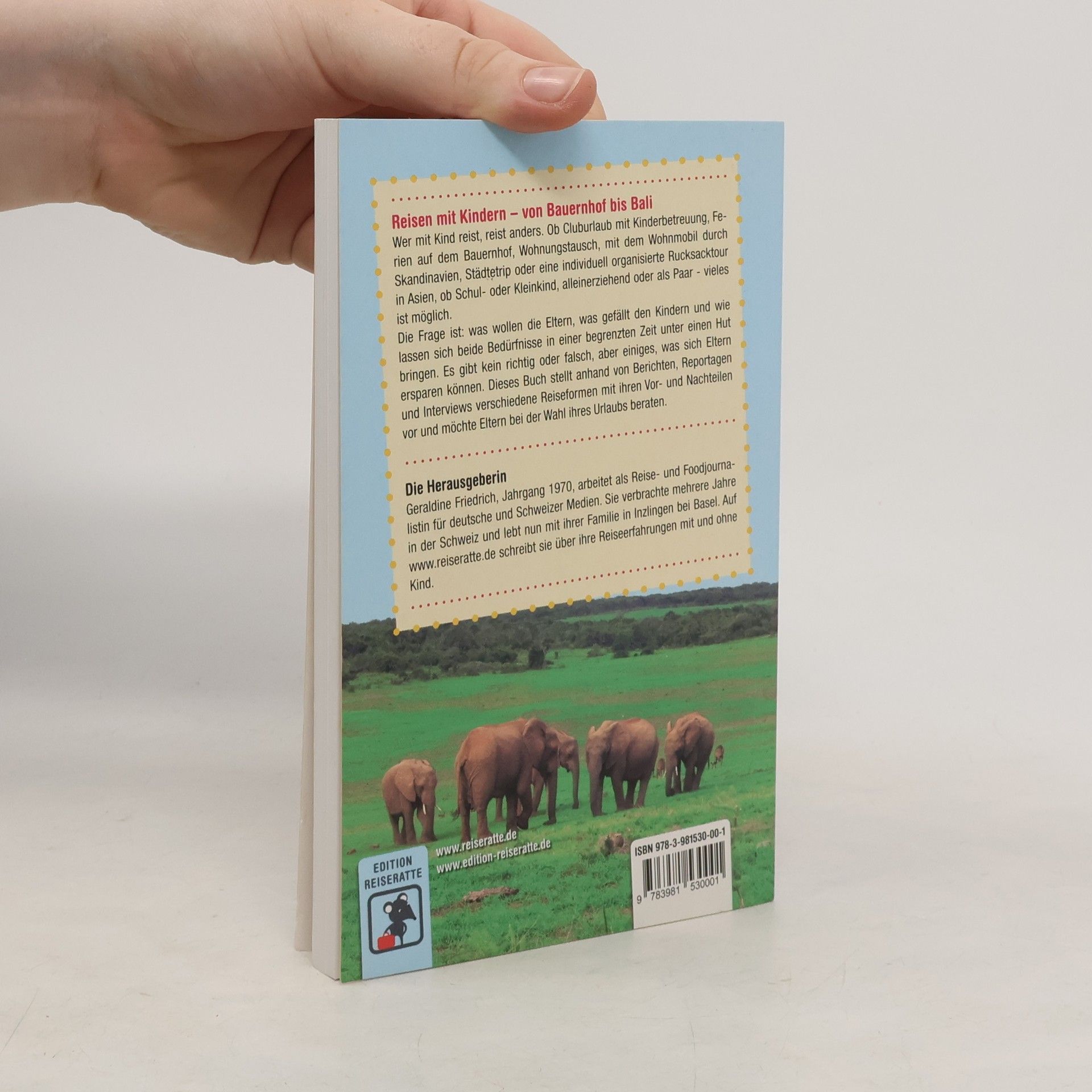 Alle Jahre wieder – wohin im nächsten Urlaub? Wer mit Kind reist, reist anders. Ob mit Esel durch die Provence, Camping in Nordnorwegen, Städtetrip nach New York oder selbst organisierte Rucksacktour durch Bali – zunächst müssen die Eltern herausfinden: Was wollen wir? Und wie lassen sich die Elternwünsche mit denen der Kinder unter einen Hut bringen? Es gibt kein richtig oder falsch, aber einiges, was man sich ersparen kann. In „Reisen mit Kind – von Bauernhof bis Bali“ stellen Mütter und Väter auf sehr persönliche Art rund 22 verschiedene Reiseformen bzw. Reiseziele vor, ergänzt um praktische Tipps reiseerfahrener Autoren. Das Buch will inspirieren und Mut machen sich abseits ausgetrampelter Pfade zu bewegen. Nach diesem Buch wissen Eltern, wohin die (nächste) Reise geht!