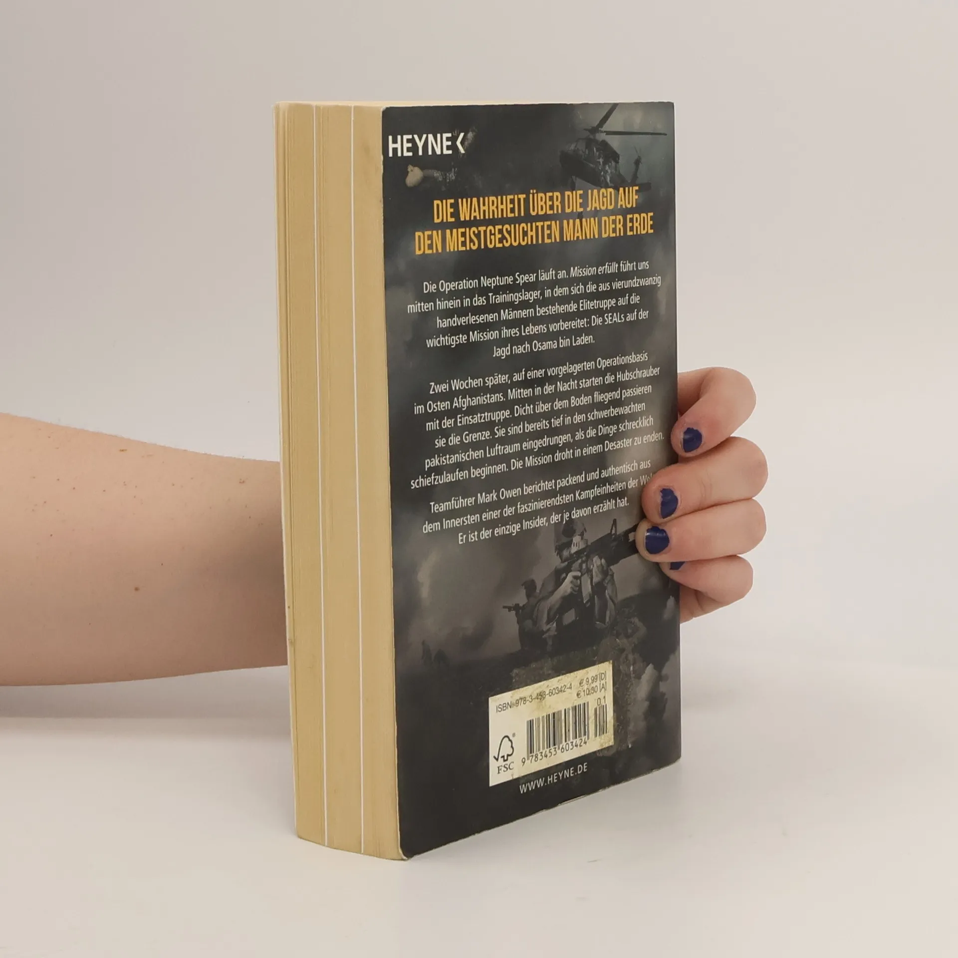 Operation Neptune Spear – wie Osama Bin Laden tatsächlich zu Tode kam Pakistan, Abottabad, 1. Mai 2011: Mark Owen ist Teamführer des Teams 6 der Navy SEALs. Ihre Mission: das Aufspüren und Ausschalten des weltweit am meisten gefürchteten und gesuchten Mannes, Osama Bin Laden. Zehn Jahre nachdem die Türme des World Trade Center in Flammen aufgingen und die Welt in Angst und Schrecken erstarrte, ereilt den Terroristenführer das Schicksal: Als einer der Ersten tritt Owen durch die Tür im zweiten Stock von Bin Ladens Versteck und wird Zeuge, wie er stirbt … Hautnah, spannungsgeladen, atemlos: die Wahrheit über eine der bestgehüteten Geheimoperationen der Welt.