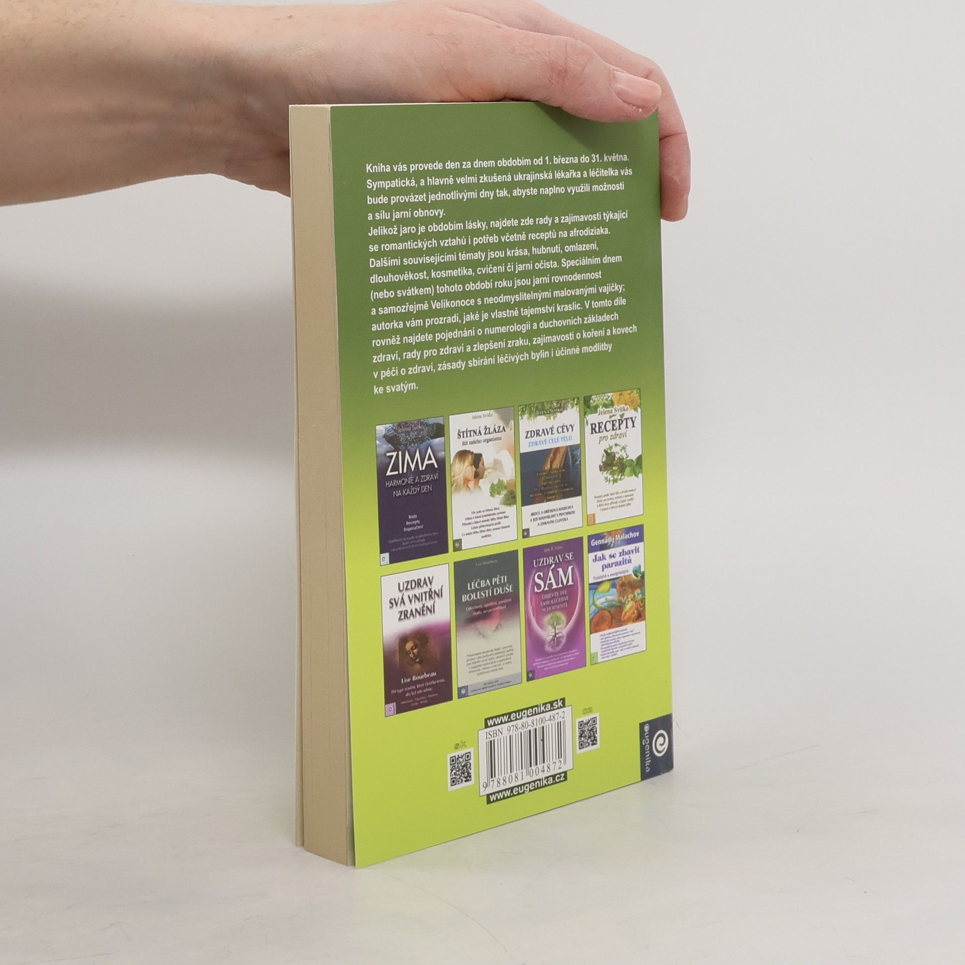 Kniha vás provede den za dnem obdobím od 1. března do 31. května. Sympatická, a hlavně velmi zkušená ukrajinská lékařka a léčitelka vás bude provázet jednotlivými dny tak, abyste naplno využili možnosti a sílu jarní obnovy. Jelikož jaro je obdobím lásky, najdete zde rady a zajímavosti týkající se romantických vztahů i potřeb včetně receptů na afrodiziaka. Dalšími souvisejícími tématy jsou krása, hubnutí, omlazení, dlouhověkost, kosmetika, cvičení či jarní očista. Speciálním dnem (nebo svátkem) tohoto období roku jsou jarní rovnodennost a samozřejmě Velikonoce s neodmyslitelnými malovanými vajíčky; autorka vám prozradí, jaké je vlastně tajemství kraslic. V tomto díle rovněž najdete pojednání o numerologii a duchovních základech zdraví, rady pro zdraví a zlepšení zraku, zajímavosti o koření a kovech v péči o zdraví, zásady sbírání léčivých bylin i účinné modlitby ke svatým.