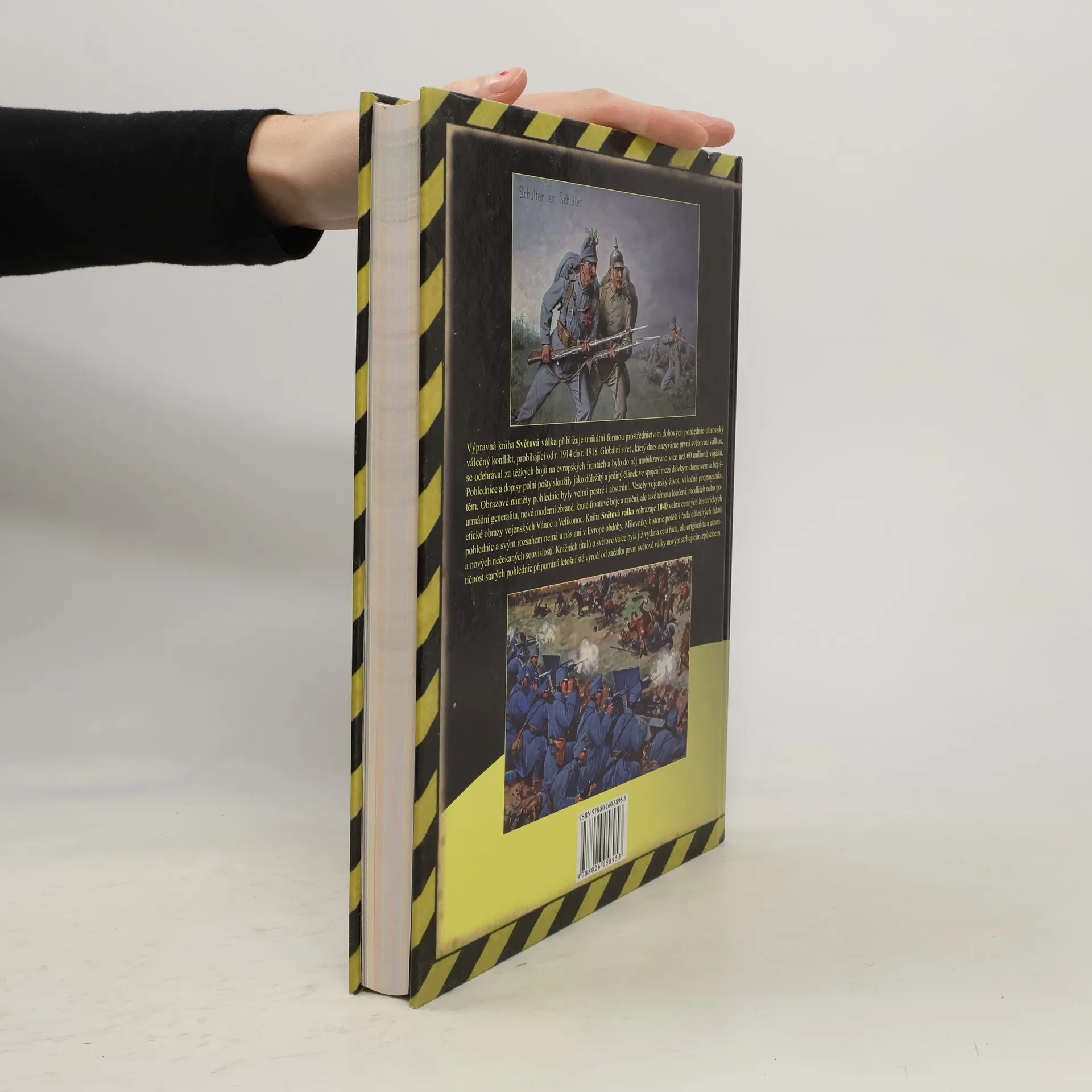 Výpravná kniha přibližuje prostřednictvím dobových pohlednic obrovský válečný konflikt, probíhající v letech 1914-1918. Globální střet, který dnes nazýváme první světovou válkou, se odehrával za těžkých bojů na evropských frontách a bylo do něj mobilizováno více než 60 milionů vojáků. Pohlednice a dopisy polní pošty sloužily jako důležitý a jediný článek ve spojení mezi dalekým domovem a bojištěm. Obrazové náměty pohlednic byly velmi pestré, někdy i absurdní. Veselý vojenský život, válečná propaganda, armádní generalita, nové moderní zbraně, kruté frontové boje a ranění, ale také témata loučení, modliteb nebo poetické obrazy vojenských Vánoc a Velikonoc. V neposlední řadě i pohlednice nejsmutnější, pohlednice posledního odpočinku padlých vojáků, hřbitovů a hrobů. Kniha Světová válka zobrazuje 1040 velmi cenných historických pohlednic a svým rozsahem nemá u nás ani v Evropě obdoby. Milovníky historie potěší i řada důležitých faktů a nových nečekaných souvislostí. Knižních titulů o světové válce byla již vydána celá řada, ale originalita a autentičnost starých pohlednic připomíná sté výročí od začátku první světové války novým strhujícím způsobem.