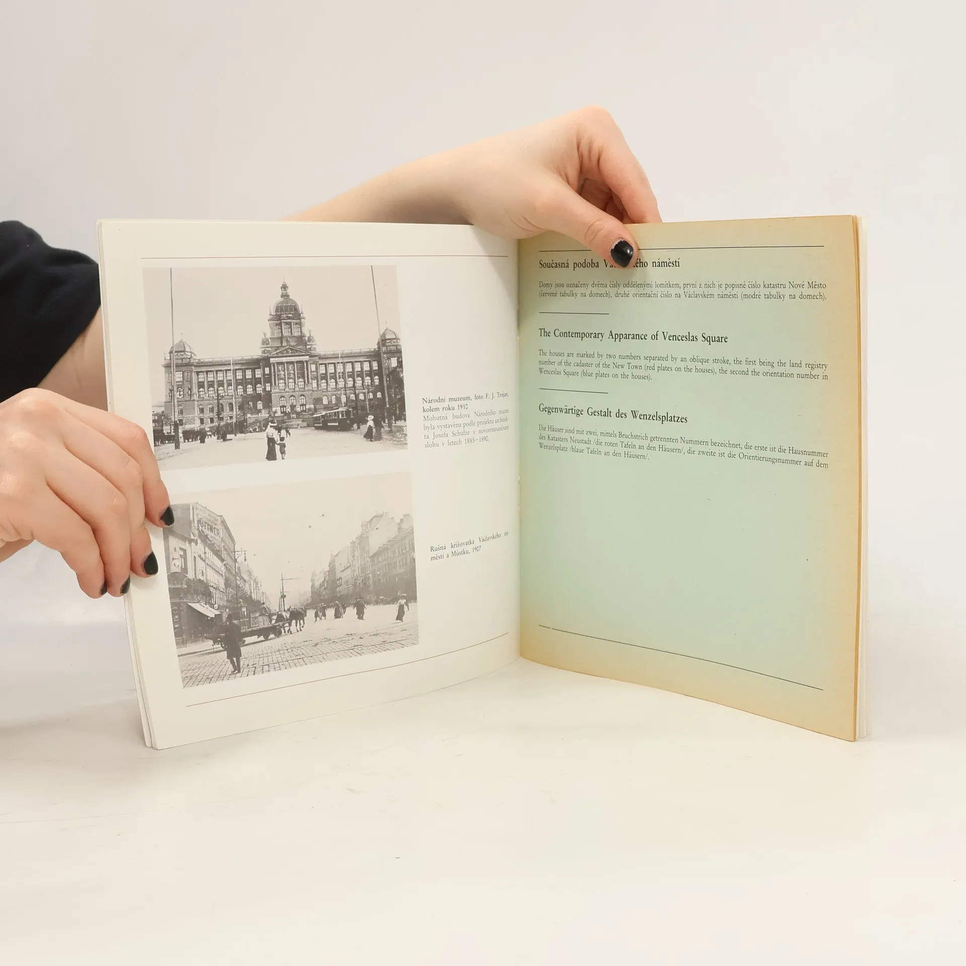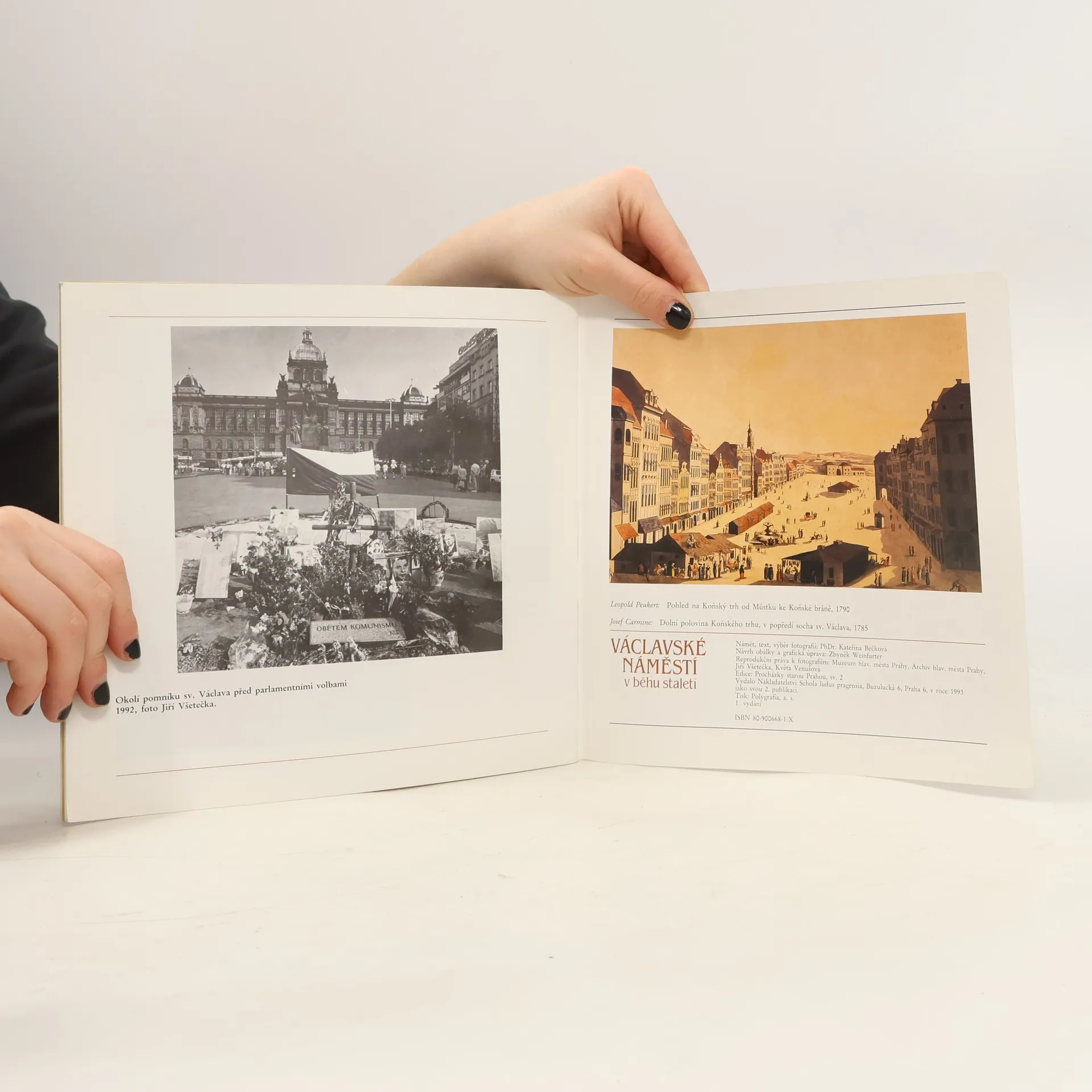 Proměny pražského Václavského náměstí v chronologickém sledu vedut a fotografií.// Soubor stručně komentovaných vyobrazení začíná reprodukcí výřezu ze Sadelerova prospektu z r. 1606 a končí fotografií Jiřího Všetečky zachycující okolí pomníku sv. Václava před parlamentními volbami r. 1992. Uprostřed brožury je vložena příloha se schématem podoby náměstí na konci 20. stol. (nákresy uliční řady domů s uvedením čísla popisného i orientačního, datací stavby a autorstvím projektu a příp. výzdoby či úprav).