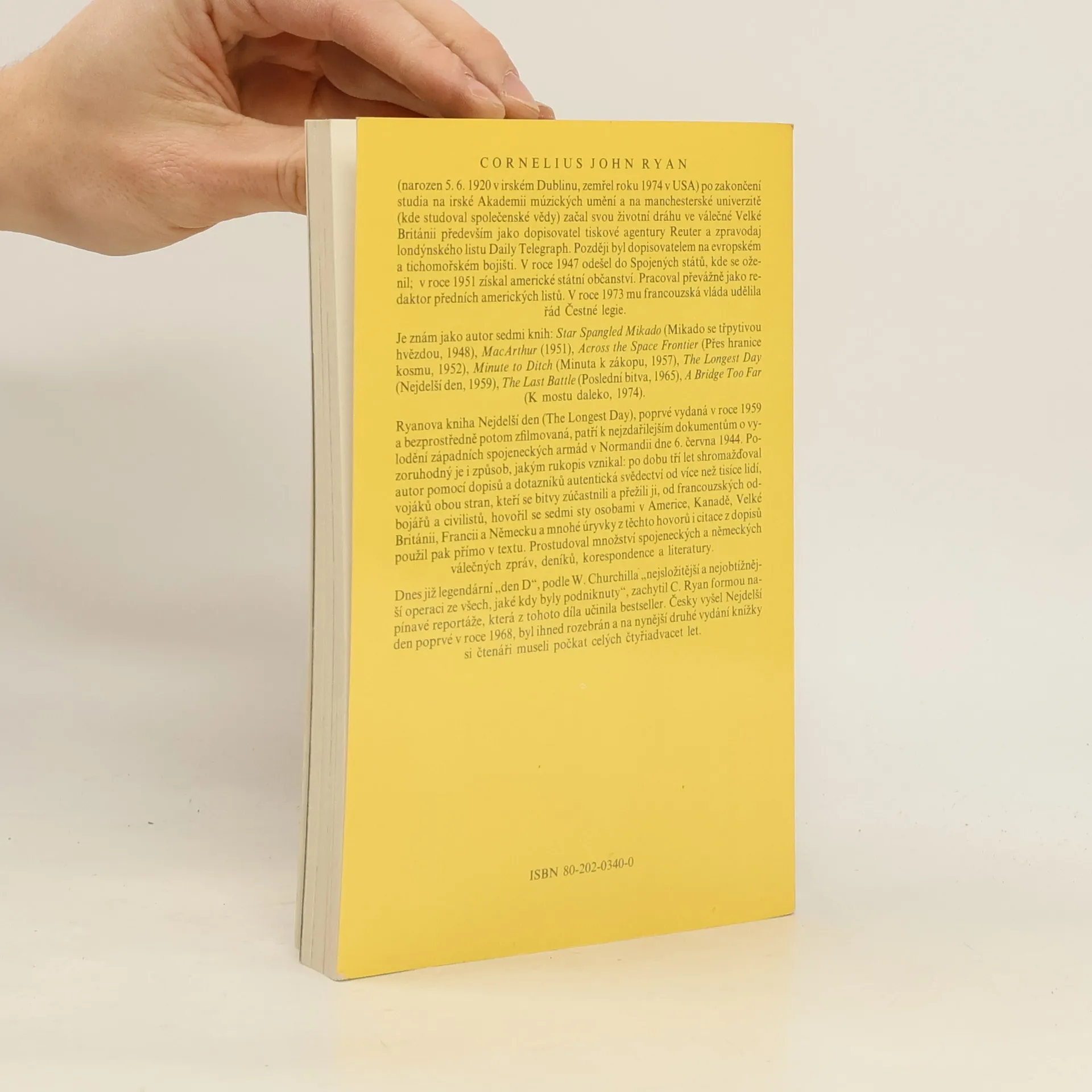 Kniha Nejdelší den je Ryanovým nejznámějším dílem a byla okamžitě po vydání zfilmována. Představuje zvláštní druh reportáže, založené na vzpomínkách přímých účastníků bitvy na pobřežích Normandie 6. června 1944 - v den vylodění spojeneckých armád. Cornelius Ryan se na tuto událost dívá očima roku 1959, kdy knihu vydal. Nebylo to již období studené války, ale ani období bezprostředně po úspěšném vylodění, kdy mezi spojenci ještě převládala atmosféra společného protifašistického boje. Hovoří-li autor ve své knize o zahájení invaze jako o „osudném dnu Hitlerovi třetí říše“, čtenář, orientující se v dějinách druhé světové války, pochopí, že se autor nechává unést pocitem příslušnosti k národům, které bojovaly na pobřežích Normandie, a opomíjí historií stvrzenou skutečnost, že spojenecká invaze byla po řadě odkladů zahájena v době, kdy osud hitlerovského Německa byl již zpečetěn a jeho konečná porážka se stala už jenom otázkou času. Svérázný způsob literárního zpracování historické události před čtyřiadvaceti lety vytváří z „Nejdelšího dne“ četbu nevšední a přitažlivou.... celý text