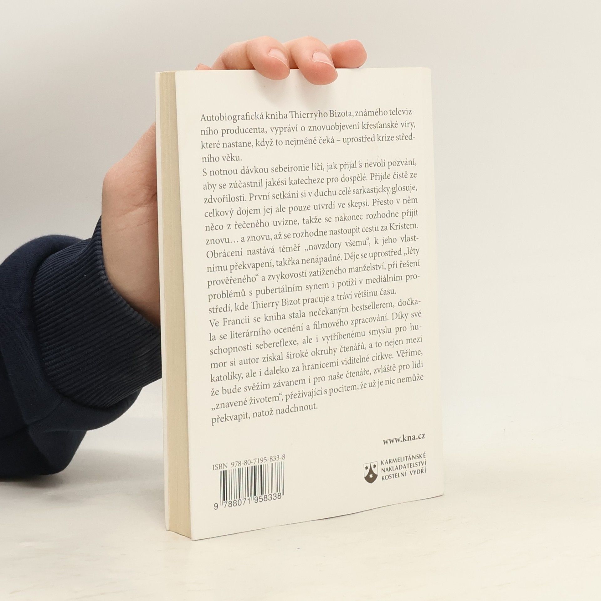 Autobiografická kniha Thierryho Bizota, známého televizního producenta, vypráví o znovuobjevení křesťanské víry, které nastane, když to nejméně čeká – uprostřed krize středního věku. S notnou dávkou sebeironie líčí, jak přijal s nevolí pozvání, aby se zúčastnil jakési katecheze pro dospělé. Přijde čistě ze zdvořilosti. První setkání si v duchu celé sarkasticky glosuje, celkový dojem jej ale pouze utvrdí ve skepsi. Přesto v něm něco z řečeného uvízne, takže se nakonec rozhodne přijít znovu… a znovu, až se rozhodne nastoupit cestu za Kristem. Obrácení nastává téměř „navzdory všemu“, k jeho vlastnímu překvapení, takřka nenápadně. Děje se uprostřed „léty prověřeného“ a zvykovostí zatíženého manželství, při řešení problémů s pubertálním synem i potíží v mediálním prostředí, kde Thierry Bizot pracuje a tráví většinu času. Ve Francii se kniha stala nečekaným bestsellerem, dočkala se literárního ocenění a filmového zpracování. Díky své schopnosti sebereflexe, ale i vytříbenému smyslu pro humor si autor získal široké okruhy čtenářů, a to nejen mezi katolíky, ale i daleko za hranicemi viditelné církve. Věříme, že bude svěžím závanem i pro naše čtenáře, zvláště pro lidi „znavené životem“, přežívající s pocitem, že už je nic nemůže překvapit, natož nadchnout.