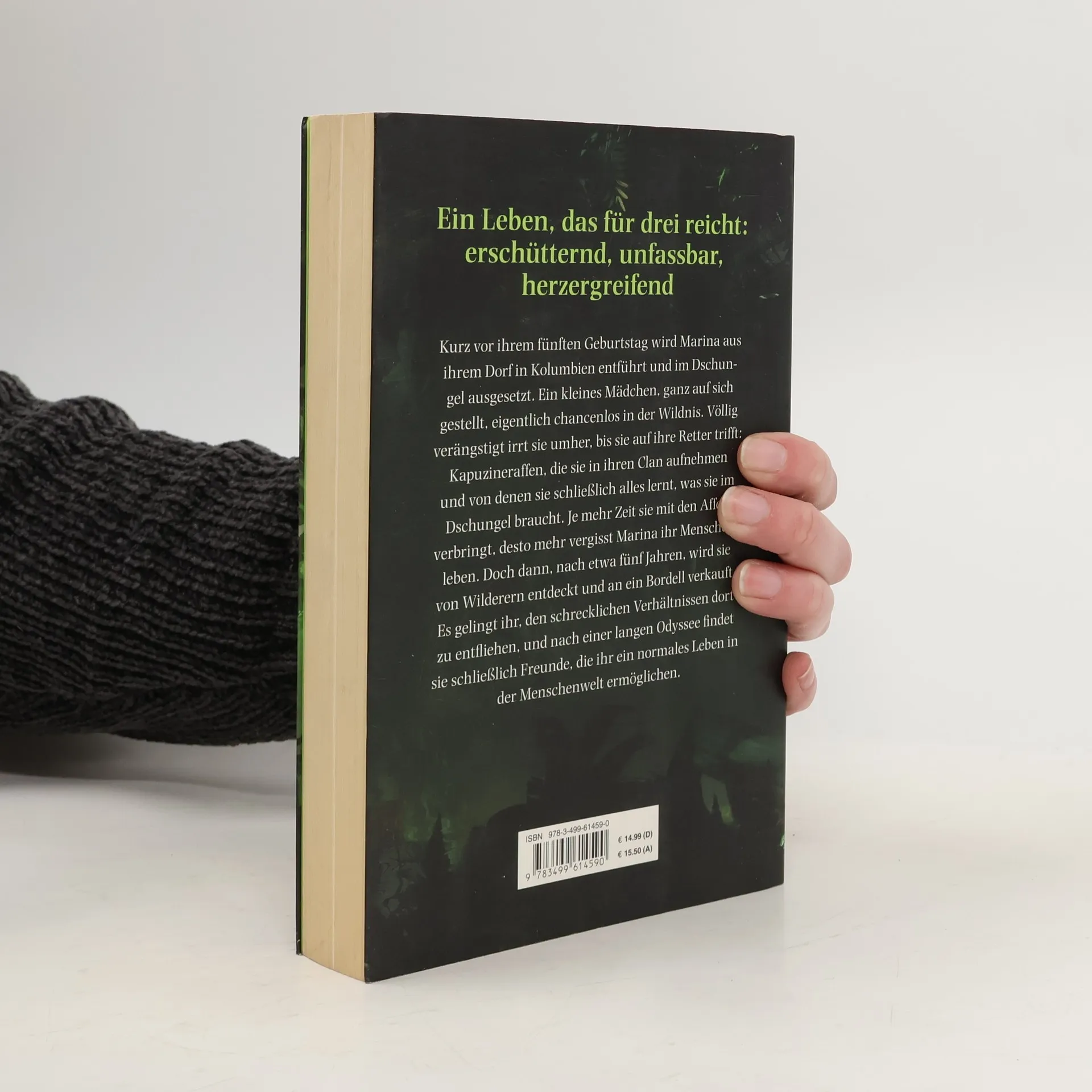 Ein Leben, das für drei reicht: erschütternd, unfassbar, herzergreifend. Kurz vor ihrem fünften Geburtstag wird Marina aus ihrem Dorf in Kolumbien entführt und im Dschungel ausgesetzt. Ein kleines Mädchen, ganz auf sich gestellt, eigentlich chancenlos in der Wildnis. Völlig verängstigt irrt sie umher, bis sie auf ihre Retter trifft: Kapuzineraffen, die sie in ihren Clan aufnehmen und von denen sie schließlich alles lernt, was sie im Dschungel braucht. Je mehr Zeit sie mit den Affen verbringt, desto mehr vergisst Marina ihr Menschenleben. Doch dann, nach etwa fünf Jahren, wird sie von Wilderern entdeckt und an ein Bordell verkauft. Es gelingt ihr, den schrecklichen Verhältnissen dort zu entfliehen, und nach einer langen Odyssee findet sie schließlich Freunde, die ihr ein normales Leben in der Menschenwelt ermöglichen.