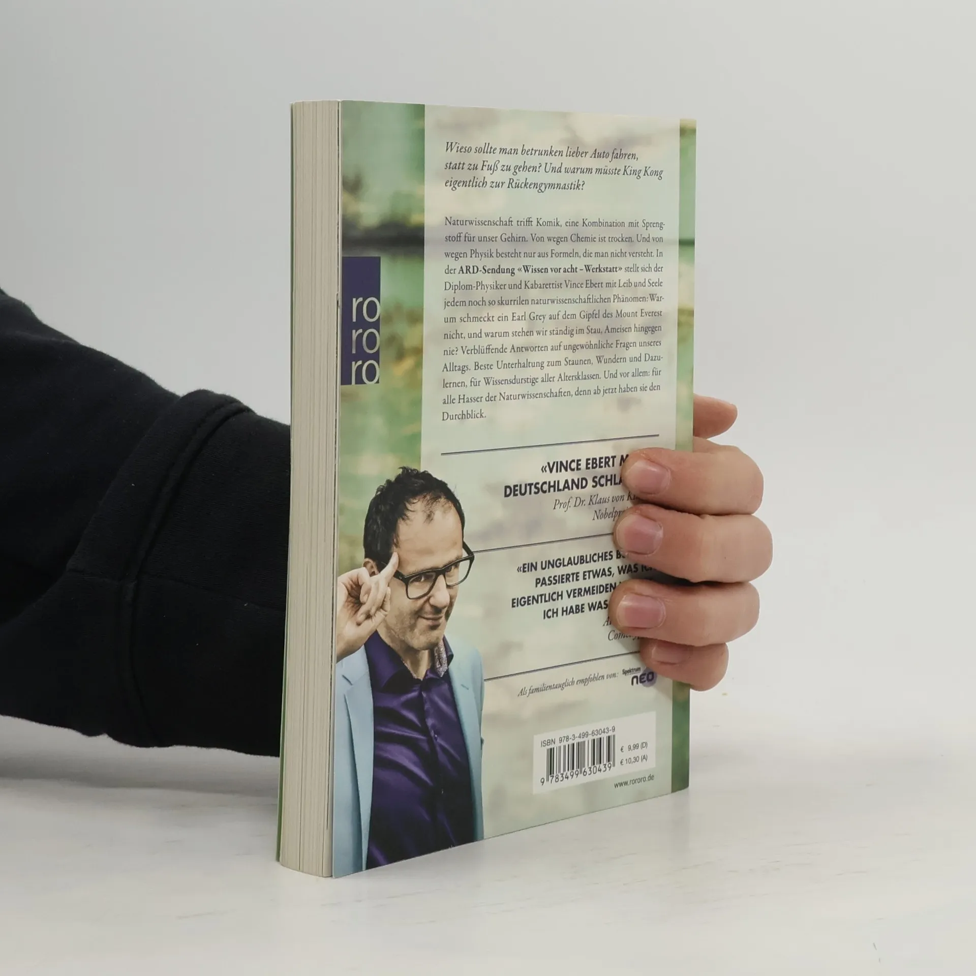 Wieso sollte man betrunken lieber Auto fahren, statt zu Fuß zu gehen? Und warum müsste King Kong eigentlich zur Rückengymnastik?Naturwissenschaft trifft Komik, eine Kombination mit Spreng-stoff für unser Gehirn. Von wegen Chemie ist trocken. Und von wegen Physik besteht nur aus Formeln, die man nicht versteht. In der ARD-Sendung «Wissen vor acht–Werkstatt» stellt sich der Diplom-Physiker und Kabarettist Vince Ebert mit Leib und Seele jedem noch so skurrilen naturwissenschaftlichen Phänomen: Warum schmeckt ein Earl Grey auf dem Gipfel des Mount Everest nicht, und warum stehen wir ständig im Stau, Ameisen hingegen nie? Verblüffende Antworten auf ungewöhnliche Fragen unseres Alltags. Beste Unterhaltung zum Staunen, Wundern und Dazulernen, für Wissensdurstige aller Altersklassen. Und vor allem: für alle Hasser der Naturwissenschaften, denn ab jetzt haben sie den Durchblick.