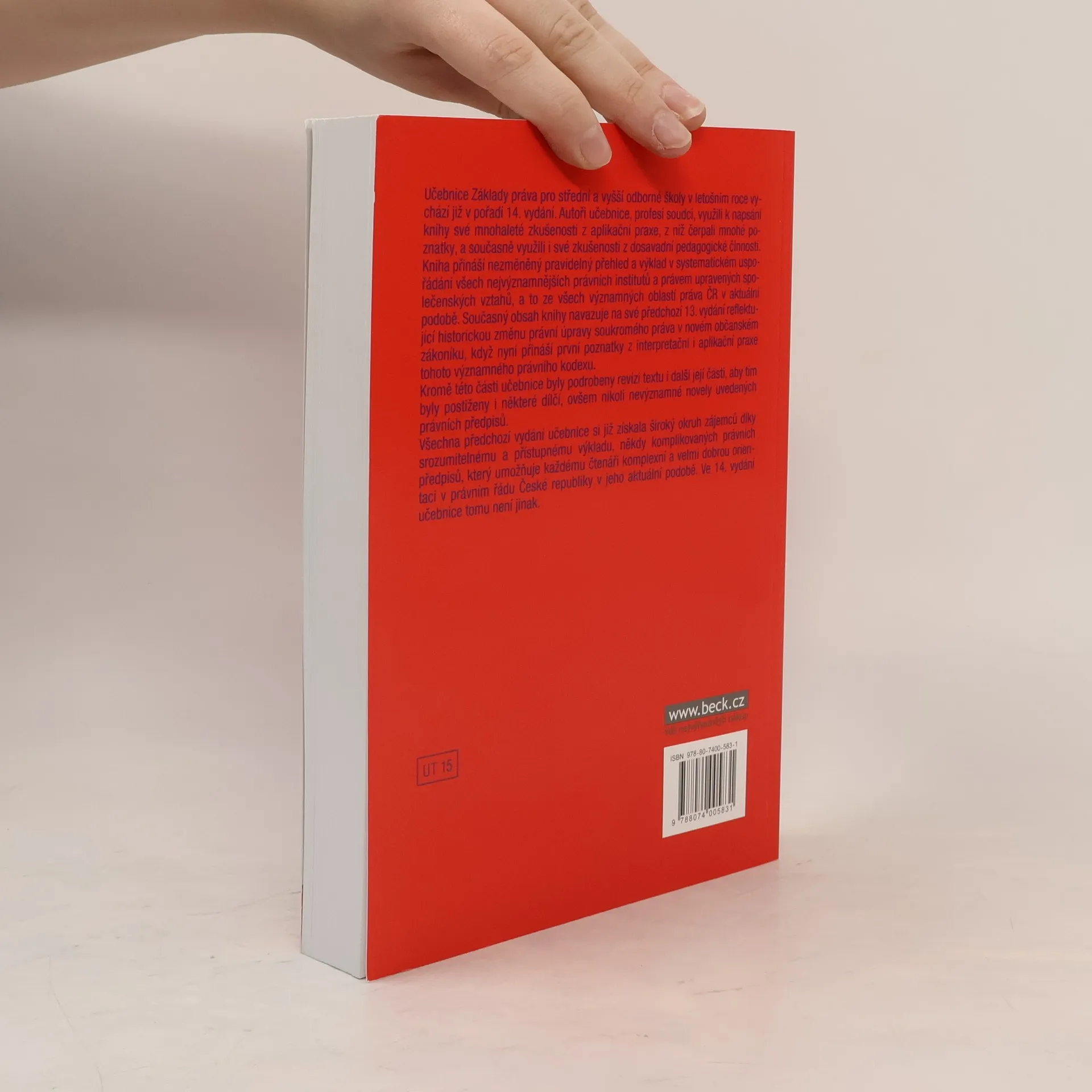 14. doplněné vydání. Autoři učebnice, profesí soudci, využili k napsání knihy své mnohaleté zkušenosti z aplikační praxe, z níž čerpali mnohé poznatky, a současně využili i své zkušenosti z dosavadní pedagogické činnosti. Kniha přináší nezměněný pravidelný přehled a výklad v systematickém uspořádání všech nejvýznamnějších právních institutů a právem upravených společenských vztahů, a to ze všech významných oblastí práva ČR v aktuální podobě. Současný obsah knihy navazuje na své předchozí 13. vydání reflektující historickou změnu právní úpravy soukromého práva v novém občanském zákoníku, když nyní přináší první poznatky z interpretační i aplikační praxe tohoto významného právního kodexu. Kromě této části učebnice byly podrobeny revizi textu i další její části, aby tím byly postiženy i některé dílčí, ovšem nikoli nevýznamné novely uvedených právních předpisů. Všechna předchozí vydání učebnice si již získala široký okruh zájemců díky srozumitelnému a přístupnému výkladu, někdy komplikovaných právních předpisů, který umožňuje každému čtenáři komplexní a velmi dobrou orientaci v právním řádu České republiky v jeho aktuální podobě. Ve 14. vydání učebnice tomu není jinak.