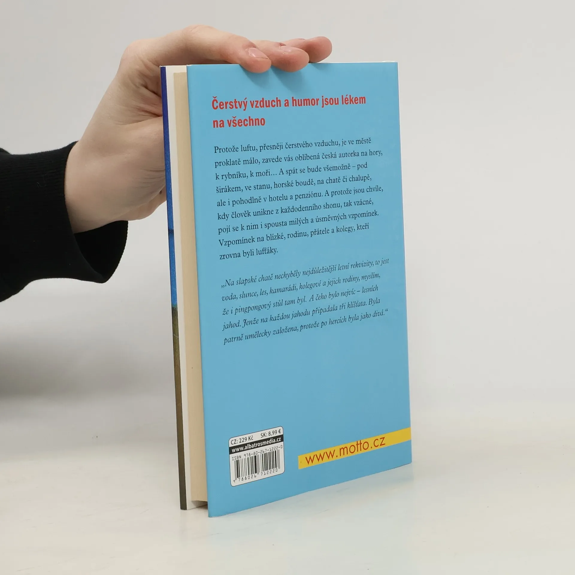 Protože luftu, přesněji čerstvého vzduchu, je ve městě proklatě málo, zavede vás oblíbená česká spisovatelka na hory, k rybníku, k moři… A spát se bude všemožně – pod širákem, ve stanu, horské boudě, na chatě či chalupě, ale i pohodlně v hotelu a penziónu. A protože jsou chvíle, kdy člověk unikne z každodenního shonu, tak vzácné, pojí se k nim i spousta milých a úsměvných vzpomínek. Vzpomínek na blízké, rodinu, přátele a kolegy, kteří zrovna byli lufťáky.