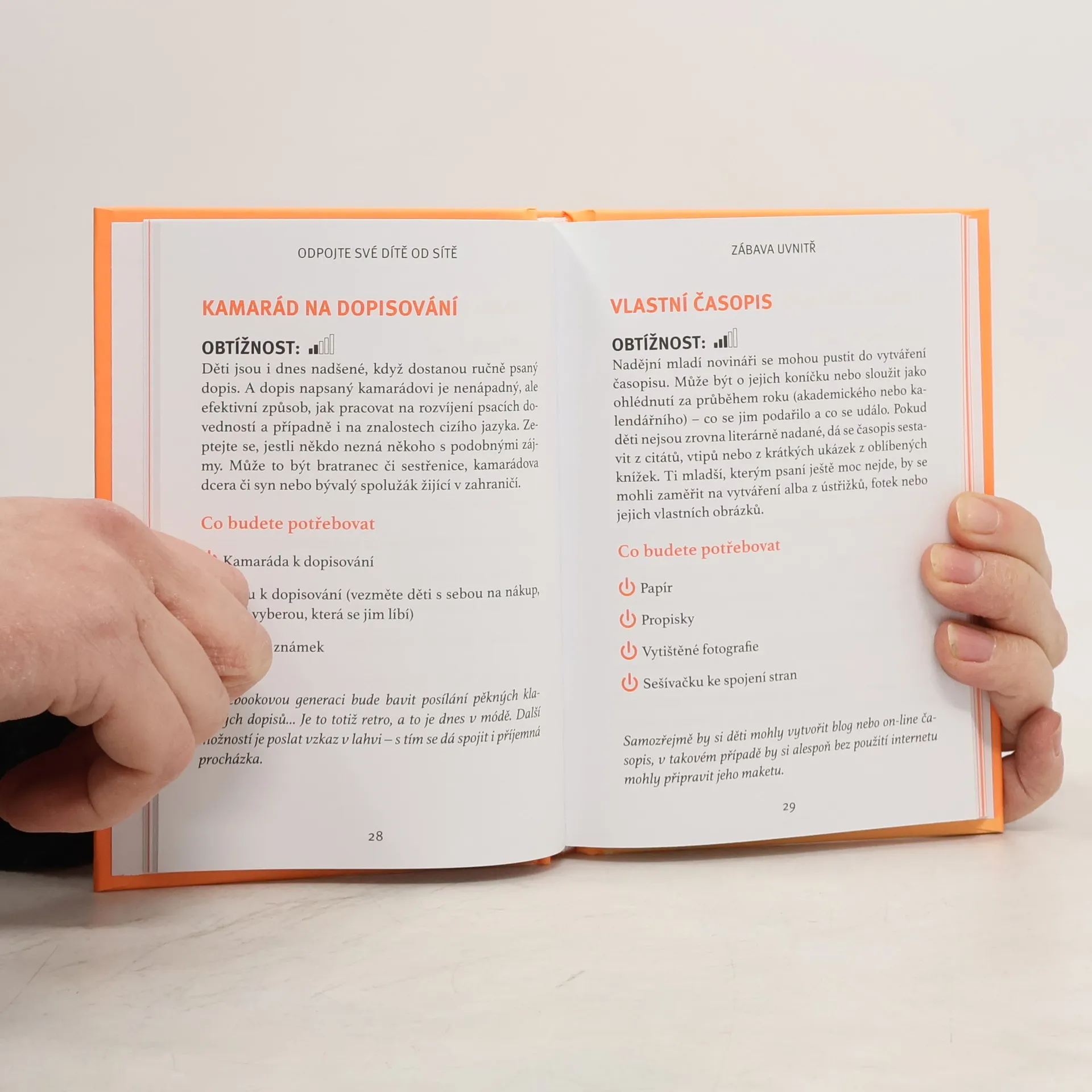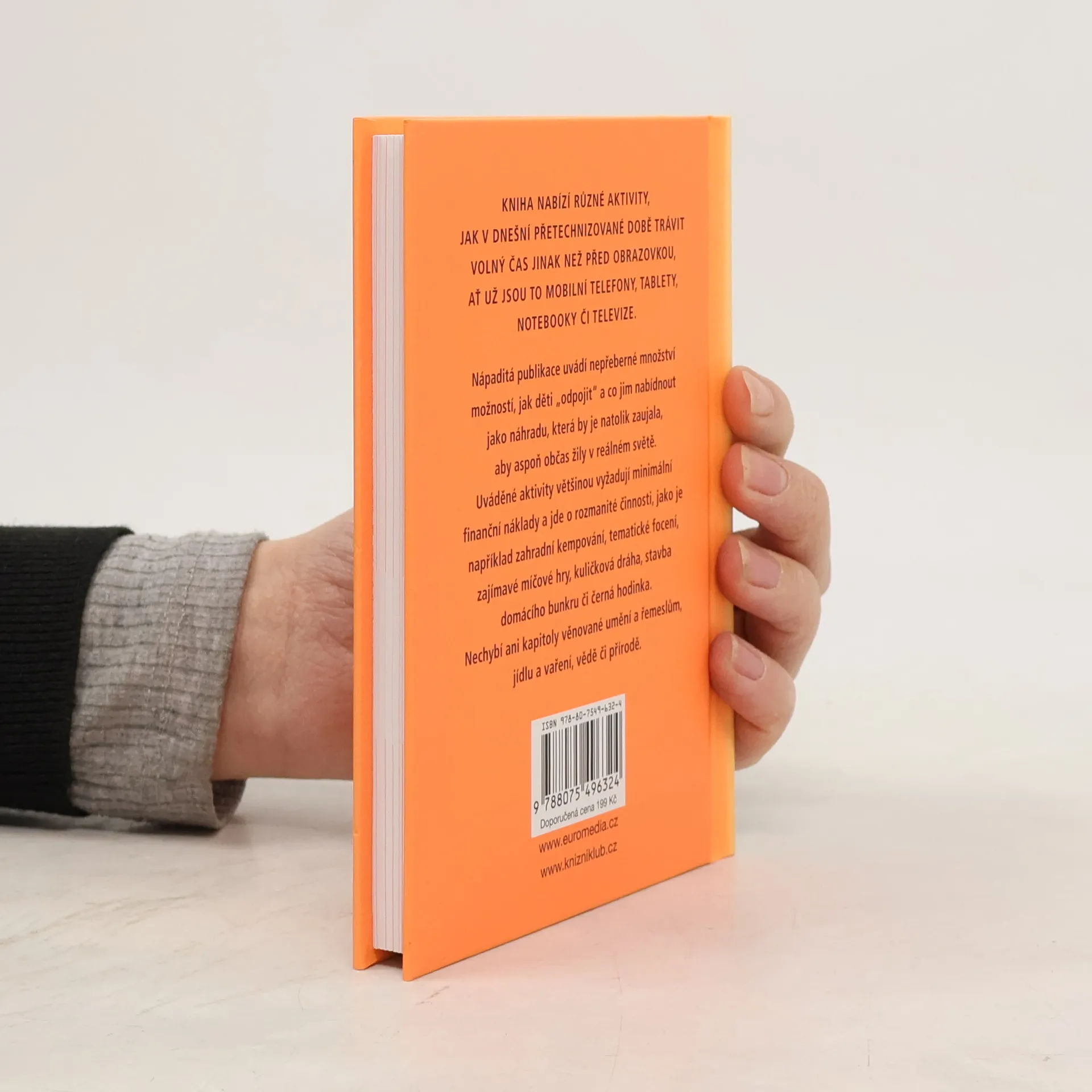 Kniha nabízí různé aktivity, jak v dnešní přetechnizované době trávit volný čas jinak než před obrazovkou, ať už jsou to mobilní telefony, tablety, notebooky či televize. Uvádí nepřeberné množství možností, jak děti „odpojit“ a co jim nabídnout jako náhradu, která by je natolik zaujala, aby aspoň občas žily v reálném světě. Uváděné aktivity vyžadují minimální finanční náklady a jde o rozmanité činnosti, například zahradní kempování, tematické focení, zajímavé míčové hry, závody papírových vlaštovek, večerní černá hodinka při vypnuté elektrice, nechybí ani kapitoly věnované uměn a řemeslům, jídlu a vaření, vědě či přírodě.