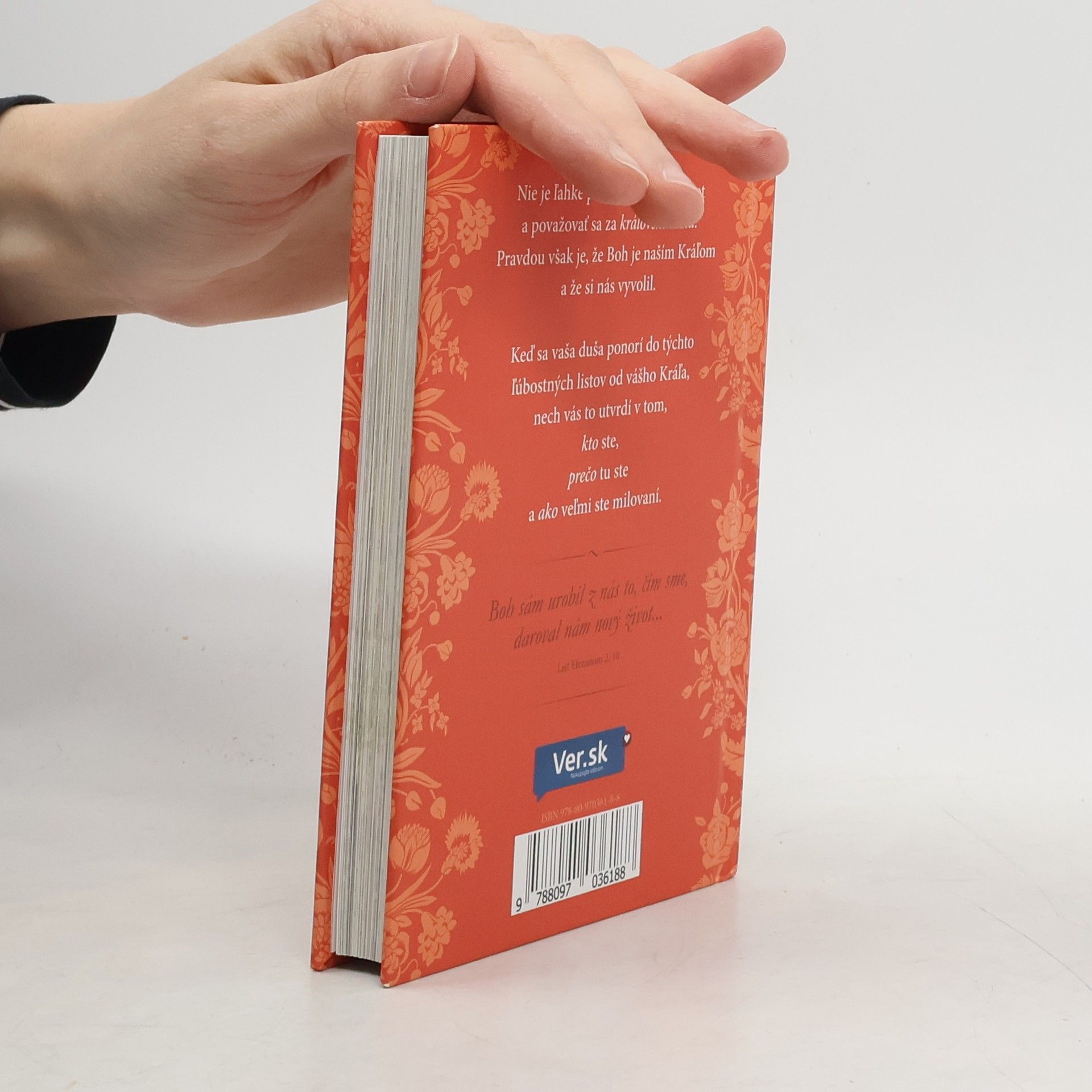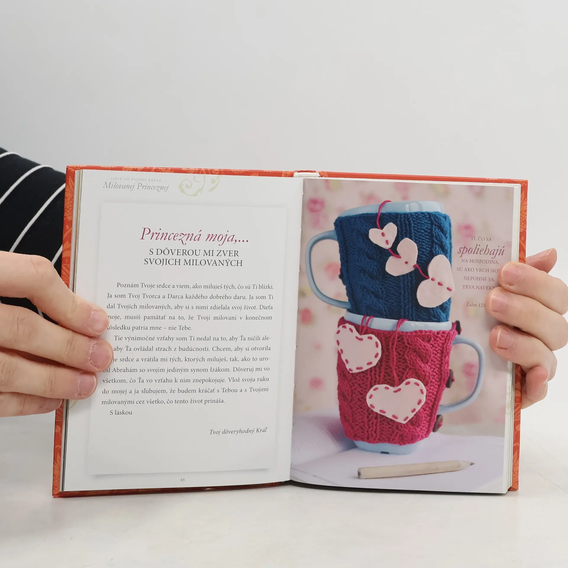 Kniha je plnofarebná, na jednej strane je list a na druhej strane nádherná fotka. Milovanej princeznej Princezná moja... ja som ti prišiel slúžiť. Aj keď necítiš, že by si Ťa druhí cenili, chcem Ti pripomenúť, Princezná moja, že ja, Tvoj Kráľ, som Ti prišiel slúžiť. Nielenže som Ťa stvoril, ja tiež udržiavam Tvoj život, utešujem Tvojho ducha a poskytujem Ti, čo potrebuješ. Si taká cenná, že som za Teba zaplatil na kríži tú najvyššiu cenu, aby som Ťa vykúpil, dieťa moje. Ja dokážem vziať každé zlyhanie alebo chybu, ktoré si urobila, a zázračne si ich použiť na moju slávu. Som trpezlivý, milosrdný a láskavý – ja som Láska. Teraz, keď vieš, že som Ti odpustil hriechy, žiadam Ťa, aby si sa odvrátila od toho, kým si bola a stala sa takou, akou som Ťa povolal byť. Dovoľ mi pomôcť Ti. Ja som Tvoj Pán, ktorý Ťa miluje za každých okolností. S láskou Tvoj Kráľ, ktorý prišiel kvôli Tebe...