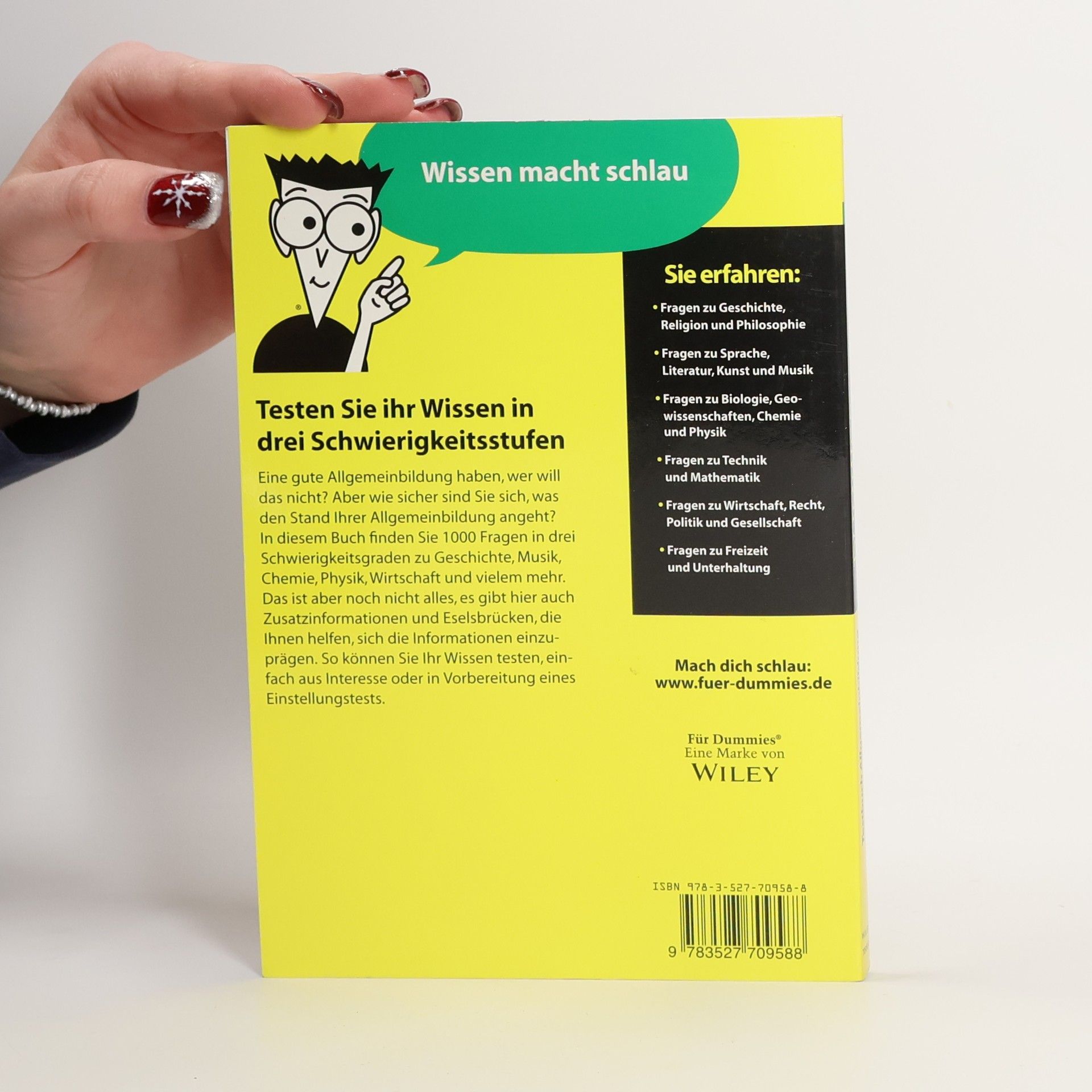 Eine gute Allgemeinbildung hat so Ihre Vorteile. Viele Menschen beurteilen im Privat- und im Berufsleben Menschen danach, was sie so von dem wissen, was sie wissen sollten. Dieses Buch hilft Ihnen, Ihr Wissen zu testen. So erfahren Sie, wie solide Ihr Wissen zu Geschichte, Literatur, Philosophie, Chemie, Biologie, Mathematik und vielen anderen Gebieten ist. Das Buch hilft Ihnen, wenn Sie Schwachstellen in Ihrer Bildung entdecken wollen oder auch einfach nur Spaß daran haben, sich selbst zu testen.
