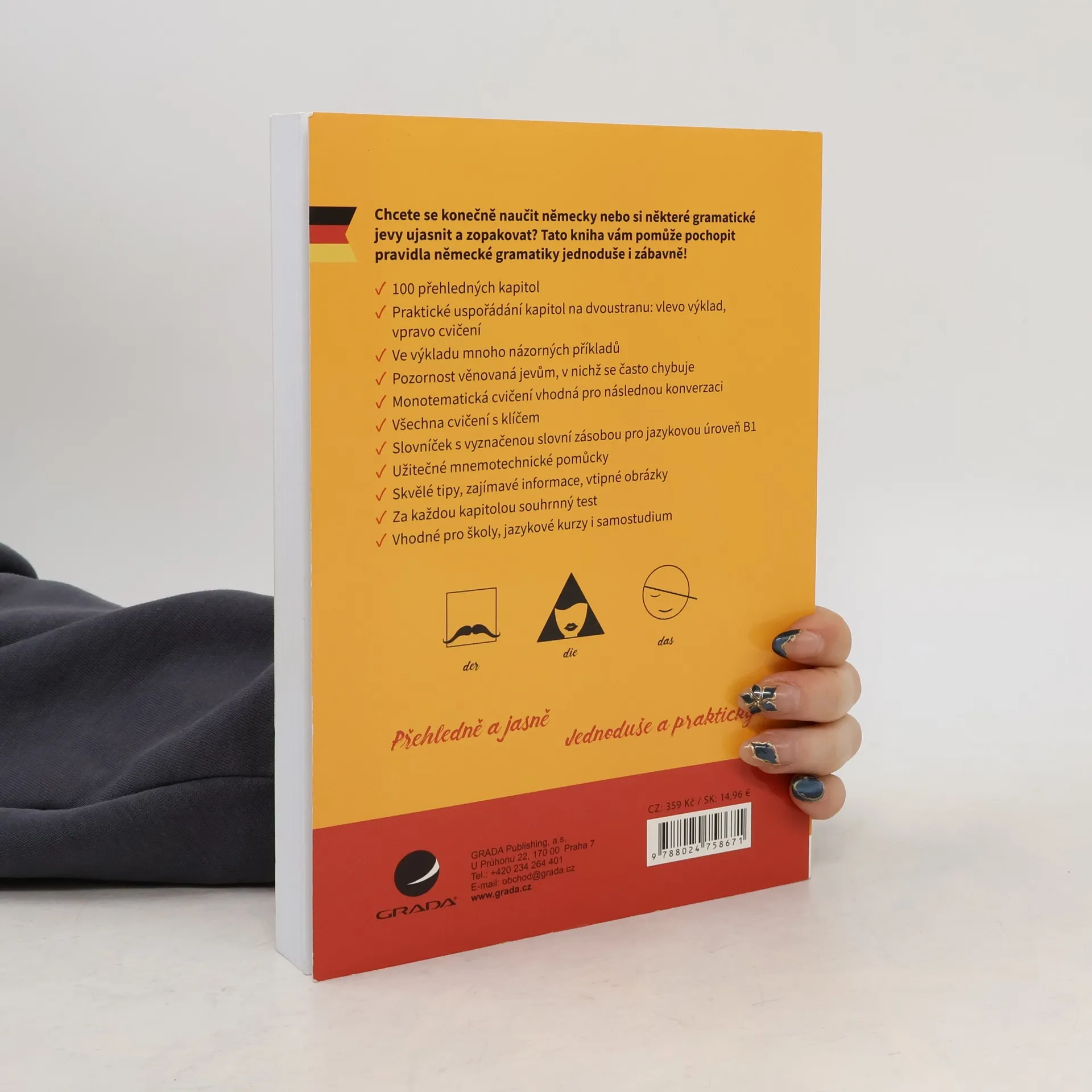 Chcete se konečně naučit německy nebo si některé gramatické jevy ujasnit a zopakovat? Tato kniha vám pomůže pochopit pravidla německé gramatiky jednoduše i zábavně! 100 přehledných kapitol Praktické uspořádání kapitol na dvoustranu: vlevo výklad, vpravo cvičení Ve výkladu mnoho názorných příkladů Pozornost věnovaná jevům, v nichž se často chybuje Monotematická cvičení vhodná pro následnou konverzaci Všechna cvičení s klíčem Slovníček s vyznačenou slovní zásobou pro jazykovou úroveň B1 Užitečné mnemotechnické pomůcky Skvělé tipy, zajímavé informace, vtipné obrázky Za každou kapitolou souhrnný test Vhodné pro školy, jazykové kurzy i samostudium Přehledně a jasně! Jednoduše a prakticky!