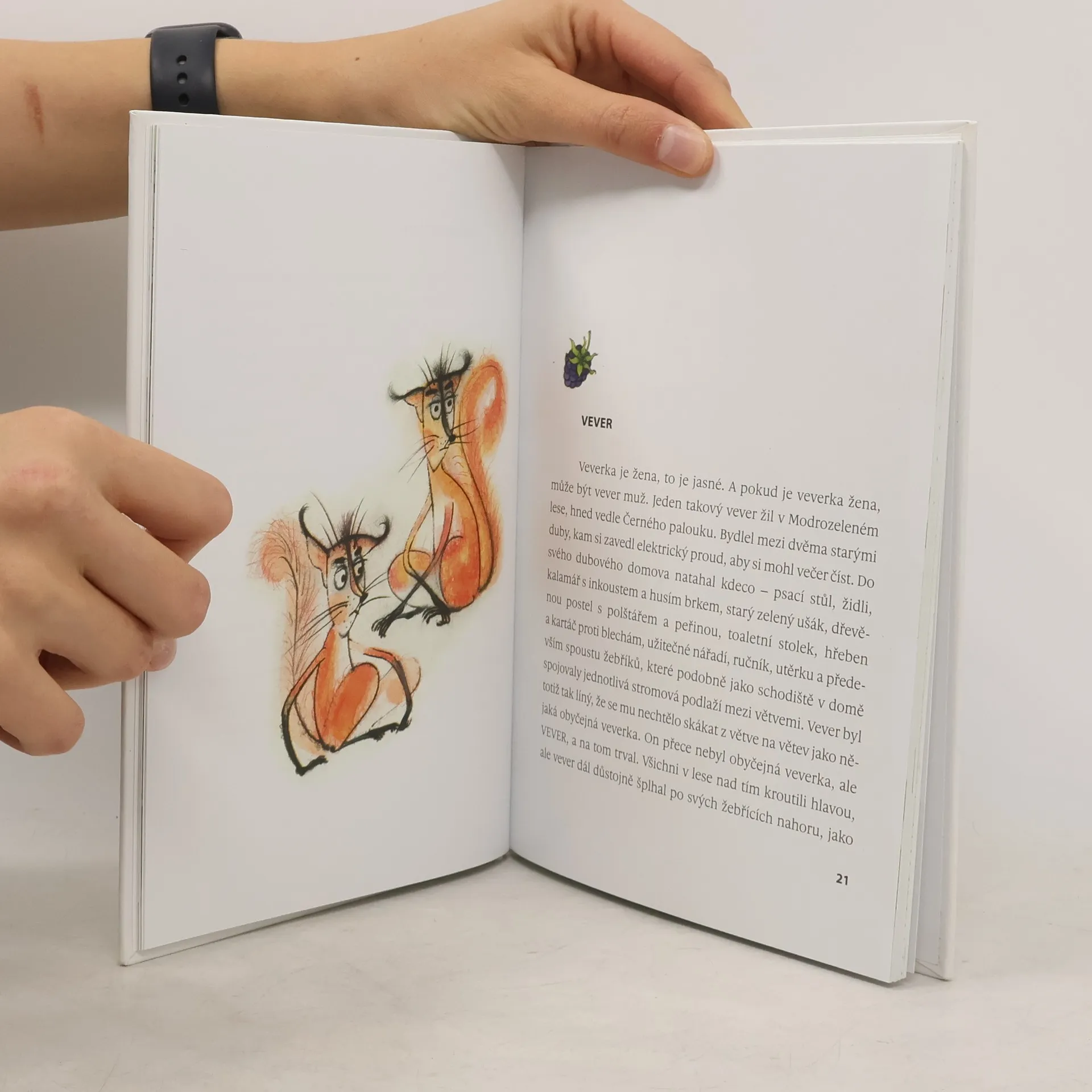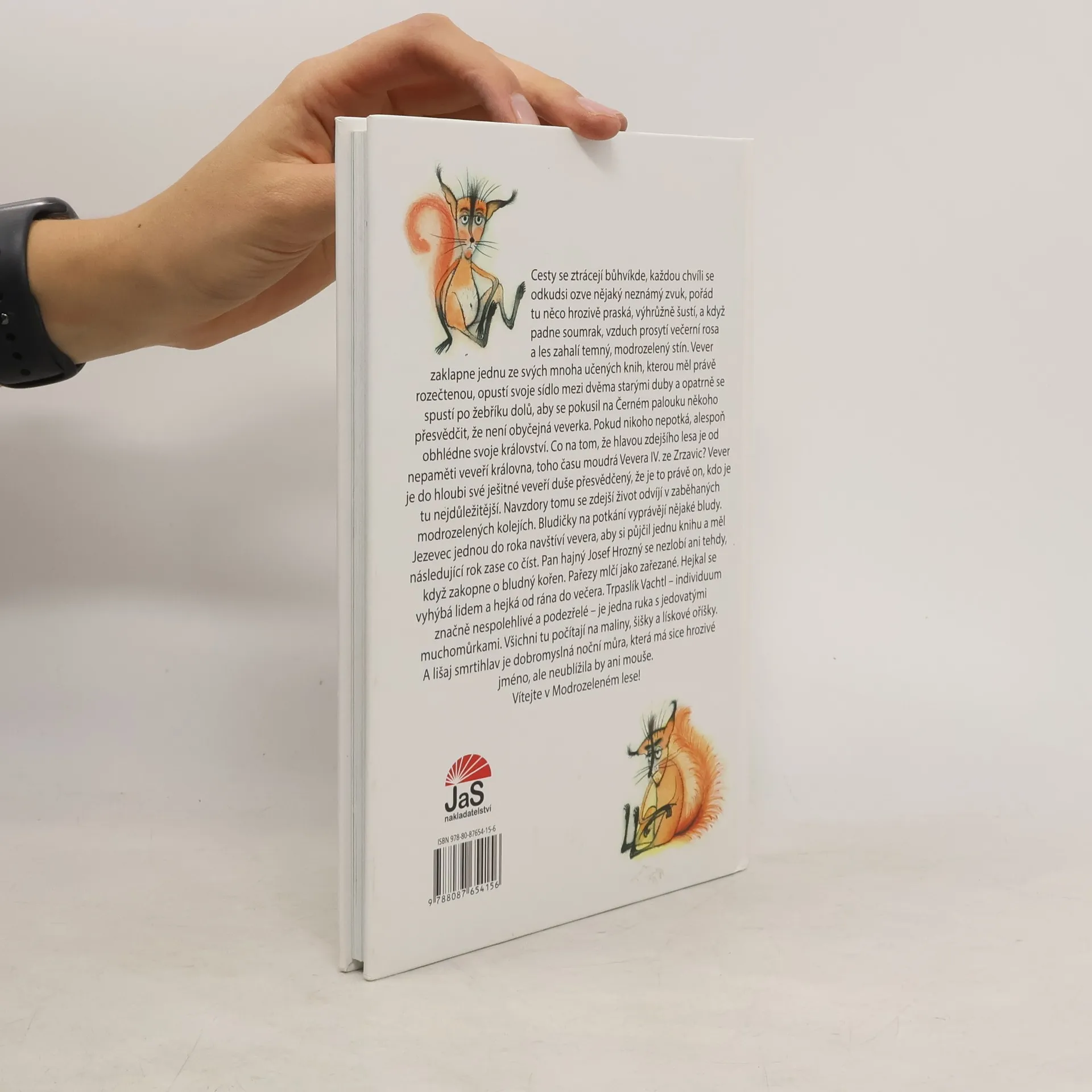 Cesty se ztrácejí bůhvíkde, každou chvíli se odkudsi ozve nějaký neznámý zvuk, pořád tu něco hrozivě praská, výhrůžně šustí, a když padne soumrak, vzduch prosytí večerní rosa a les zahalí temný, modrozelený stín. Vever zaklapne jednu ze svých mnoha učených knih, kterou měl právě rozečtenou, opustí svoje sídlo mezi dvěma starými duby a opatrně se spustí po žebříku dolů, aby se pokusil na Černém palouku někoho přesvědčit, že není obyčejná veverka. Pokud nikoho nepotká, alespoň obhlédne svoje království. Co na tom, že hlavou zdejšího lesa je od nepaměti veveří královna, toho času moudrá Vevera IV. ze Zrzavic? Vever je do hloubi své ješitné veveří duše přesvědčený, že je to právě on, kdo je tu nejdůležitější. Navzdory tomu se zdejší život odvíjí v zaběhaných modrozelených kolejích. Bludičky na potkání vyprávějí nějaké bludy. Jezevec jednou do roka navštíví vevera, aby si půjčil jednu knihu a měl následující rok zase co číst. Pan hajný Josef Hrozný se nezlobí ani tehdy, když zakopne o bludný kořen. Pařezy mlčí jako zařezané. Hejkal se vyhýbá lidem a hejká od rána do večera. Trpaslík Vachtl - individuum značně nespolehlivé a podezřelé - je jedna ruka s jedovatými muchomůrkami. Všichni tu počítají na maliny, šišky a lískové oříšky. A lišaj smrtihlav je dobromyslná noční můra, která má sice hrozivé jméno, ale neublížila by ani mouše. Vítejte v Modrozeleném lese!