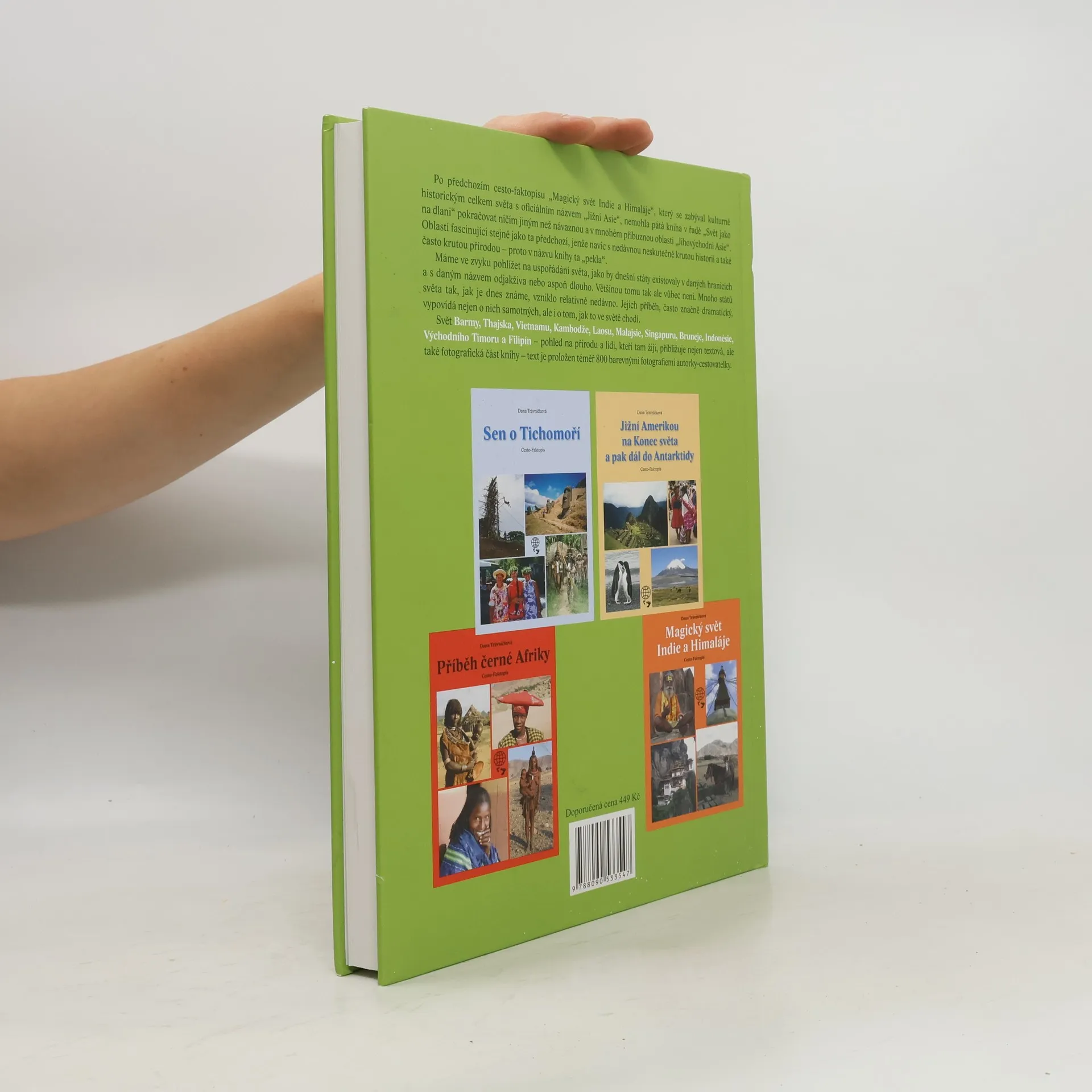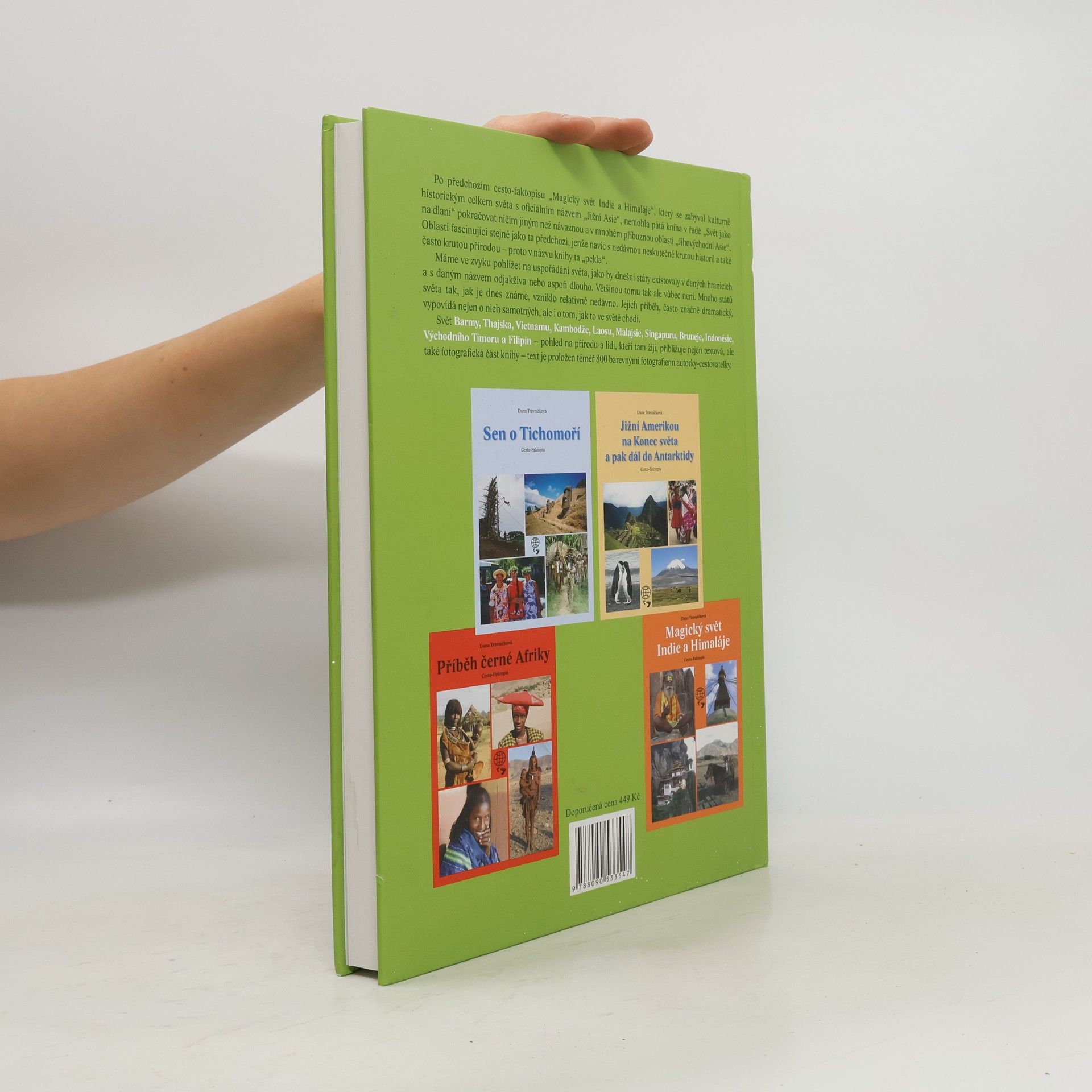 Cesto-faktopis „O rájích a peklech Jihovýchodní Asie“ (již pátý v cesto-faktopisné řadě „Svět jako na dlani“) přináší čtenářsky přívětivý pohled na historii, přírodu, kulturu a etnika této části světa. Barvitý příběh zdejších zemí je podán v souvislostech, vzájemných vztazích i s vazbami ke světu. Vypovídá nejen o nich samotných. Název knihy není náhodný – tento kulturně-historický celek světa zažil nejen nesmírně kruté události, ale také nádherná příroda mu občas ukazuje svou nelítostnou tvář – proto v názvu knihy ta „pekla“. Svět Barmy, Thajska, Vietnamu, Kambodže, Laosu, Malajsie, Singapuru, Bruneje, Indonésie, Východního Timoru a Filipín přibližuje textová i fotografická část knihy – do textu je integrálně zapracováno 800 barevných fotografií a názorných mapek v kvalitním tiskovém provedení.