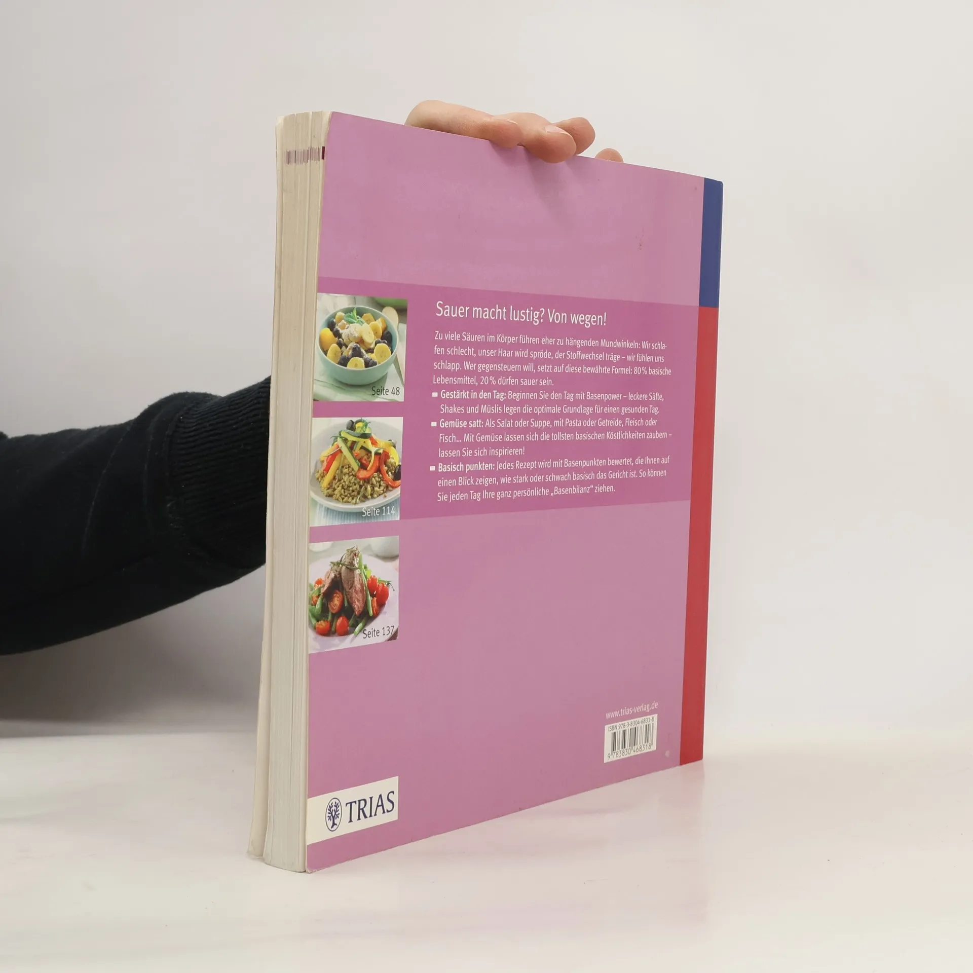 Gestärkt in den Tag: Beginnen Sie den Tag mit Basenpower - leckere Säfte, Shakes und Müslis legen die optimale Grundlage für einen gesunden Tag. Gemüse satt: Als Salat oder Suppe, mit Pasta oder Getreide, Fleisch oder Fisch - mit Gemüse lassen sich die tollsten basische Köstlichkeit zaubern - lassen Sie sich inspirieren! Basisch punkten: Jedes Rezept wird mit Basenpunkten bewertet, die Ihnen auf einen Blick zeigen, wie stark oder schwach basisch das Gericht ist. So können Sie jeden Tag Ihre ganz persönliche „Basenbilanz“ ziehen. Sabine Wacker ist Heilpraktikerin mit Medizinstudium (1. Staatsexamen). Sie hat sich auf Ernährungsberatung und Entgiftungstherapien spezialisiert. Zusammen mit ihrem Mann Dr. med. Andreas Wacker hat sie Basenfasten - Die Wacker-Methode® - entwickelt. Bei Haug sind zur Wacker-Methode® acht Titel erschienen, außerdem: „In Balance mit Schüßler-Salzen“ und „Natürlich entgiften“. Sauer macht lustig? Von wegen! Zu viele Säuren im Körper führen eher zu hängenden Mundwinkeln: Wir schlafen schlecht, unser Haar wird spröde, der Stoffwechsel träge - wir fühlen uns schlapp. Wer gegensteuern will, setzt auf diese bewährte Formel: 80 % basische Lebensmittel, 20 % dürfen sauer sein.
