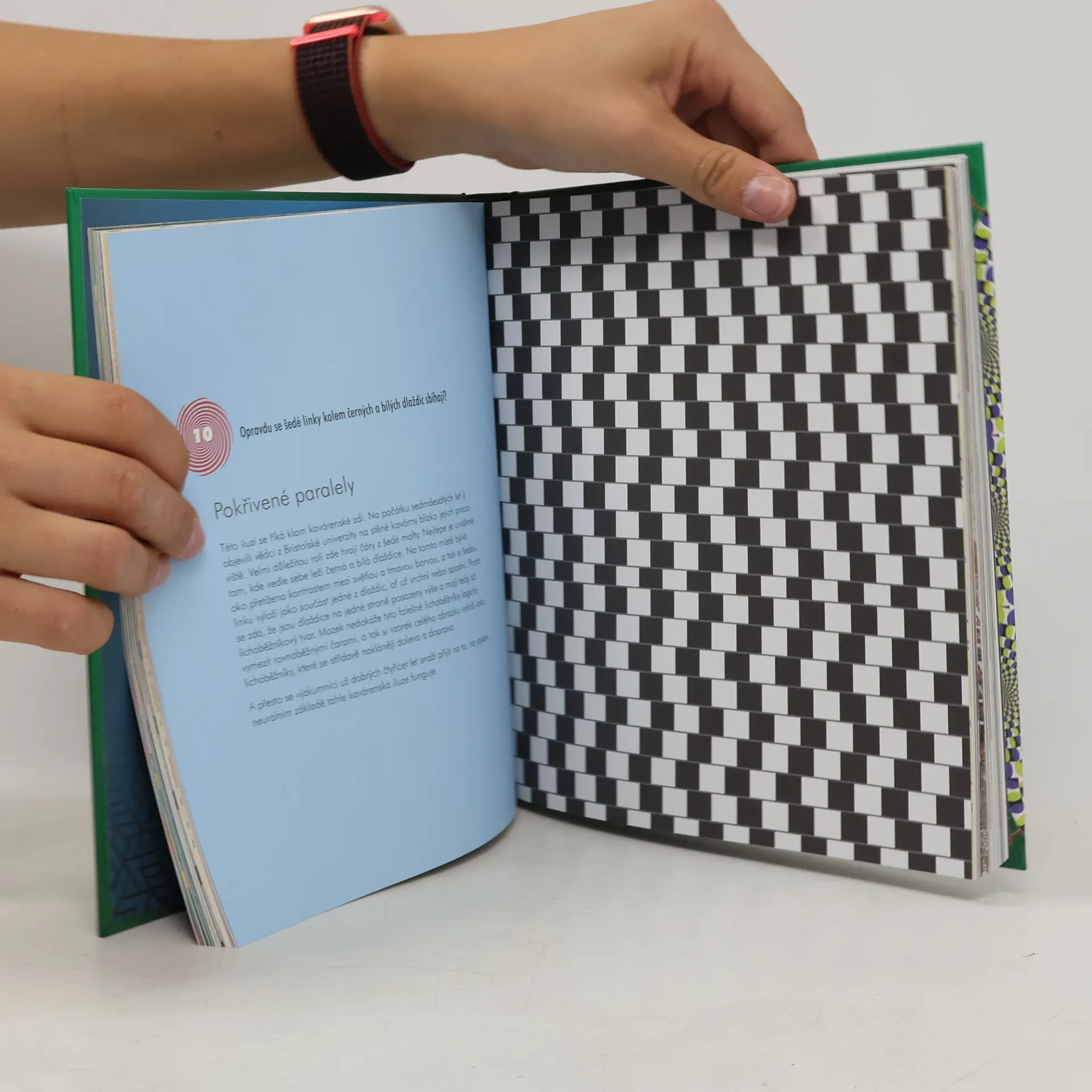 Optická iluze má dva prvky. Jeden je vnímání toho, co vidíte. Může se jednat o spojování čar, pohyblivé tvary nebo zdánlivě nestejné velikosti. Druhým prvkem je vědecké vysvětlení nebo neuronální základ iluze. A zde vám pomůže Kniha optických klamů, která se zabývá druhým prvkem: vědeckým vysvětlením klamu. Stručný úvod popisuje historii optických iluzí a jejich původ. Některé pocházejí až ze starověku (jako na Maltě nalezená 3D římská mozaika z 2. století při n. l.) a jiné jsou moderní (jako emotikony a pouliční umění). Kniha obsahuje práce skvělých iluzionistů, jako např. M.C. Escher, a známé klamy, jako je Nemožný trojúhelník nebo portrét Albert Einstein / Marilyn Monroe. Další klamy: Vidění věci, které tam nejsou, jenž byl objeven na stěně studia BBC v padesátých letech minulého století. Tato iluze obsahuje stíny, které vypadají, že se sbíhají ve sloupcích nahoru a dolů. A samozřejmě spousta dalších.