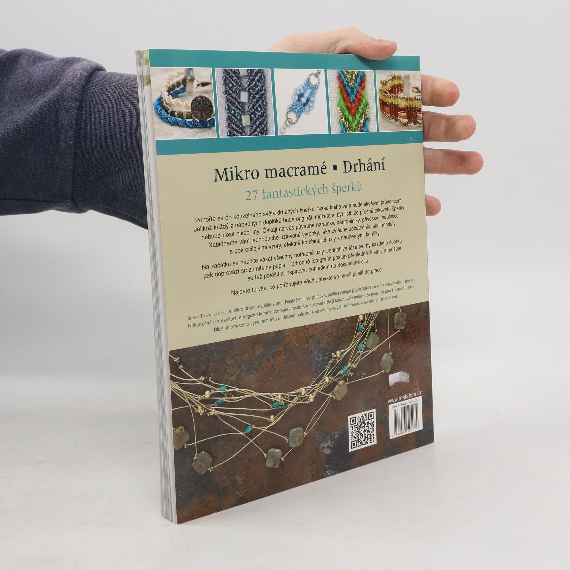 27 fantastických drhaných šperků, vhodné i pro začátečníky, s podrobným popisem postupů a technik Ponořte se do kouzelného světa drhaných šperků. Kniha Jenny Townleyové vám bude skvělým průvodcem. Jelikož každý z nápaditých doplňků bude originál, můžete si být jistí, že přesně takovéto šperky nebude nosit nikdo jiný. Čekají na vás půvabné náramky, náhrdelníky, přívěsky i náušnice. Nabídneme vám jednoduché uzlované výrobky, jaké zvládne začátečník, ale i modely s pokročilejšími vzory, efektně kombinující uzly s nádhernými korálky. Na začátku se naučíte vázat všechny potřebné uzly. Jednotlivé fáze tvorby každého šperku pak doprovází srozumitelný popis. Podrobné fotografie postup přehledně ilustrují a můžete se též potěšit a inspirovat pohledem na dokončené dílo. Najdete tu vše, co potřebujete vědět, abyste se mohli pustit do práce.