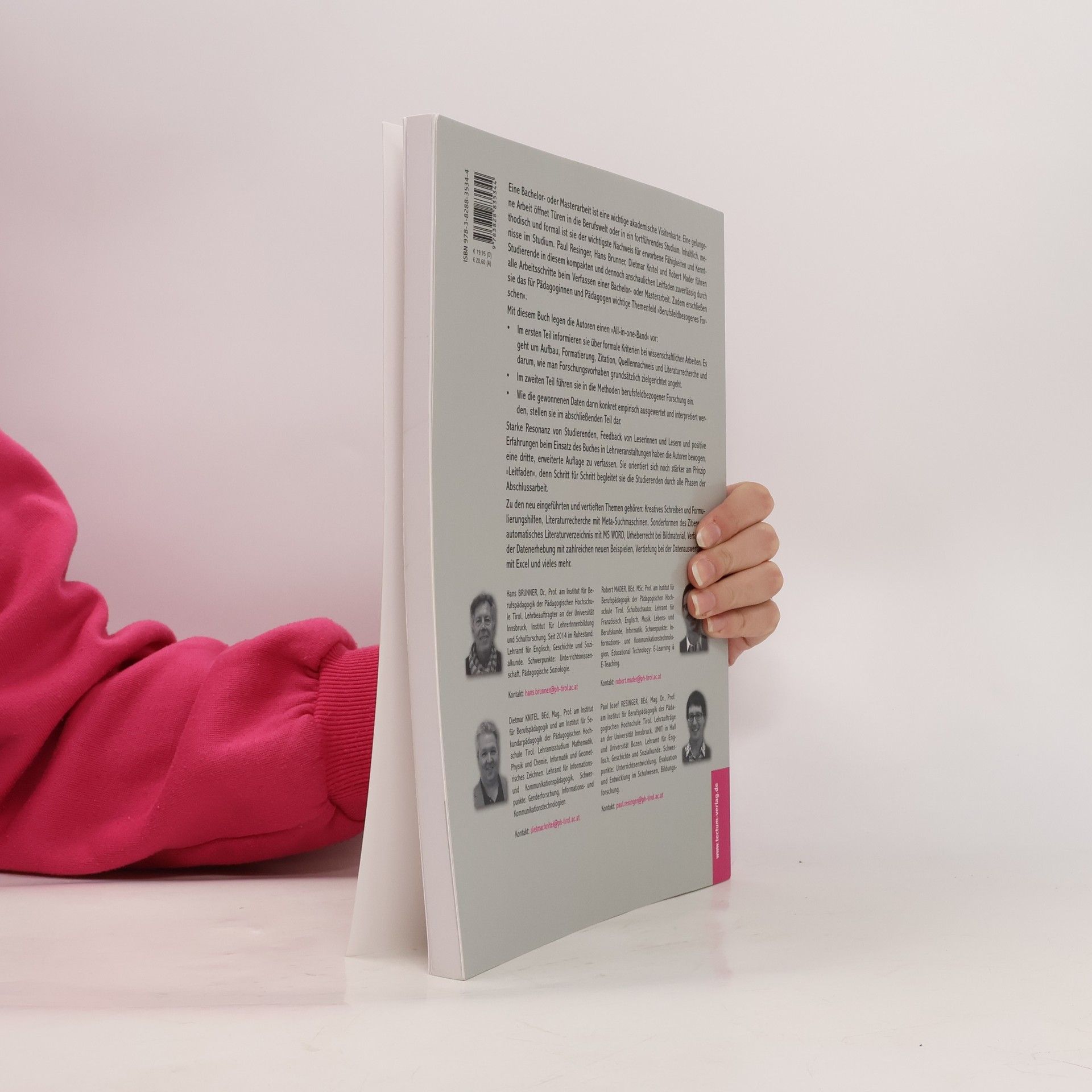 In diesem kompakten und anschaulichen Leitfaden führen Paul Resinger, Hans Brunner und Dietmar Knitel Studierende zuverlässig durch alle Arbeitsschritte beim Verfassen einer Bachelor- oder Masterarbeit. Starke Resonanz von Studierenden, Leserfeedback und positive Erfahrungen beim Einsatz des Buchs in Lehrveranstaltungen haben die Autoren bewogen, eine dritte, erweiterte Auflage zu verfassen. Sie orientiert sich noch stärker am Prinzip „Leitfaden“, denn Schritt für Schritt begleitet sie die Studierenden durch alle Phasen der Abschlussarbeit. Zu den neu eingeführten oder vertieften Themen gehören: Kreatives Schreiben als Hilfsmittel, Urheberrecht bei Bildmaterial, Tools für empirische Erhebungen, Datenauswertung mit Excel und vieles mehr.