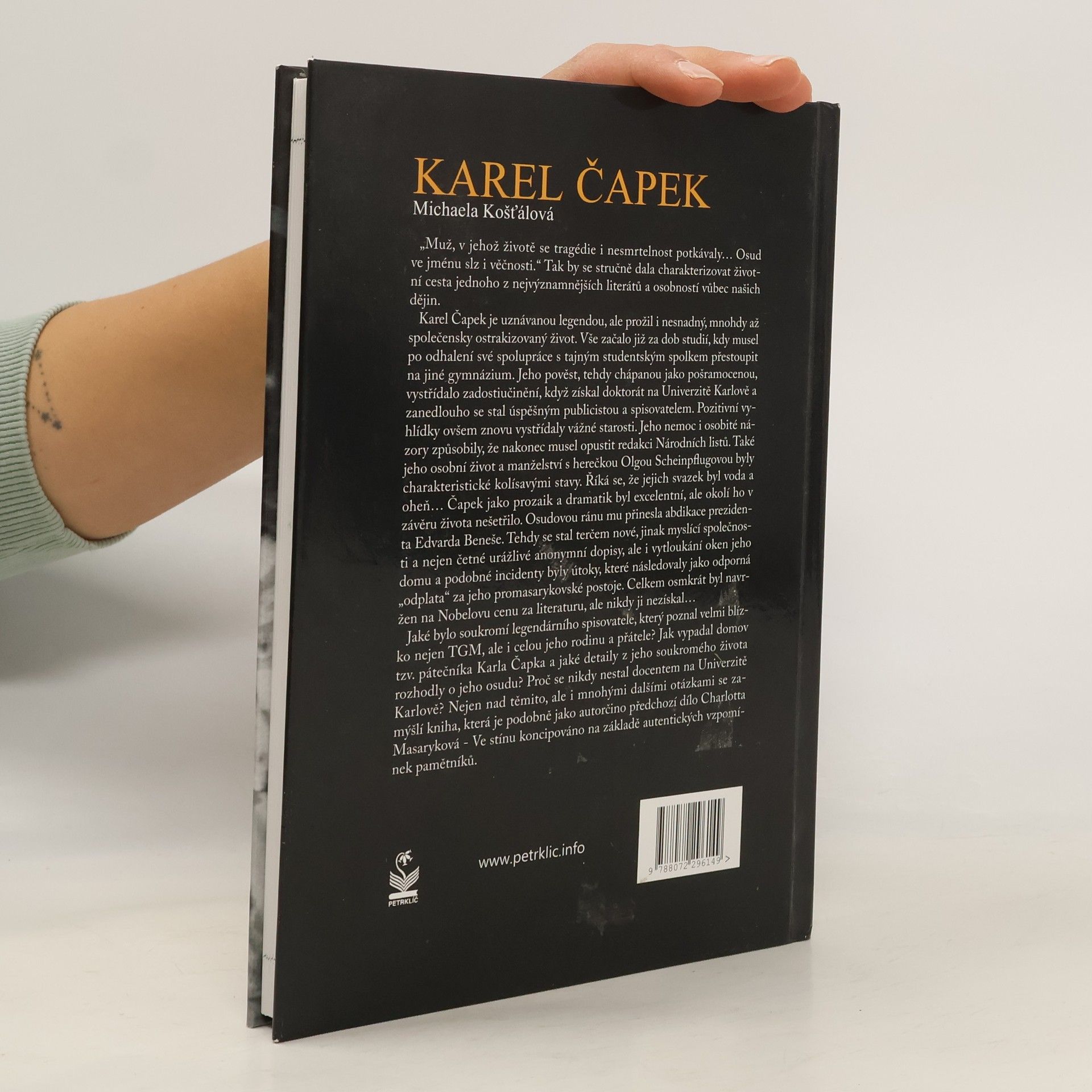 Životní cesta jednoho z nejvýznamnějších literátů našich dějin, Karla Čapka, je plná tragédií i nesmrtelnosti. Jeho začátky byly poznamenány obtížemi, když musel po odhalení spolupráce s tajným spolkem přestoupit na jiné gymnázium. Po získání doktorátu na Univerzitě Karlově se stal úspěšným publicistou a spisovatelem, avšak pozitivní vyhlídky brzy nahradily vážné starosti. Jeho nemoc a osobité názory vedly k odchodu z redakce Národních listů. Osobní život a manželství s herečkou Olgou Scheinpflugovou byly poznamenány kolísavými stavy, přičemž jejich svazek byl přirovnáván k vodě a ohni. Čapek exceloval jako prozaik a dramatik, ale na konci života čelil útokům společnosti, která ho považovala za promařkovského. Po abdikaci prezidenta Beneše se stal terčem urážek, včetně anonymních dopisů a vandalismu. I přes osm nominací na Nobelovu cenu za literaturu ji nikdy nezískal. Kniha se zaměřuje na jeho soukromí, vztahy s TGM a jeho rodinou, a na detaily, které ovlivnily jeho osud, včetně důvodů, proč se nikdy nestal docentem na Univerzitě Karlově. Autorka vychází z autentických vzpomínek pamětníků, podobně jako v předchozím díle o Charlottě Masarykové.